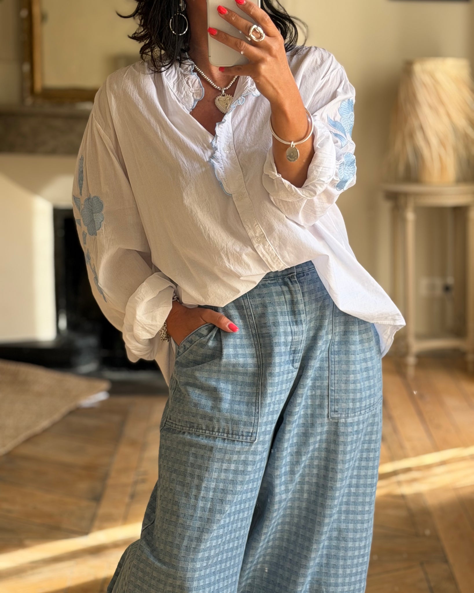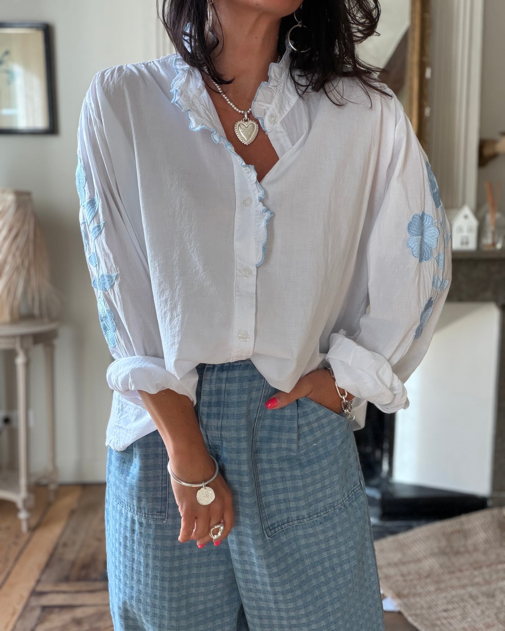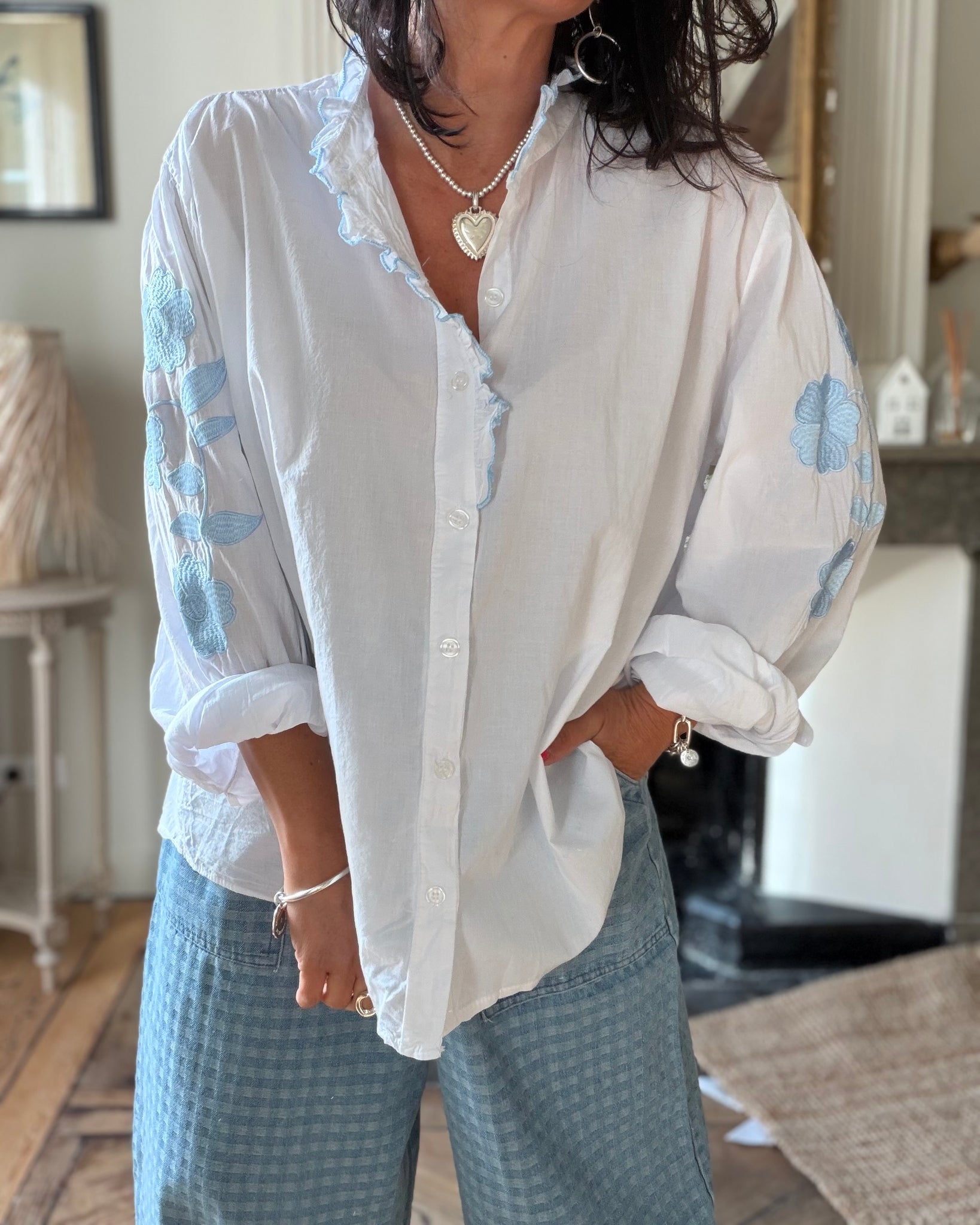 Chemise ample, blanche, détails broderies sur la manche