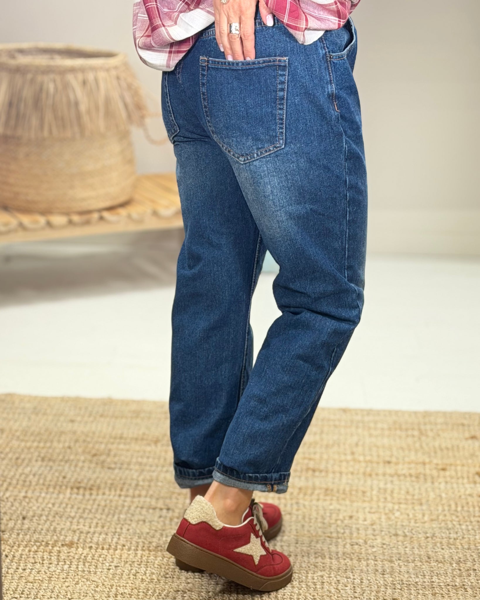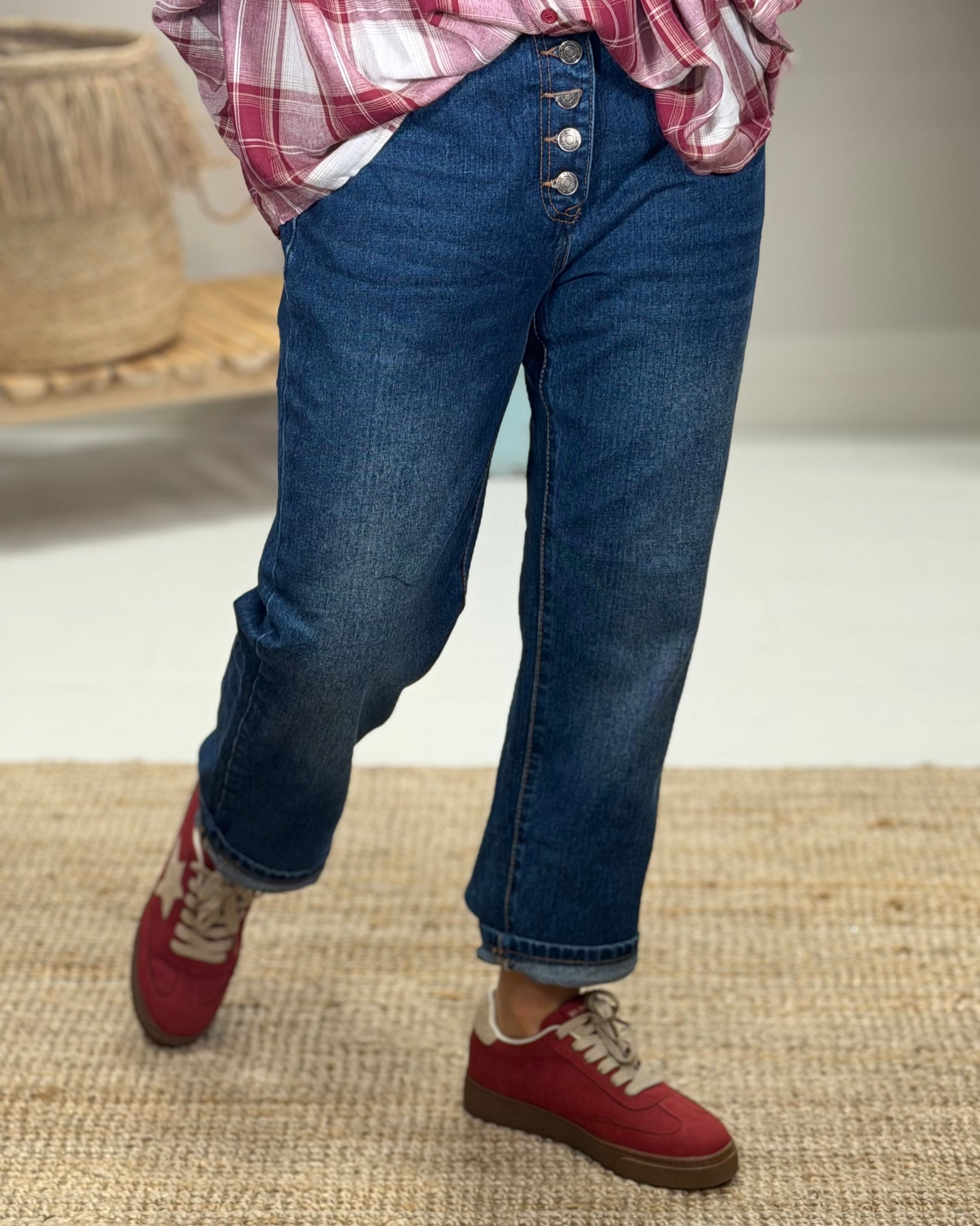 Jean bleu, coupe relax, fermeture boutons, poches