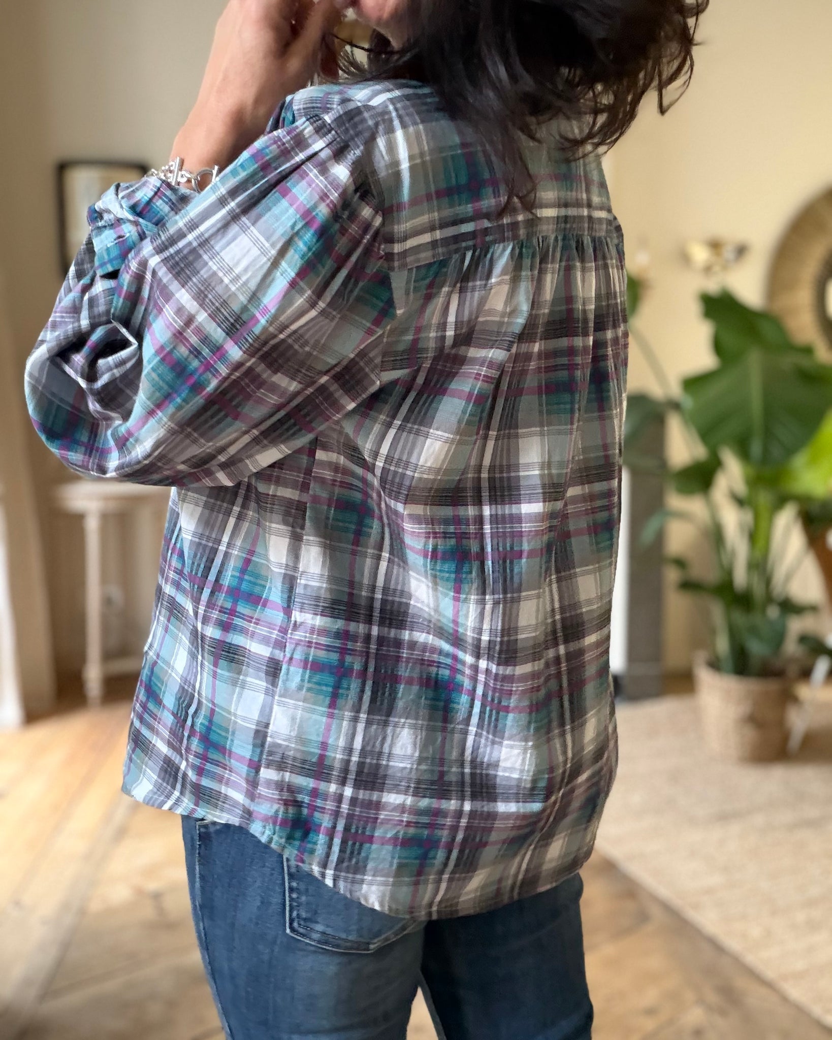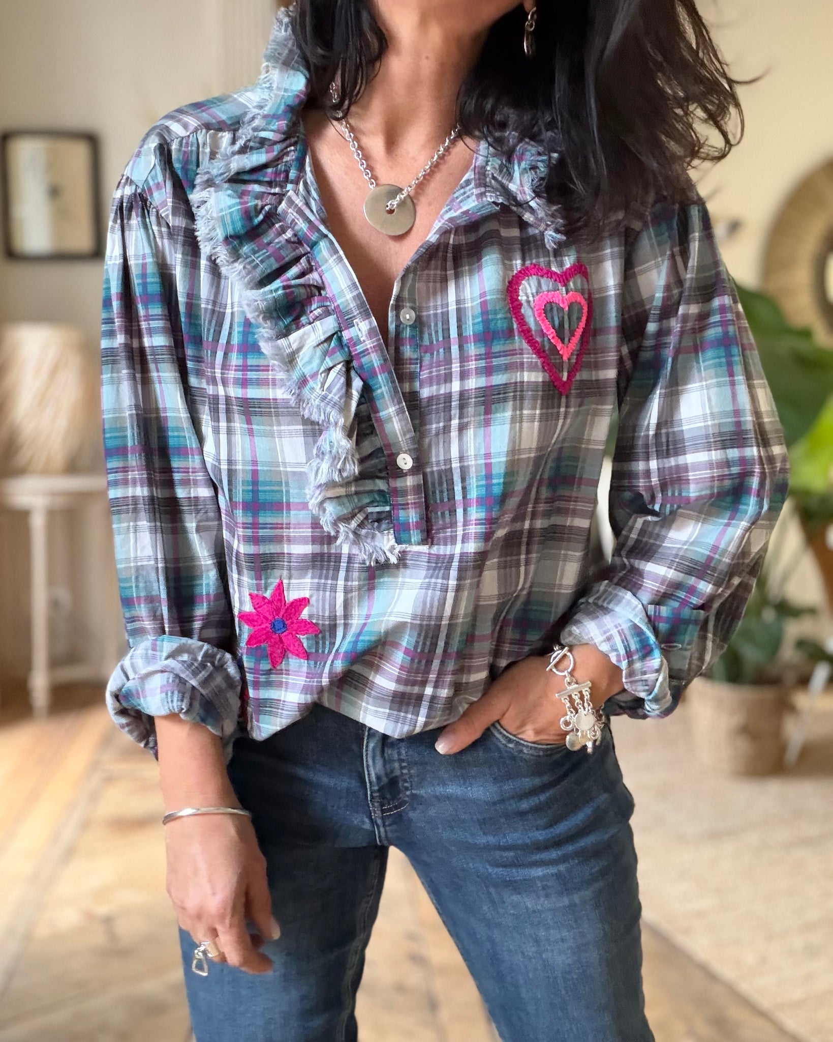 Blouse ample à carreaux, brodée