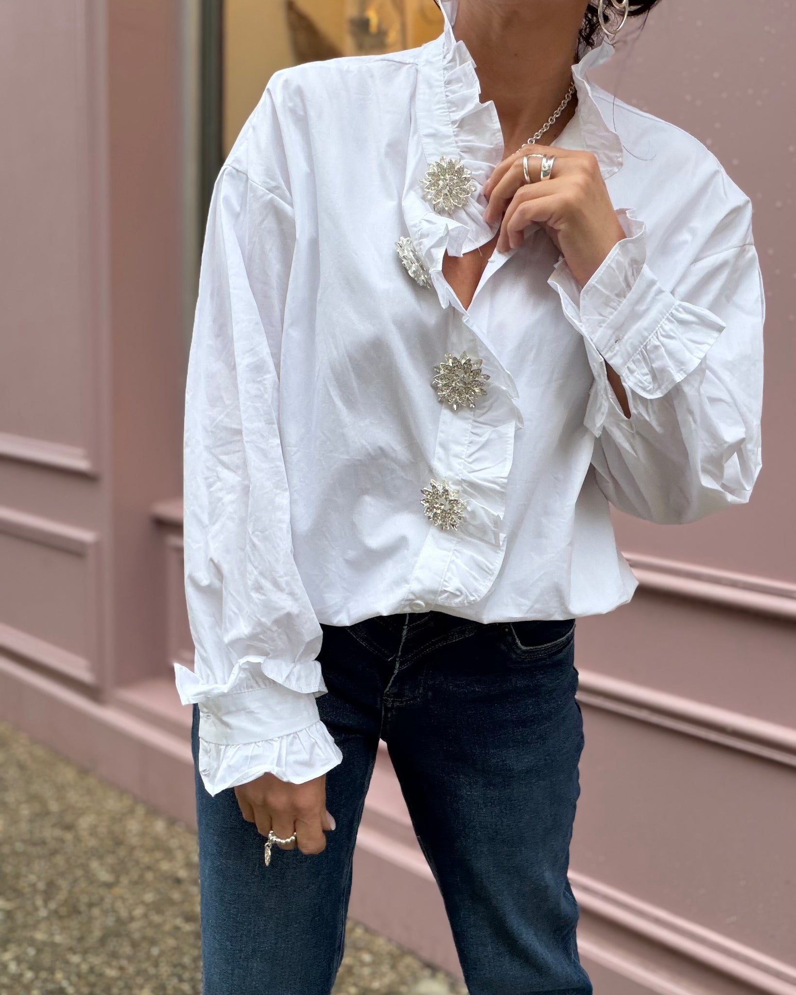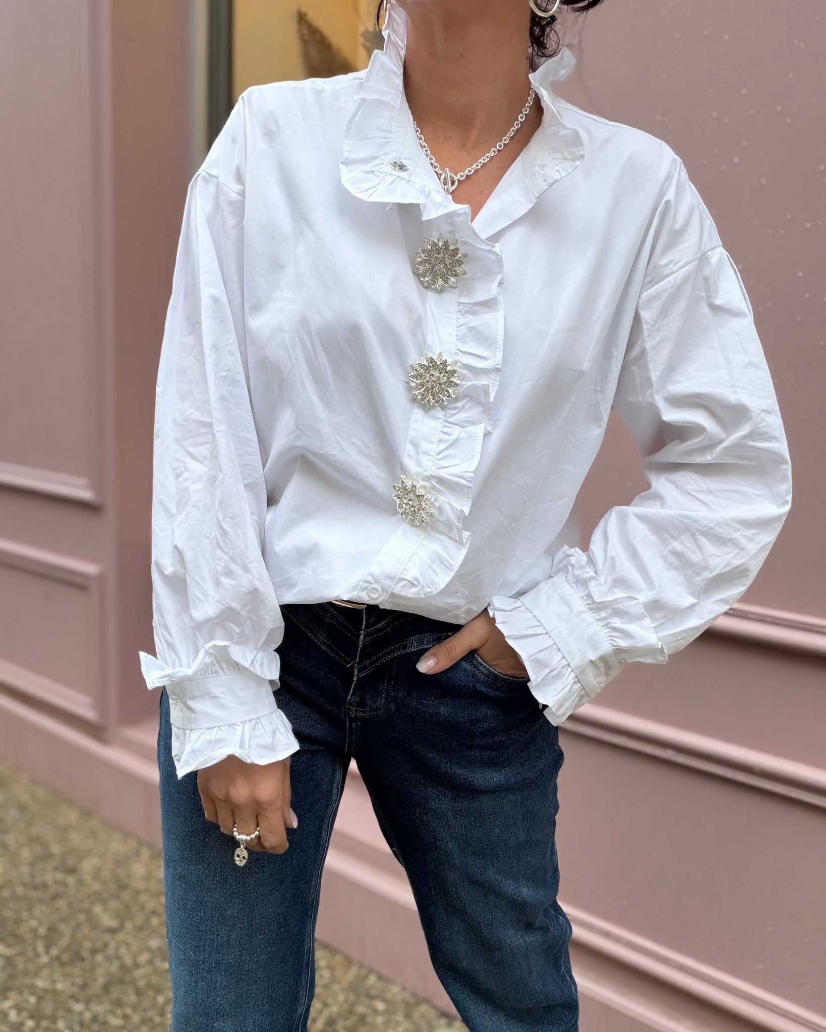 Chemise blanche, ample, détails froufrous, fermeture pressions avec gros boutons strass