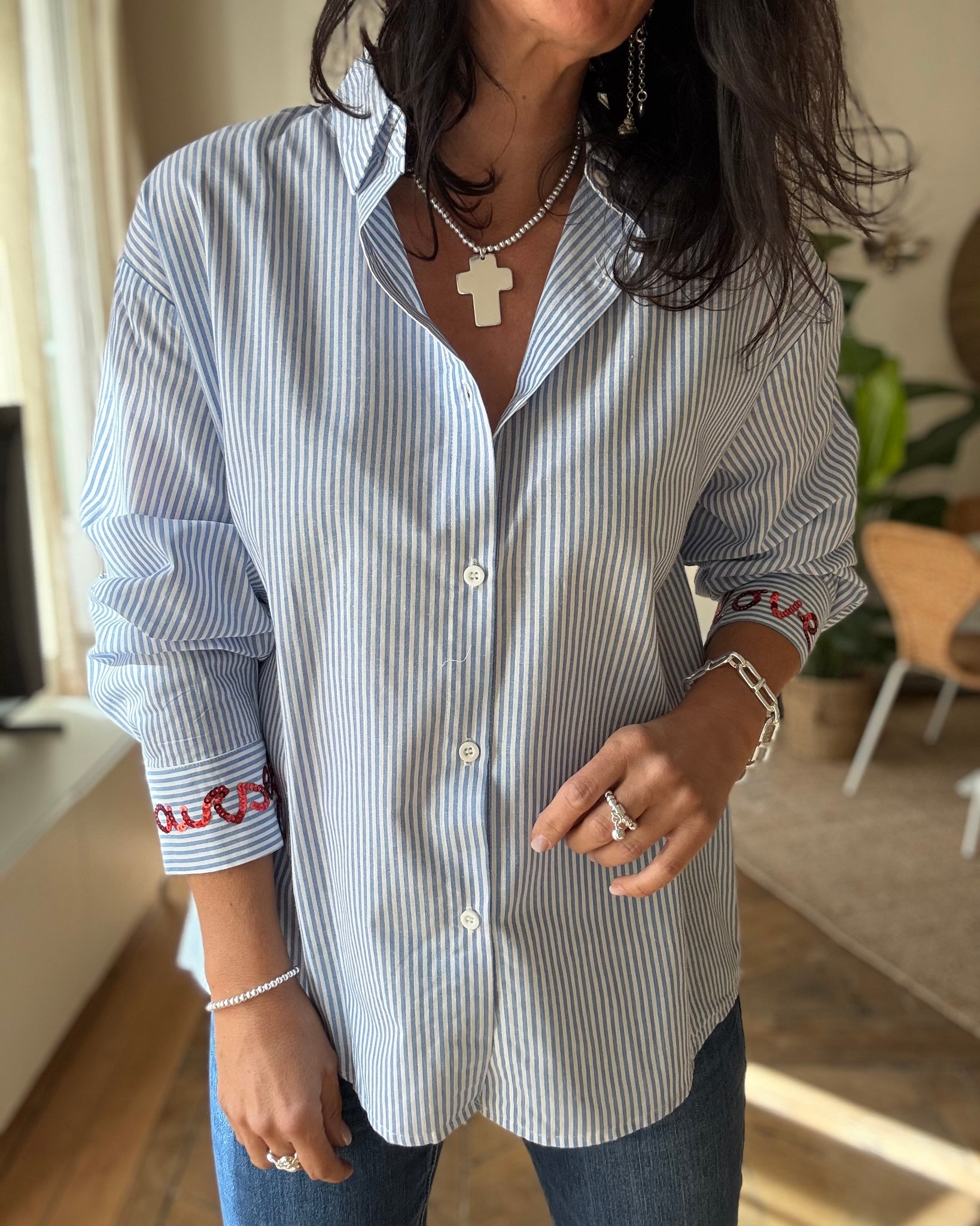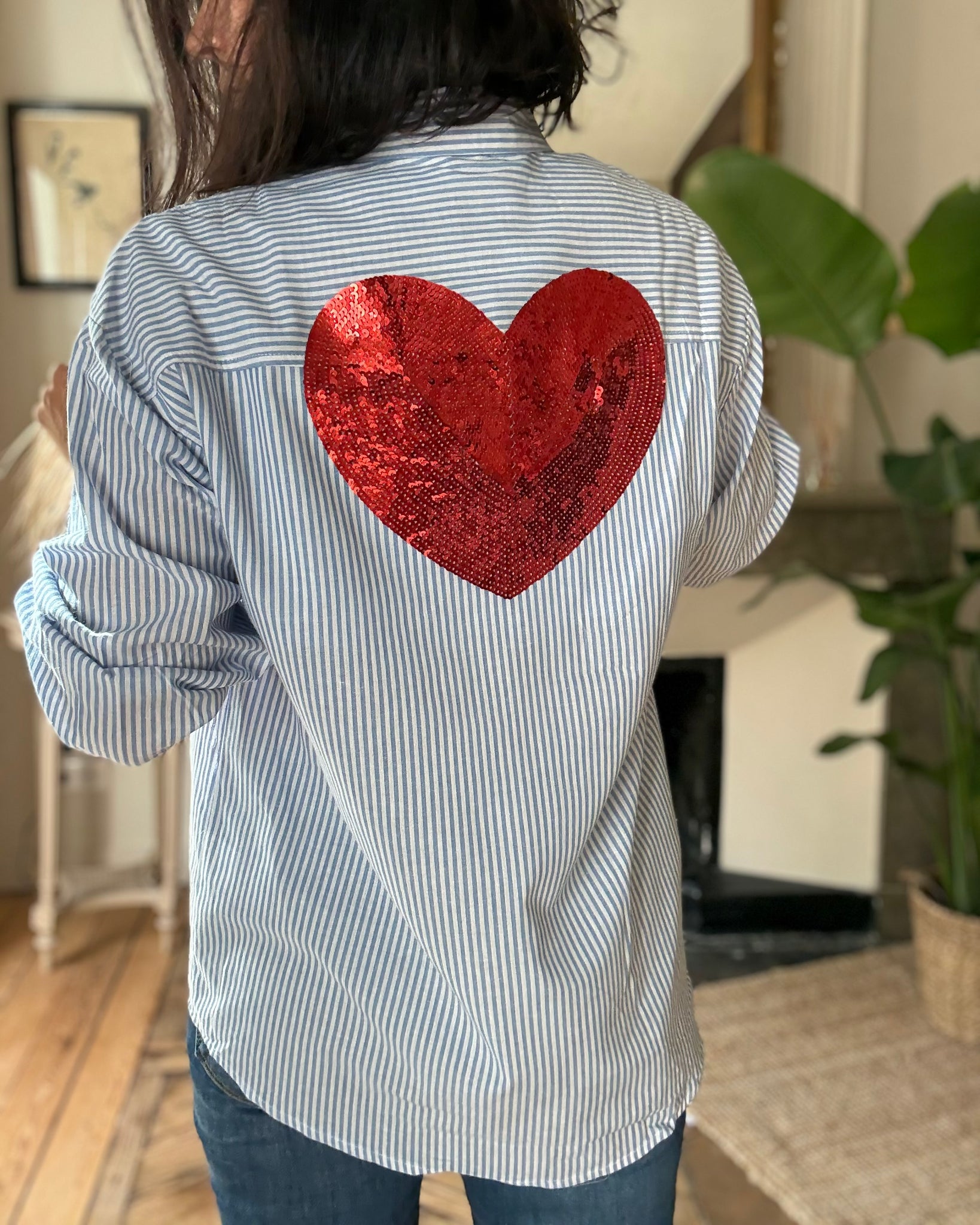 Chemise à fines rayures, détails sequins aux manches et cœurs dans le dos