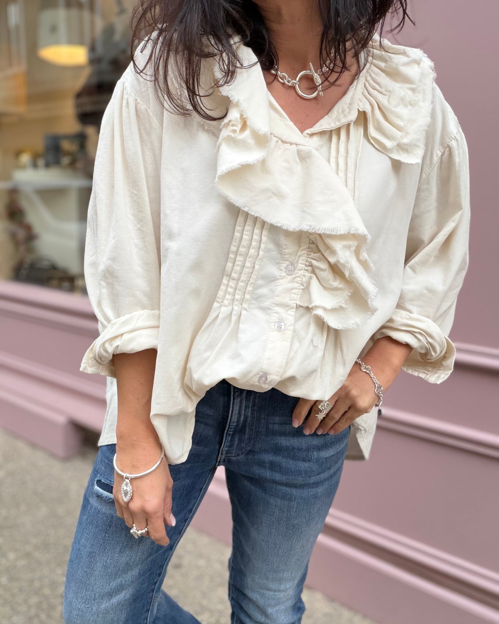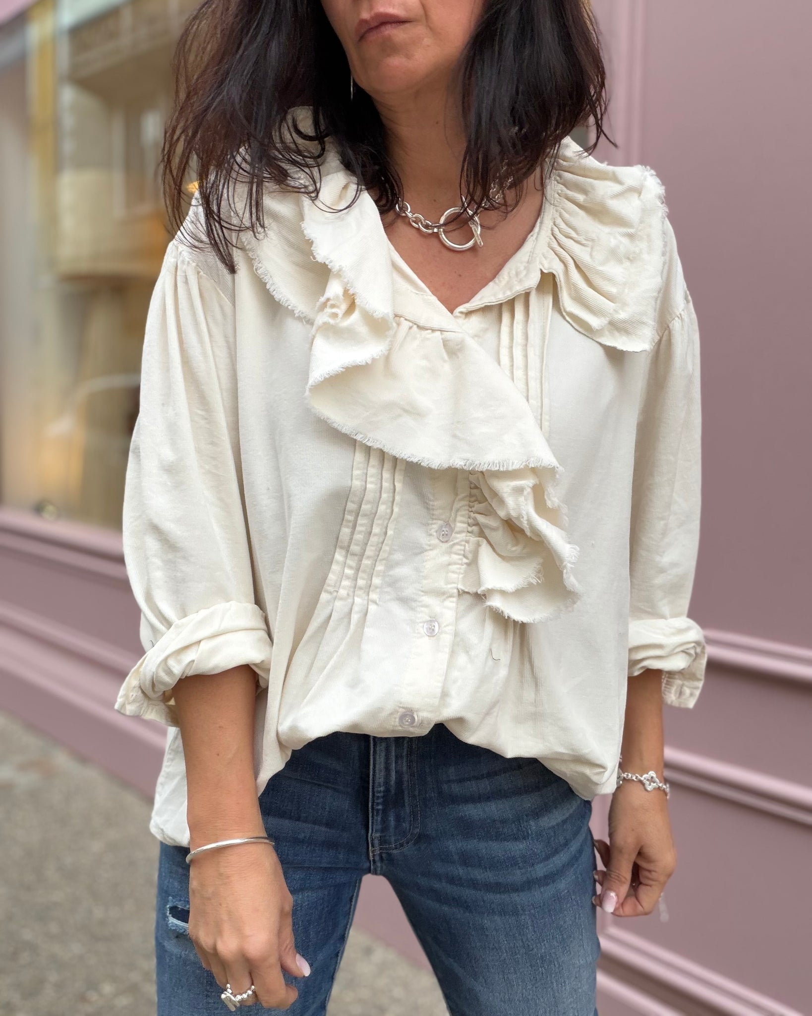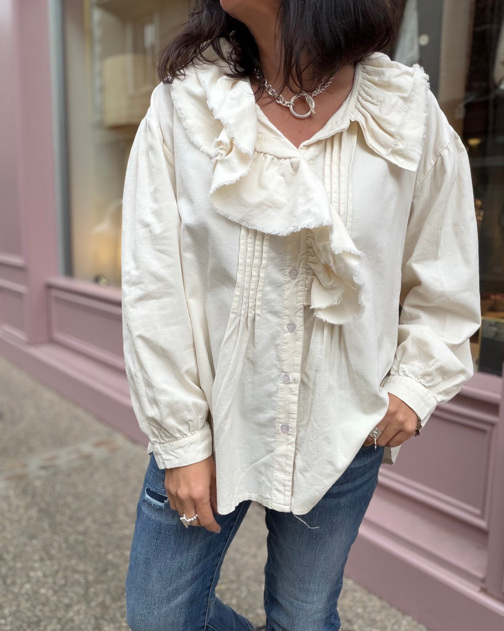 Chemise ivoire en velours, détails froufrous