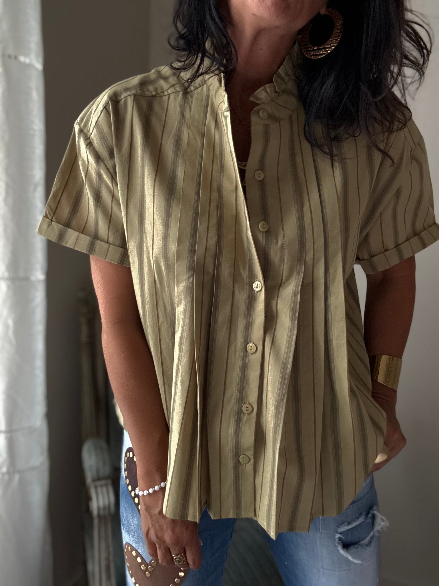 Chemise vert tilleul à rayures, col froufrous