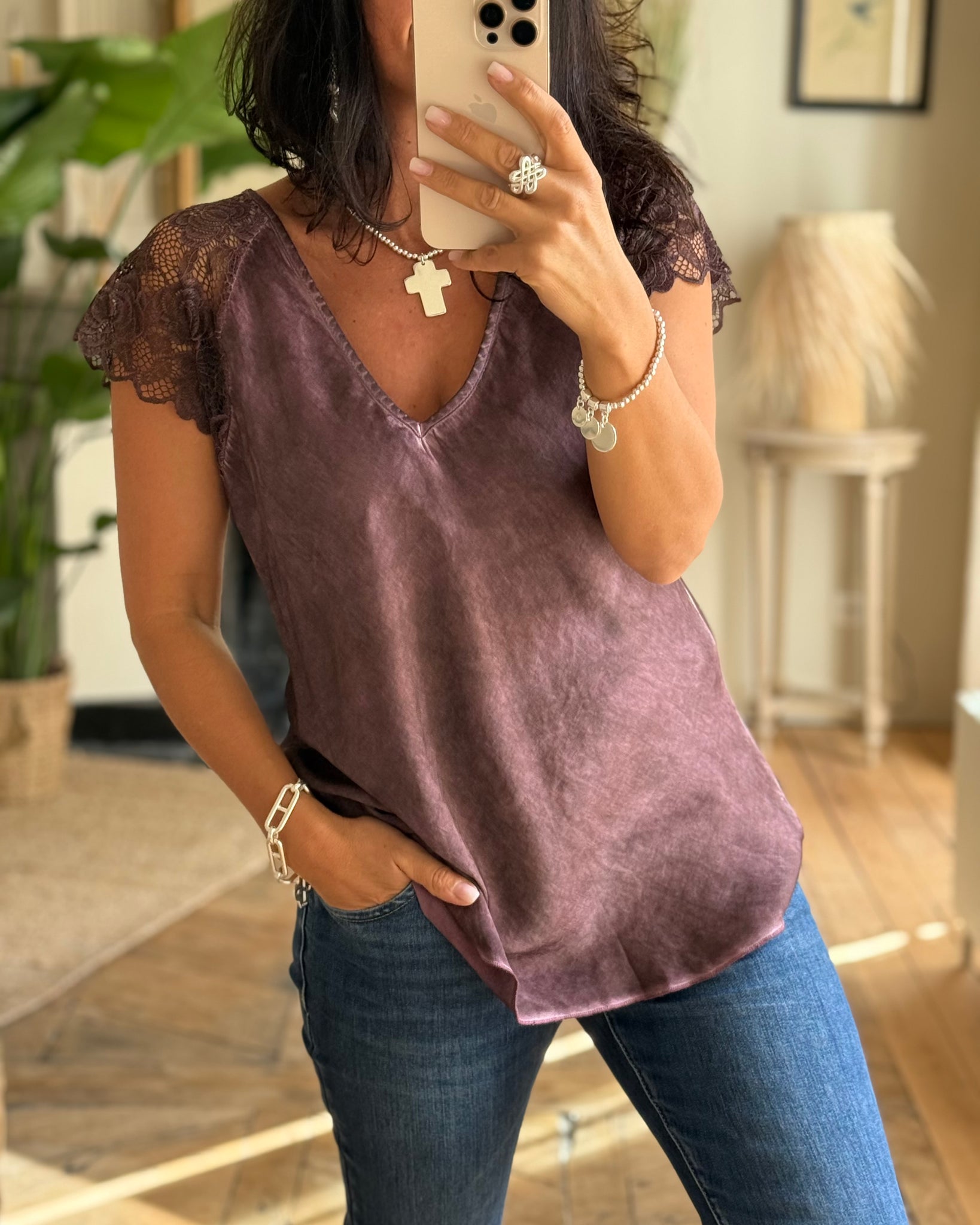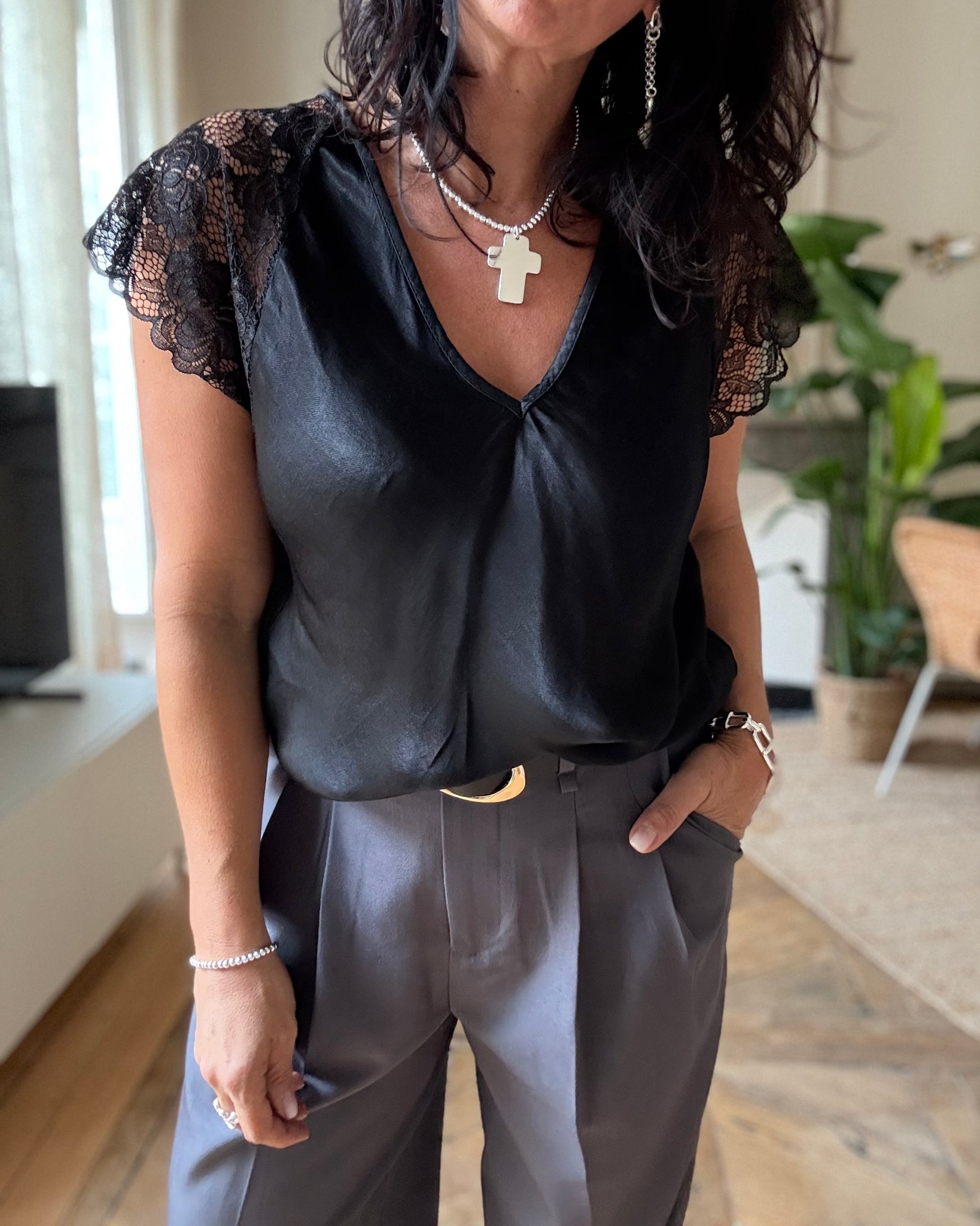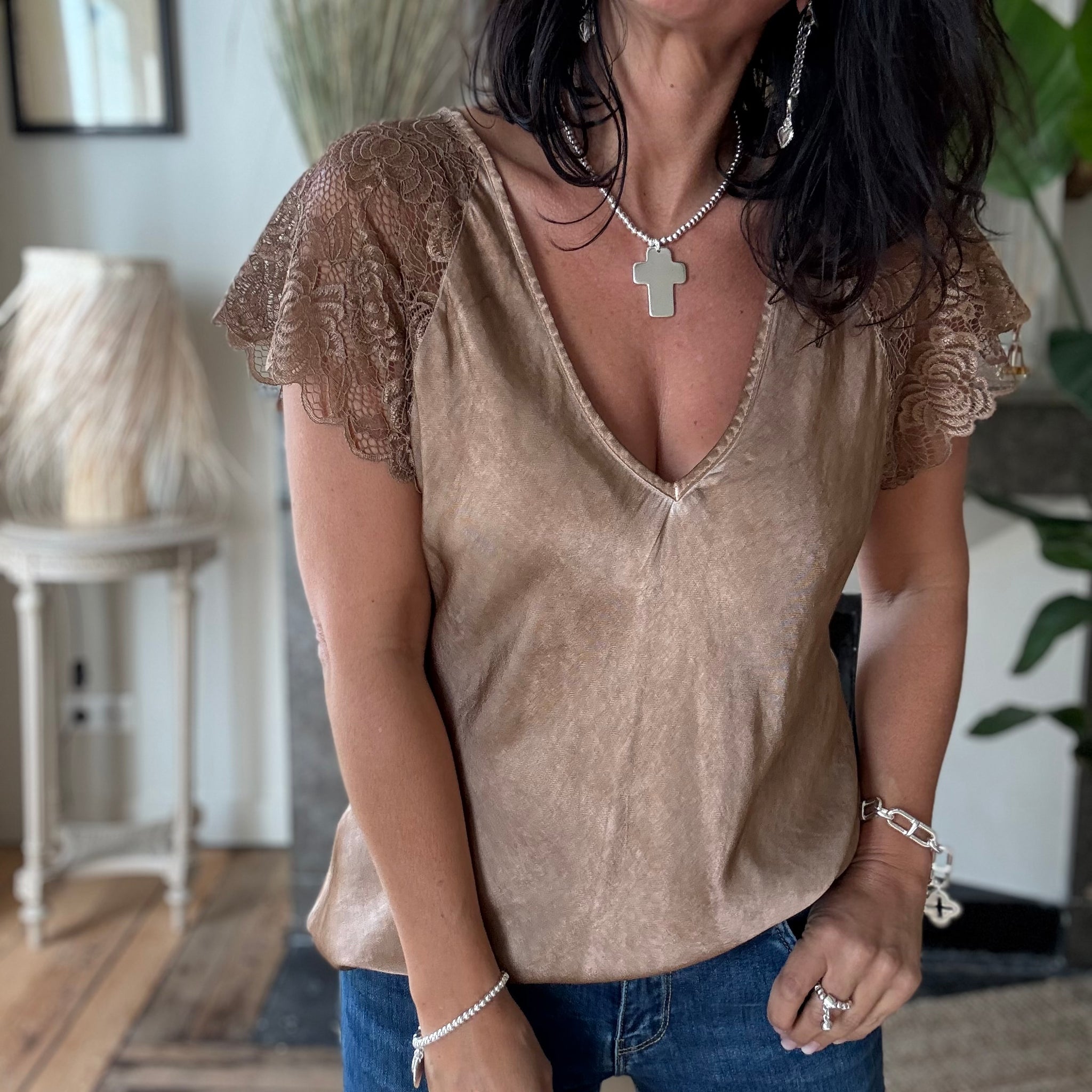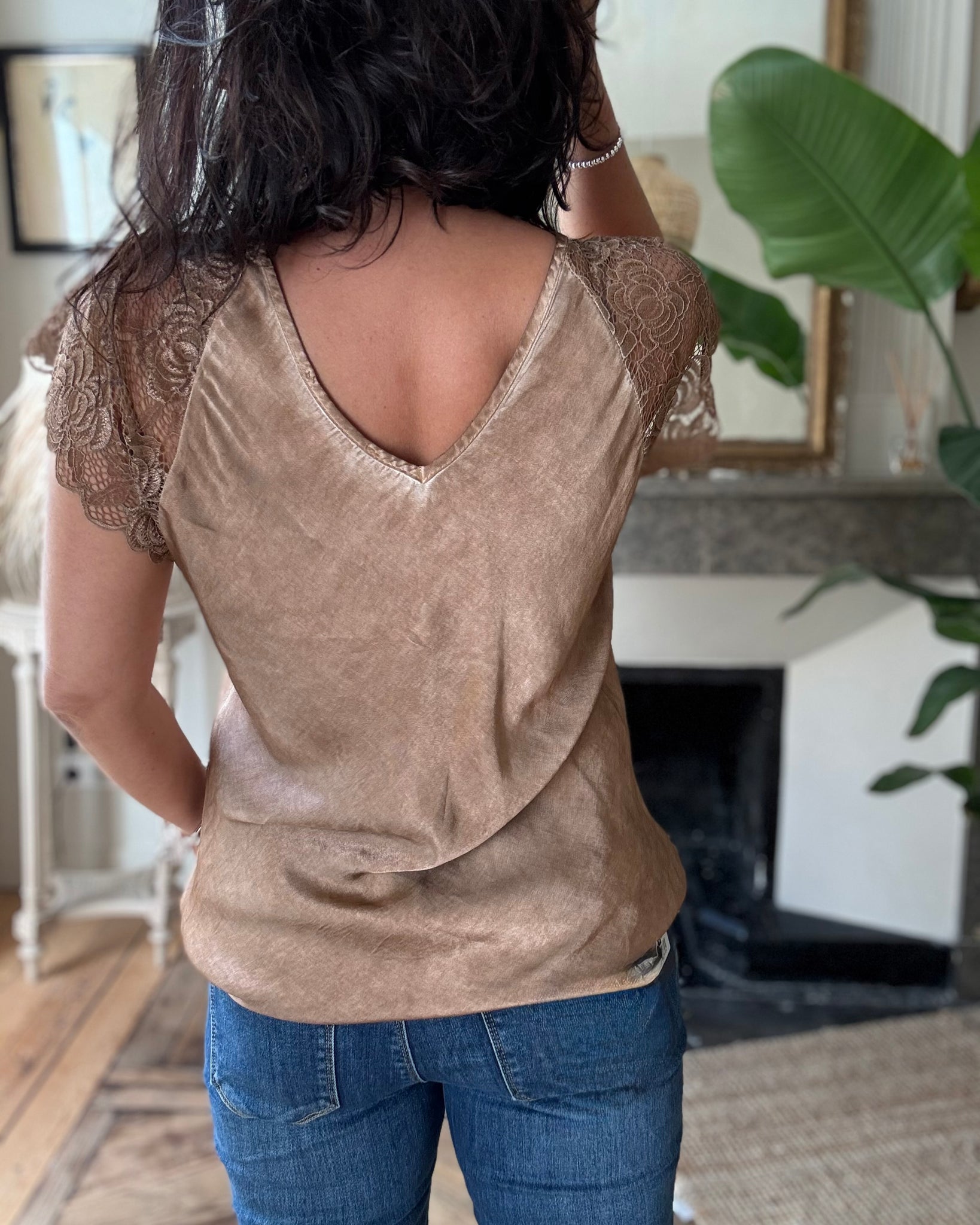 Top légèrement satiné à empiècement dentelle