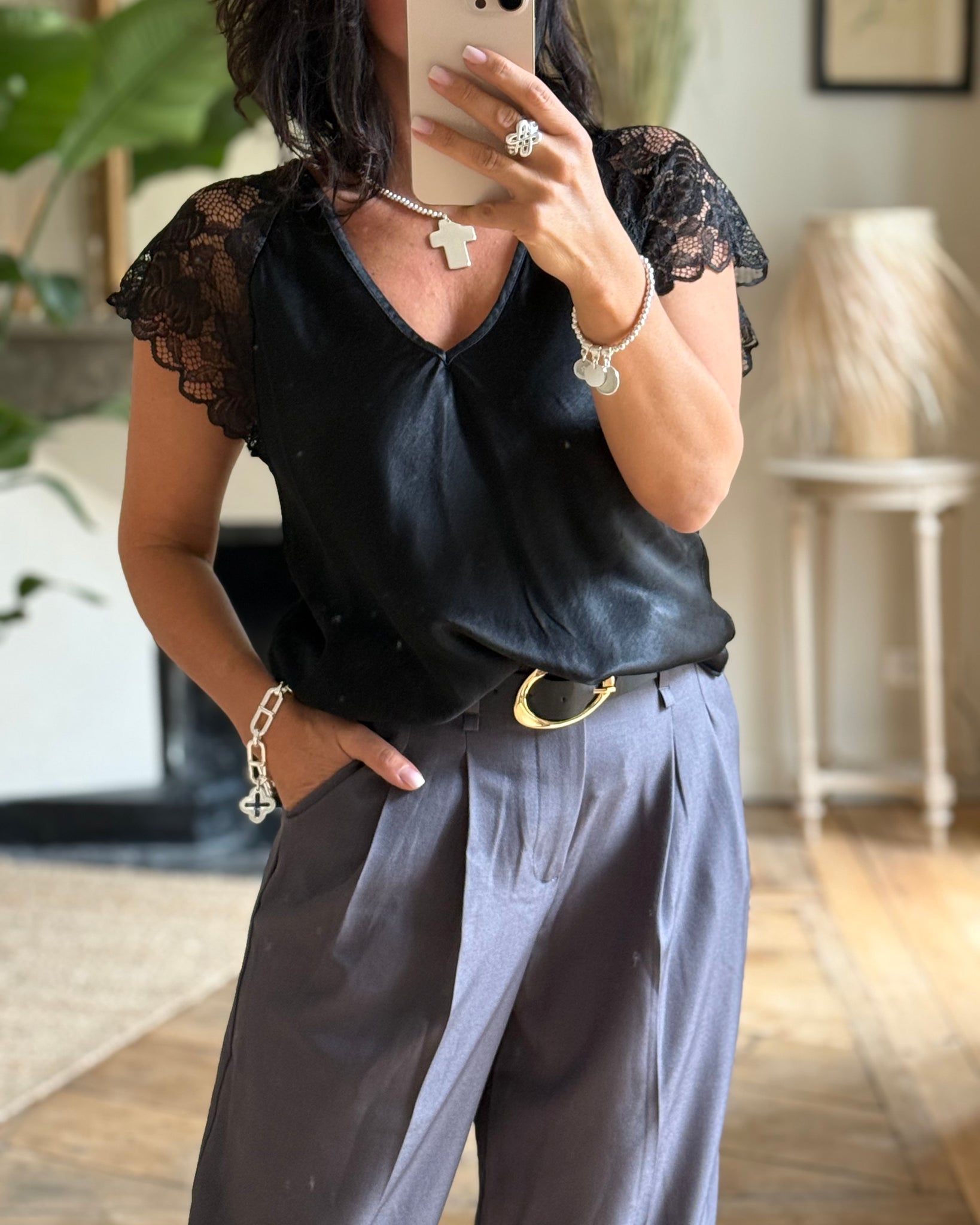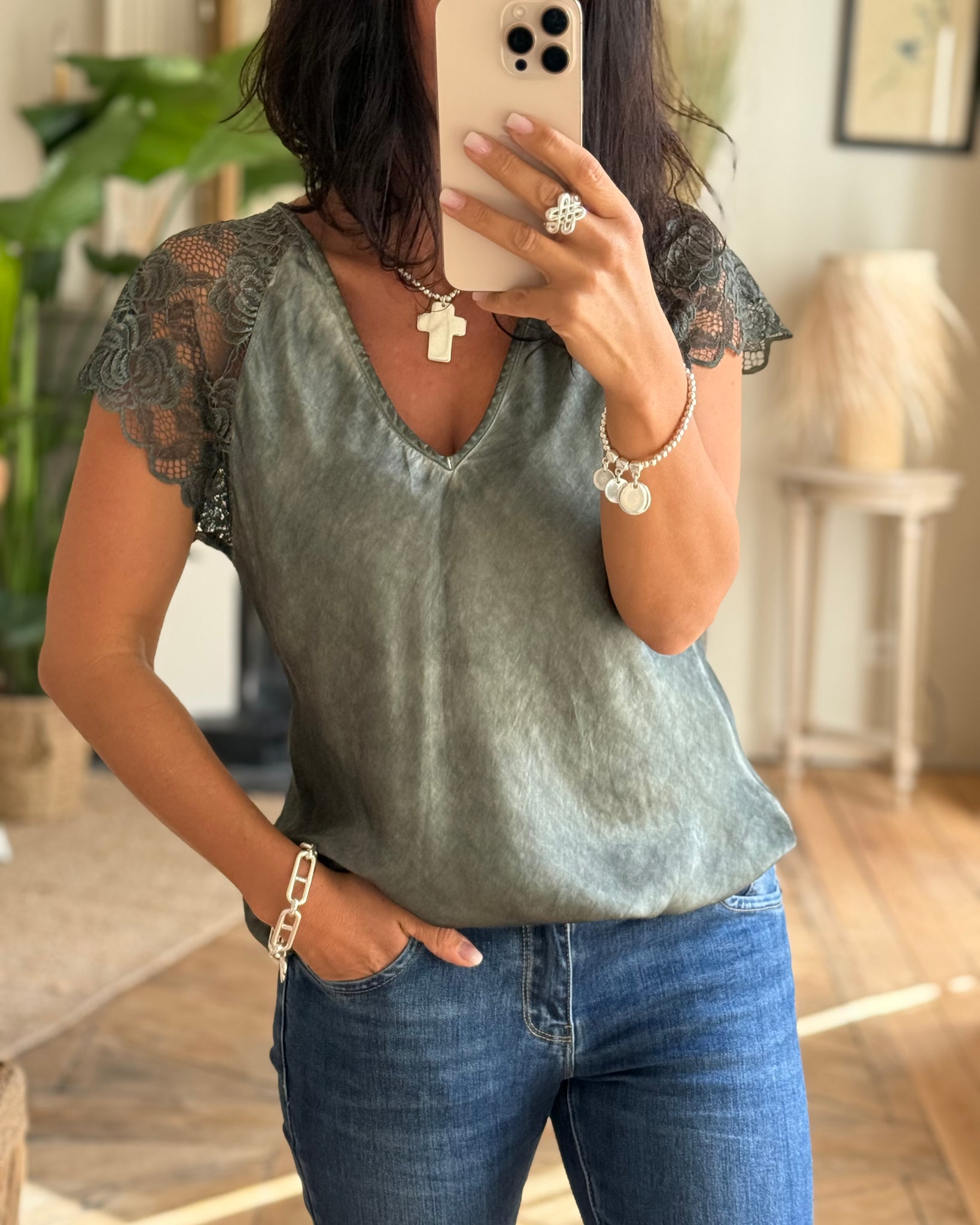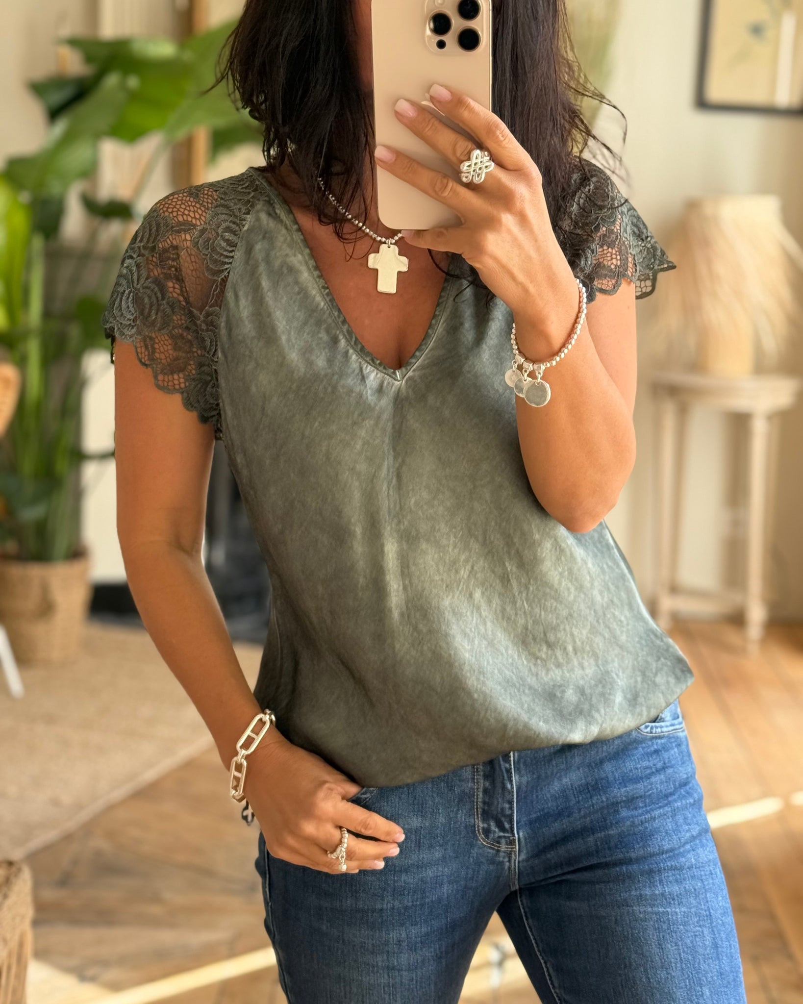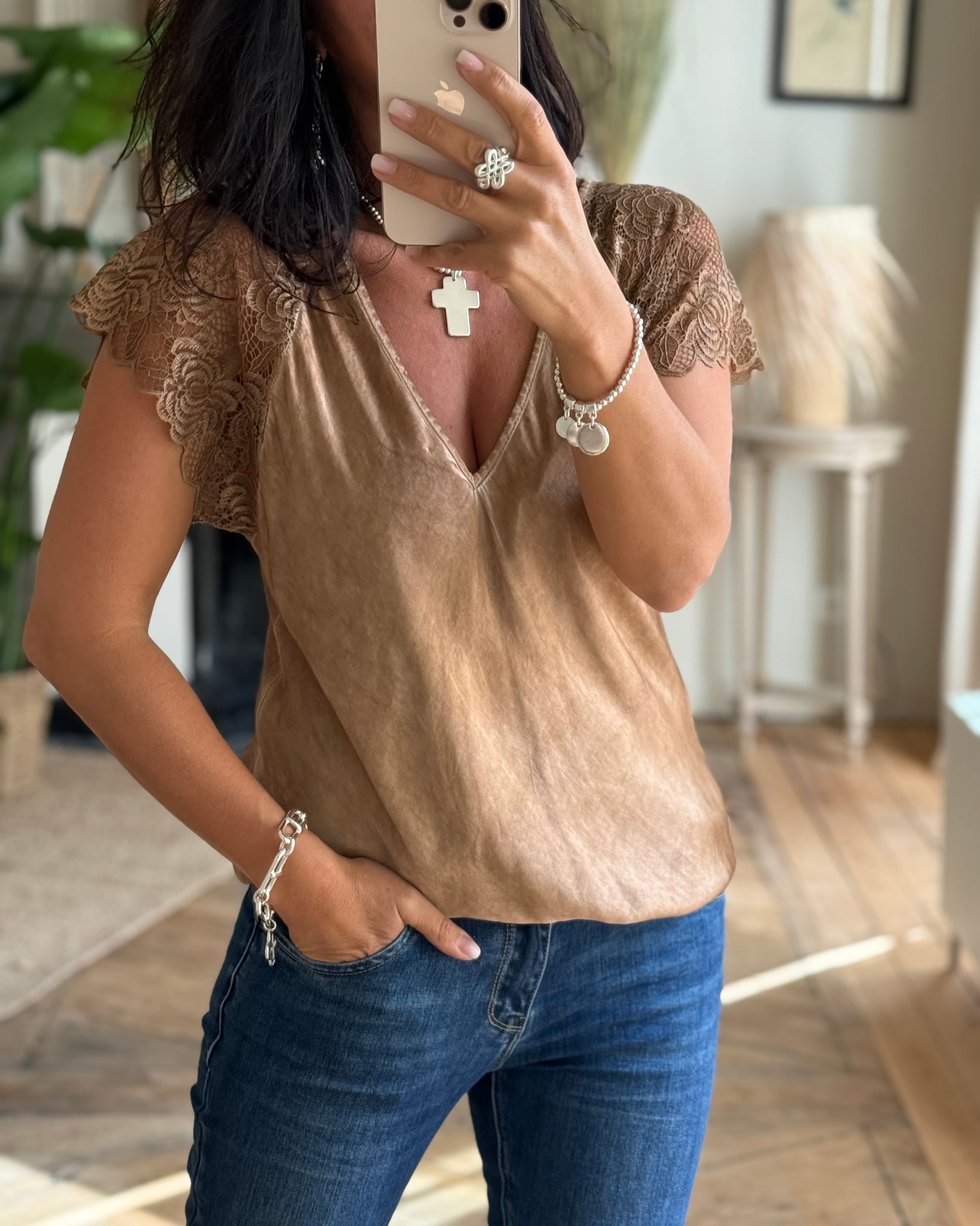 Top légèrement satiné à empiècement dentelle