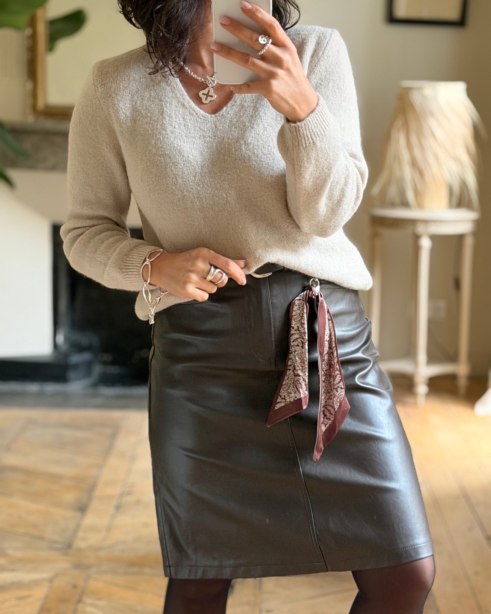 Jupe marron en simili, fermeture zip et bouton avec ceinture