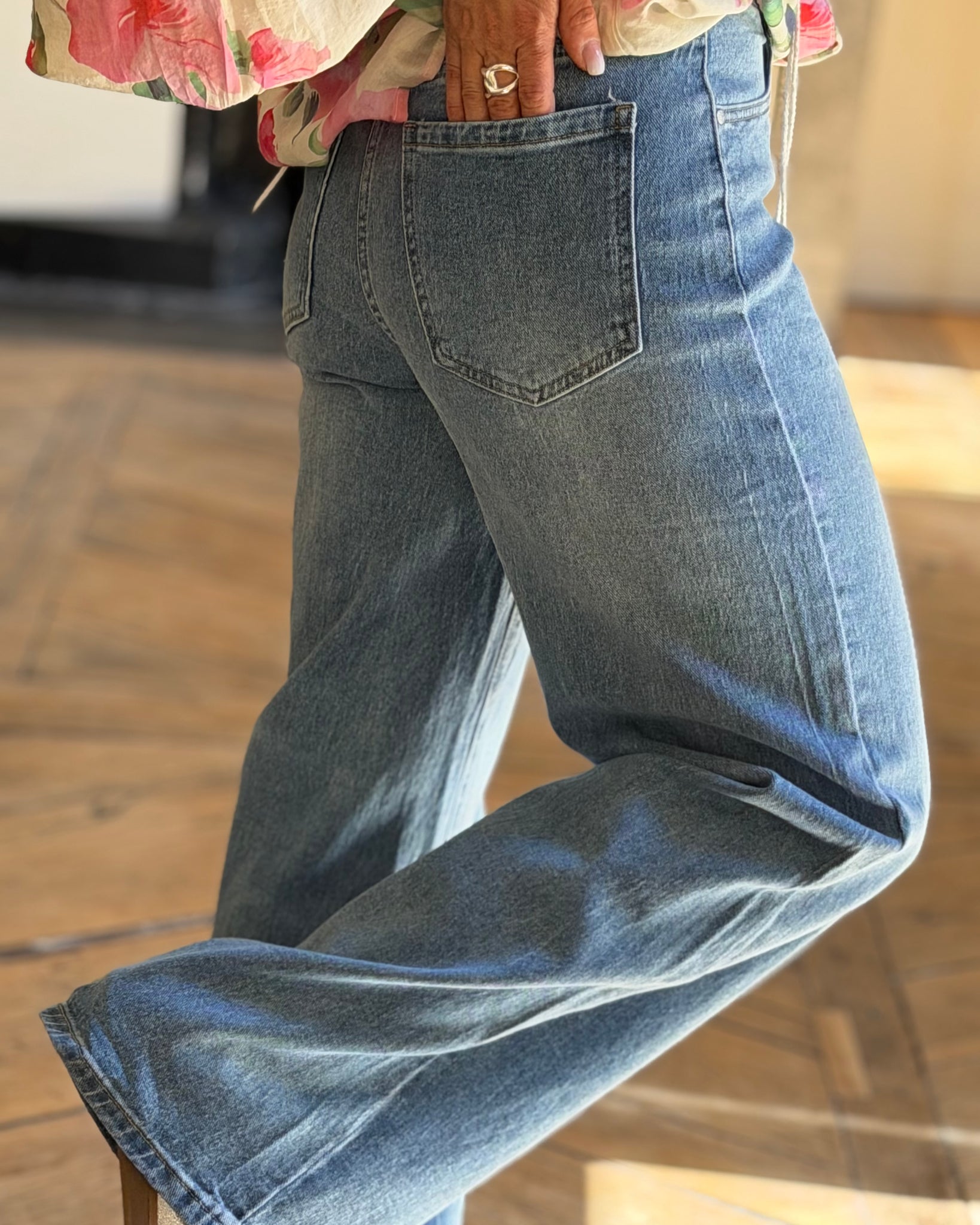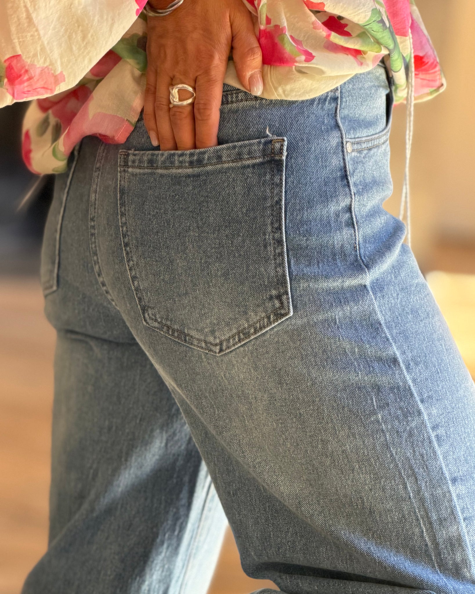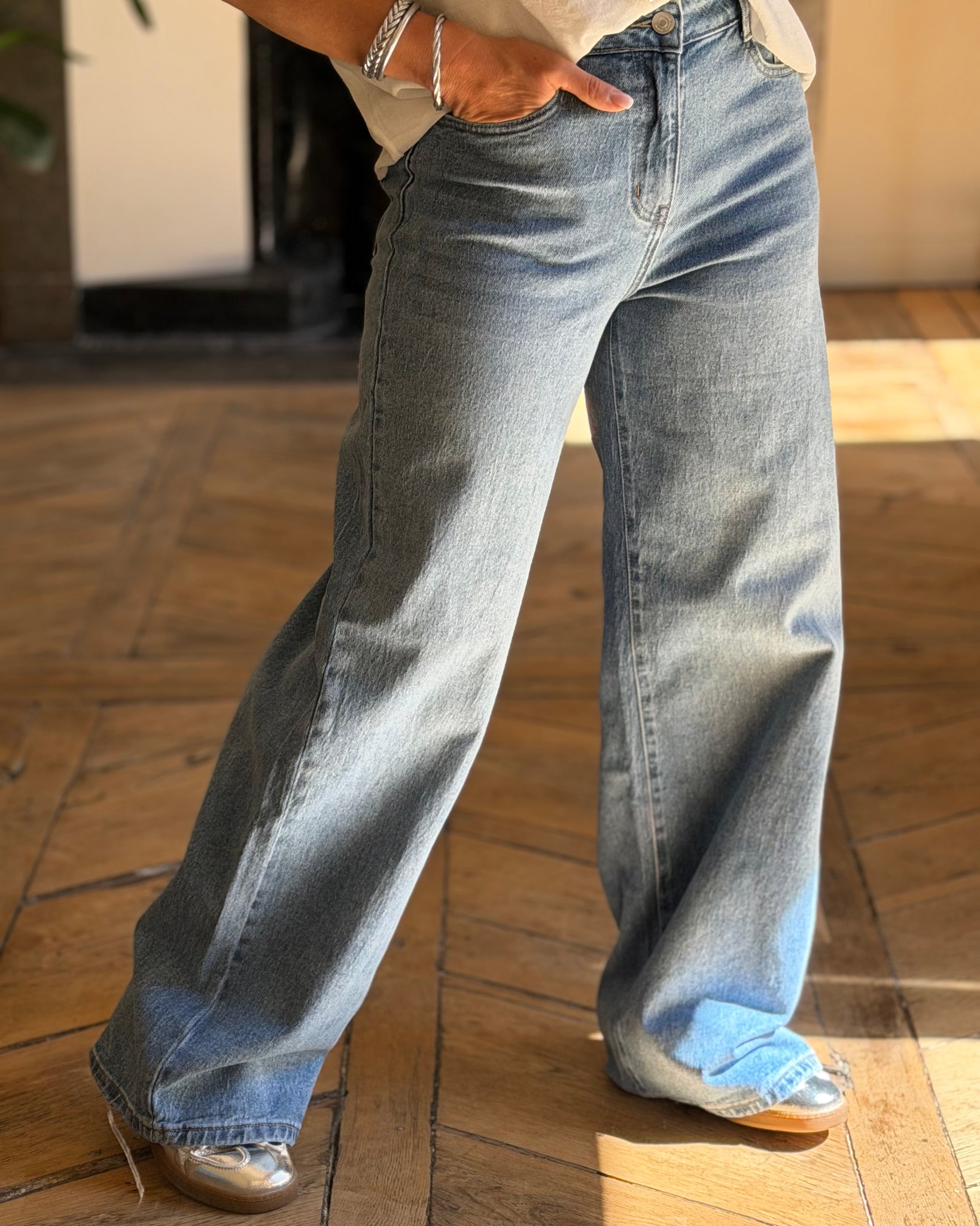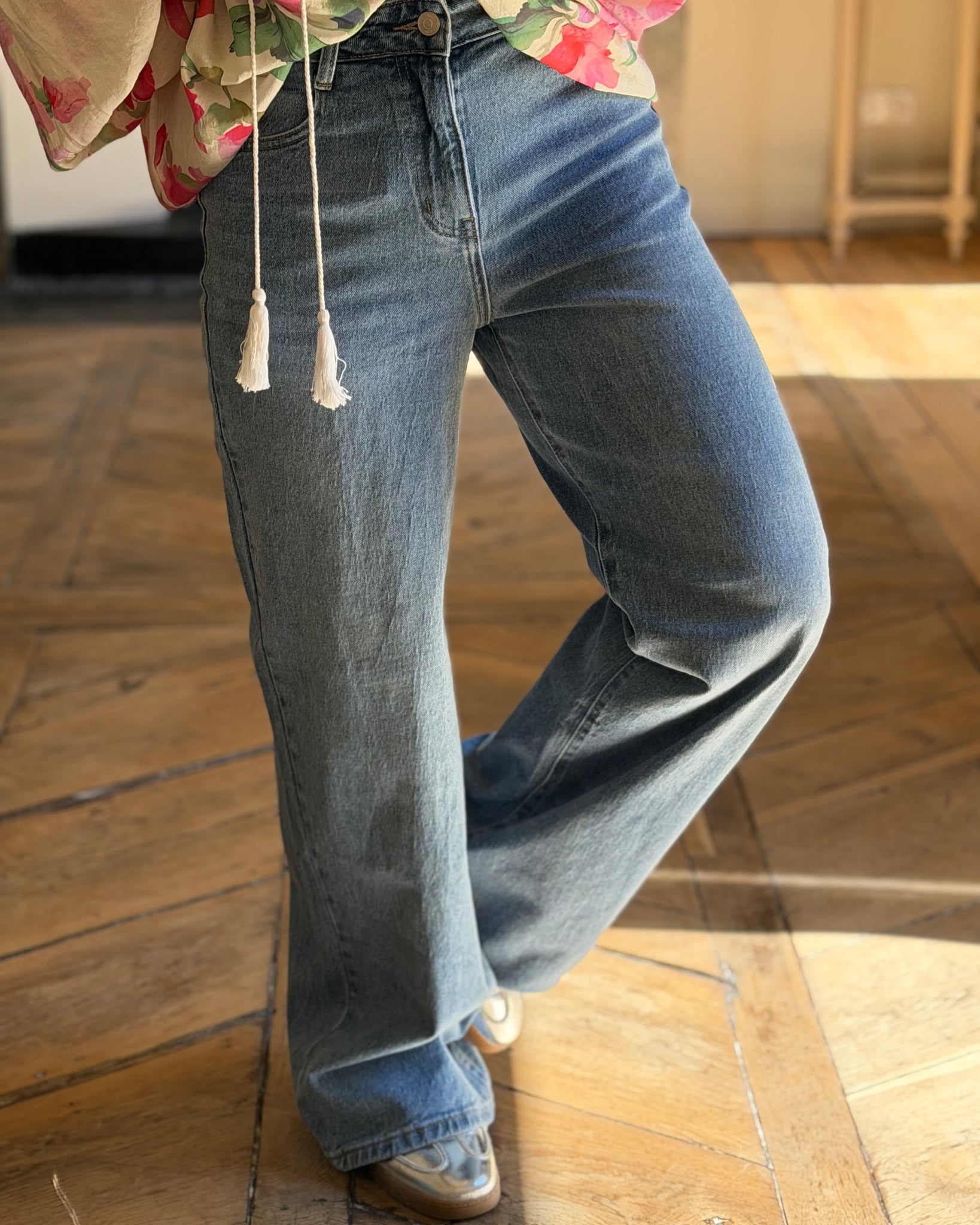 Jean large, fermeture zip et bouton, taille enveloppante, confortable