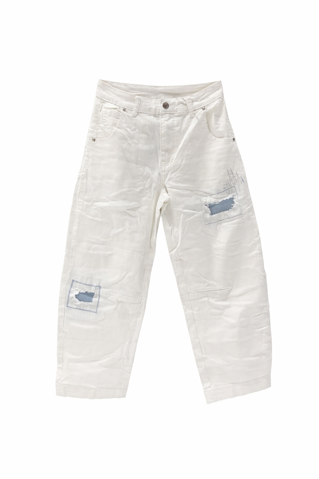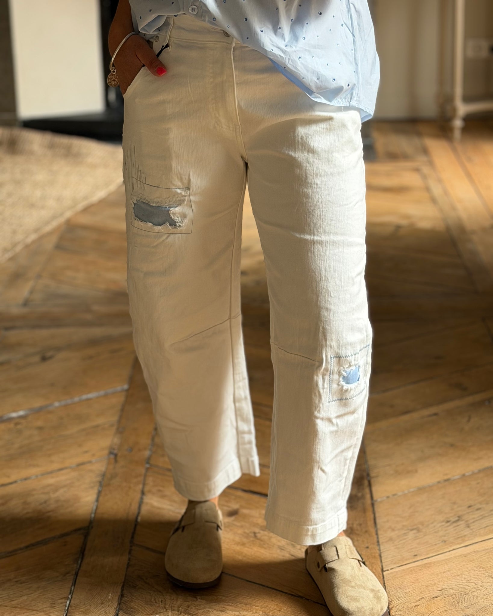 Pantalon blanc à patchs, fermeture zip et bouton, poches
