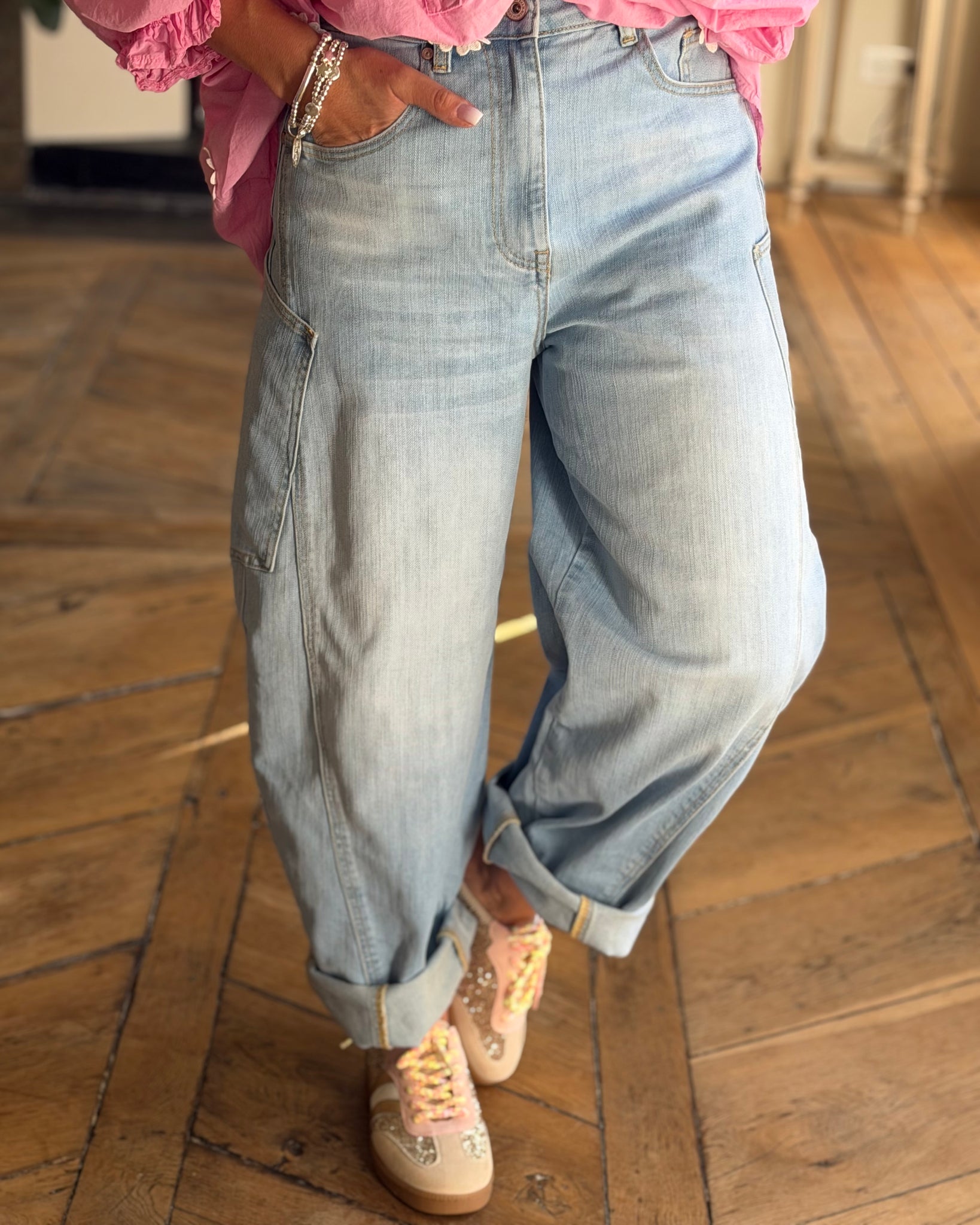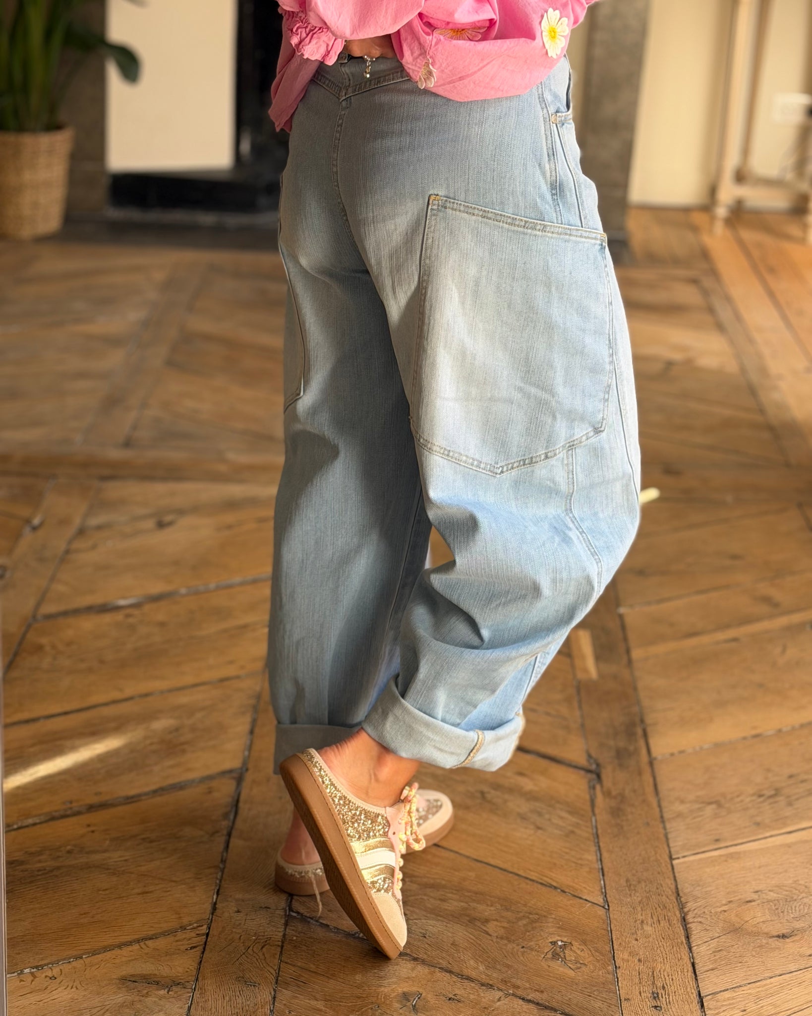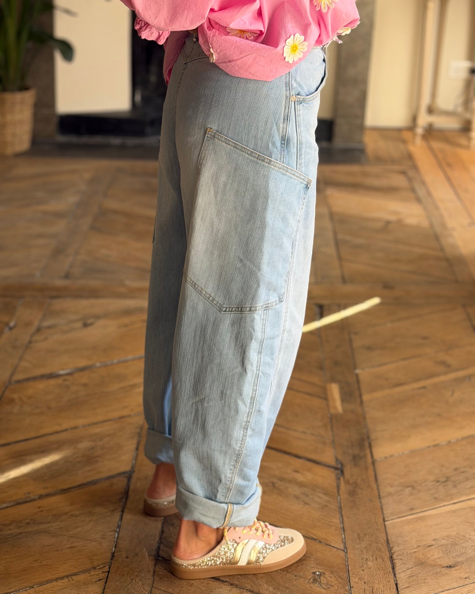 Jean bleu clair, coupe ballon, grandes poches