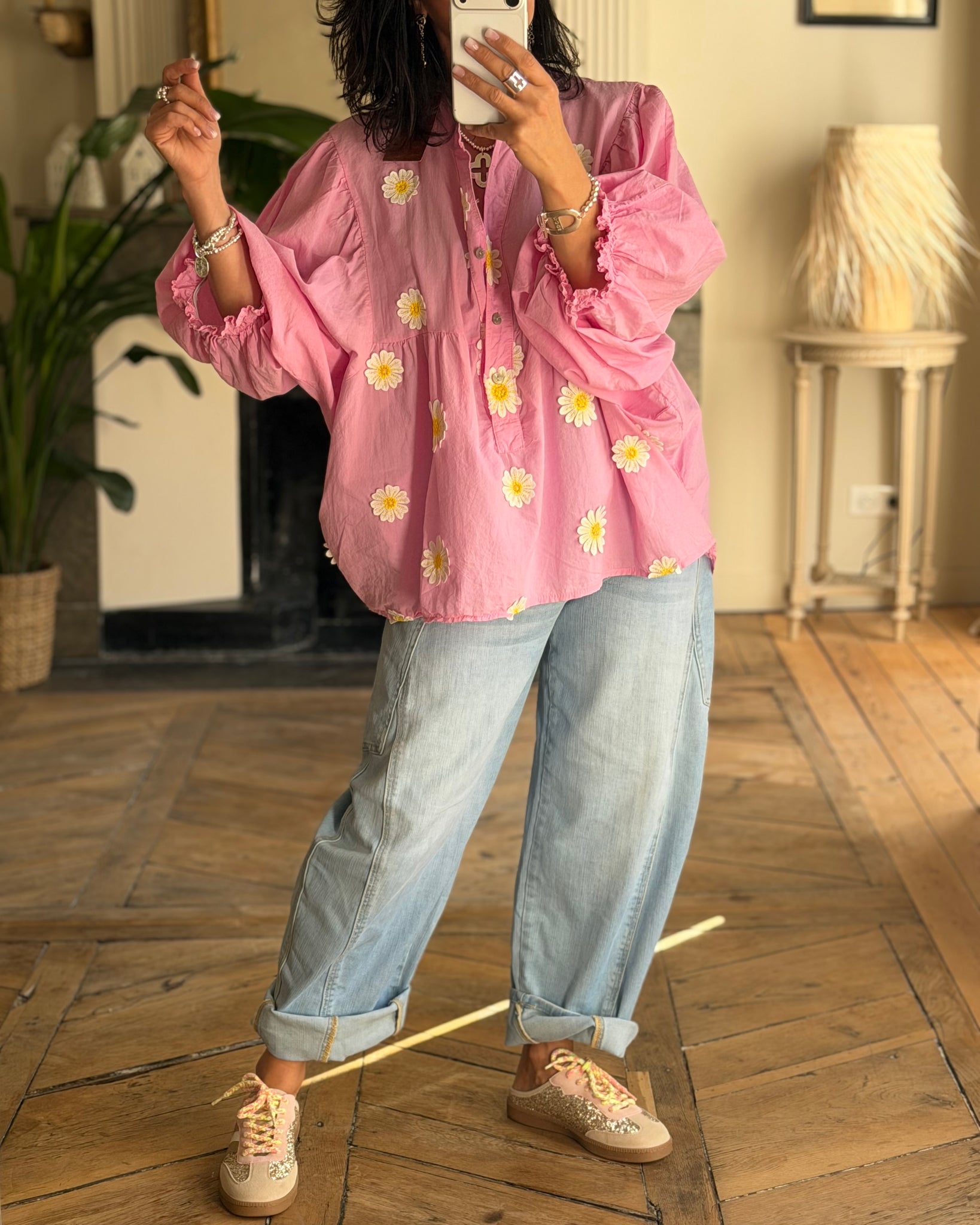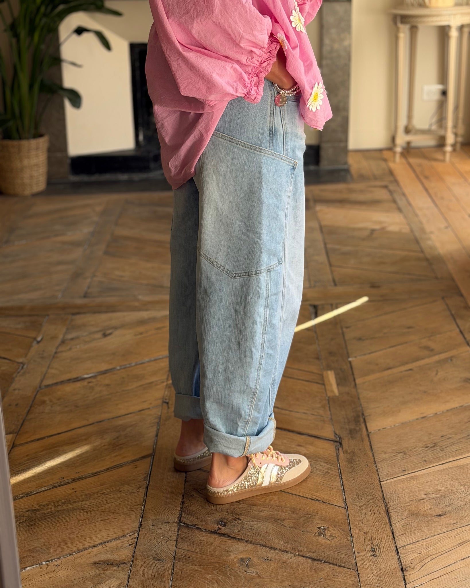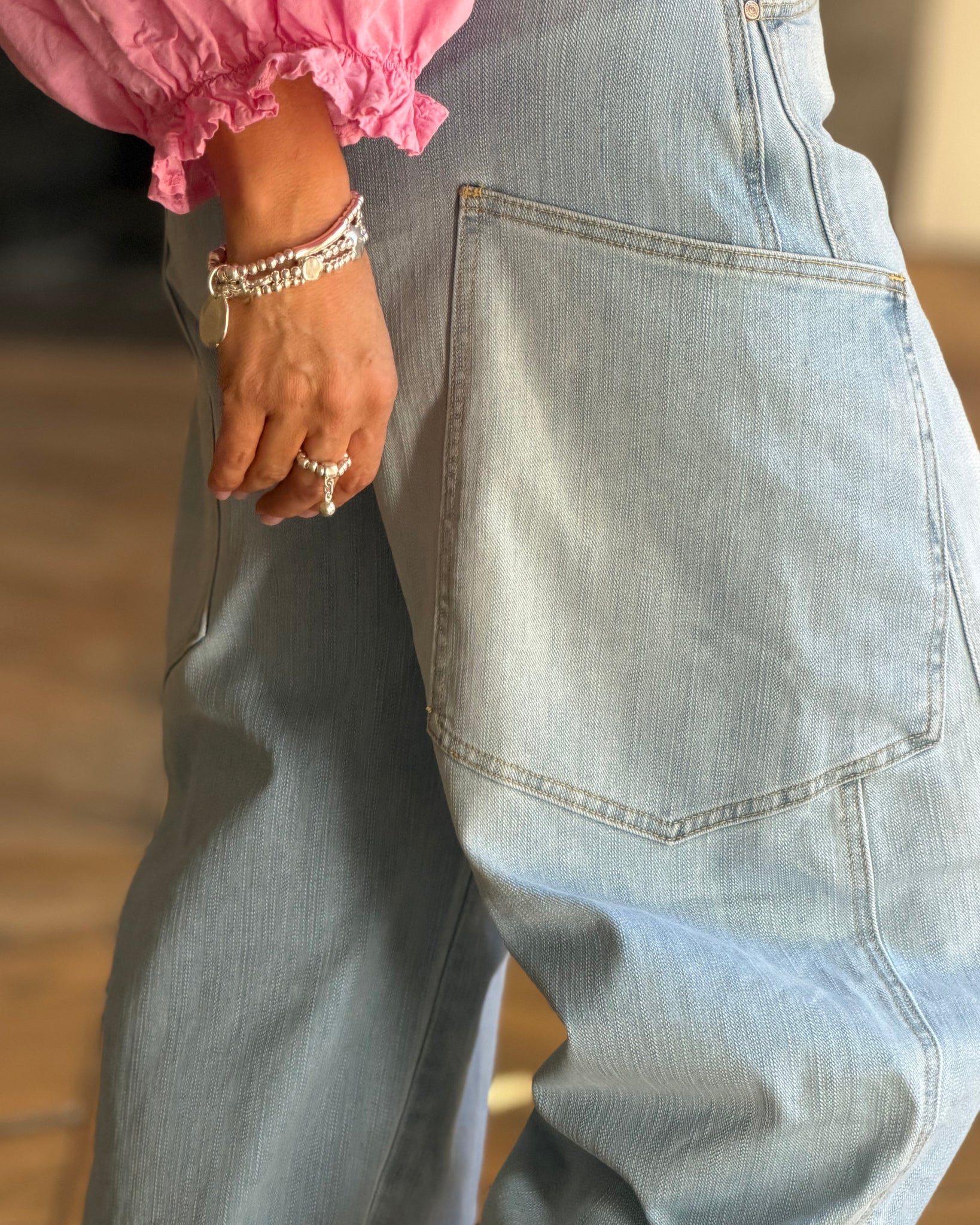 Jean bleu clair, coupe ballon, grandes poches