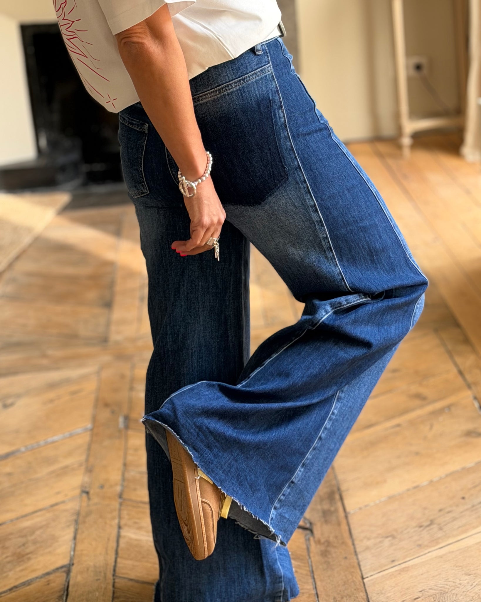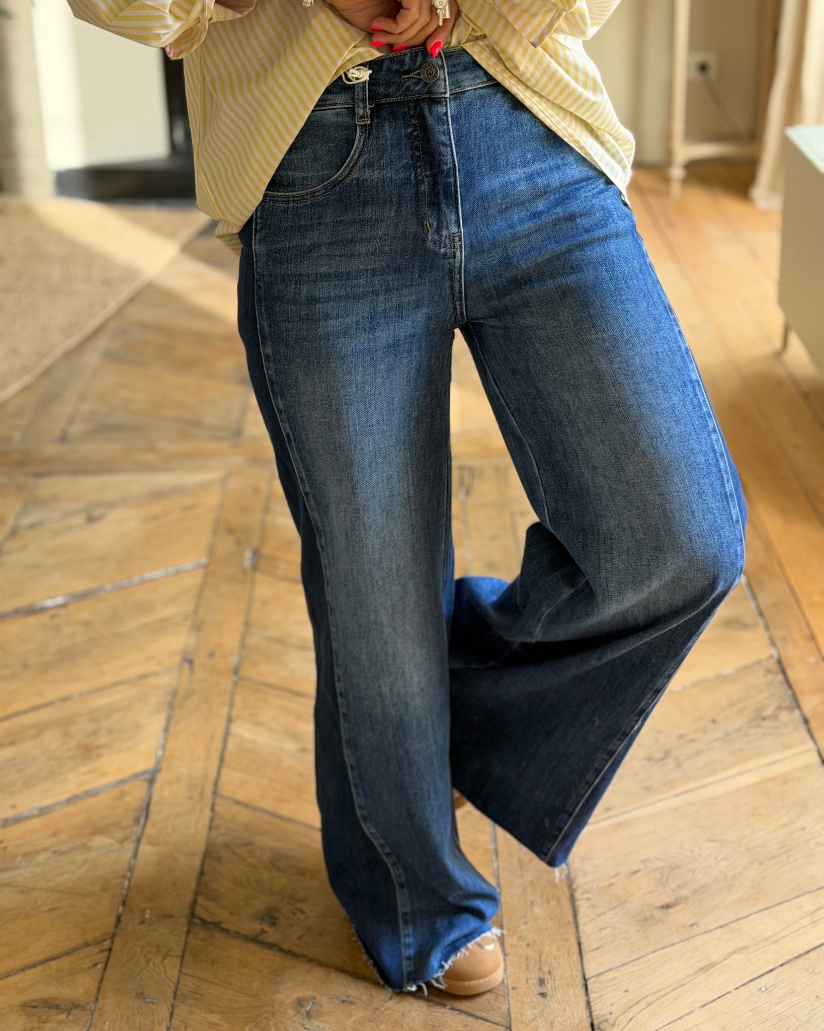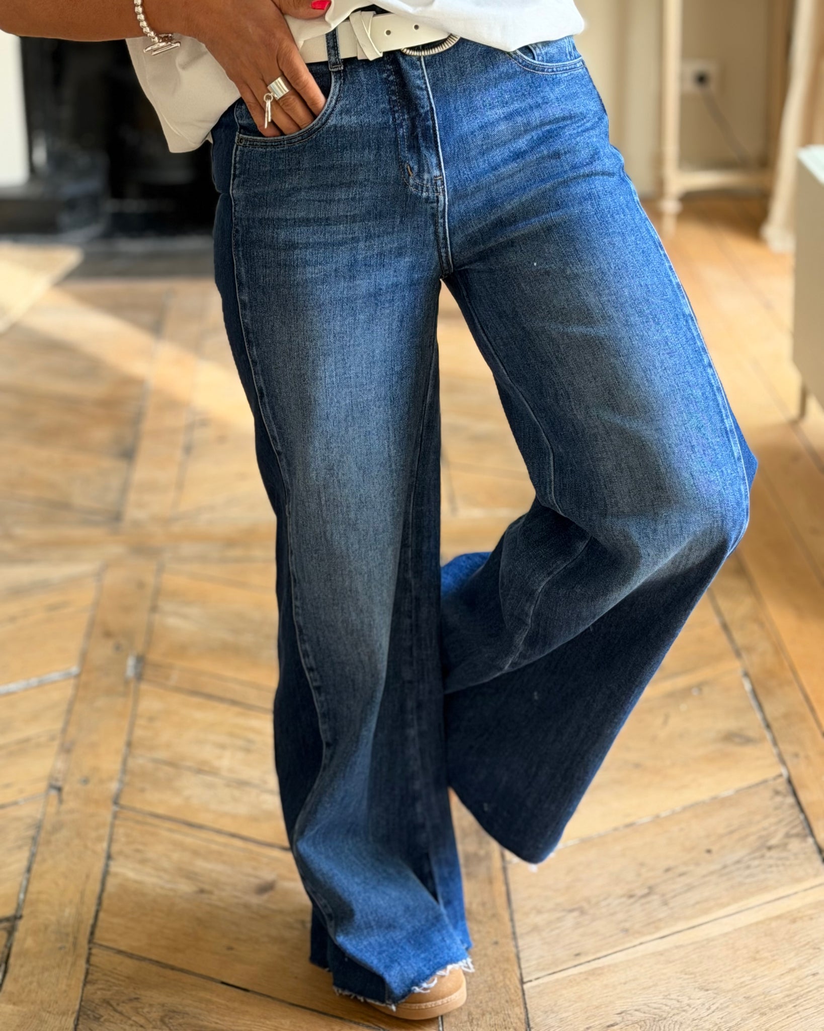 Jean bleu, taille mi-haute, fermeture zip et bouton, jambes larges