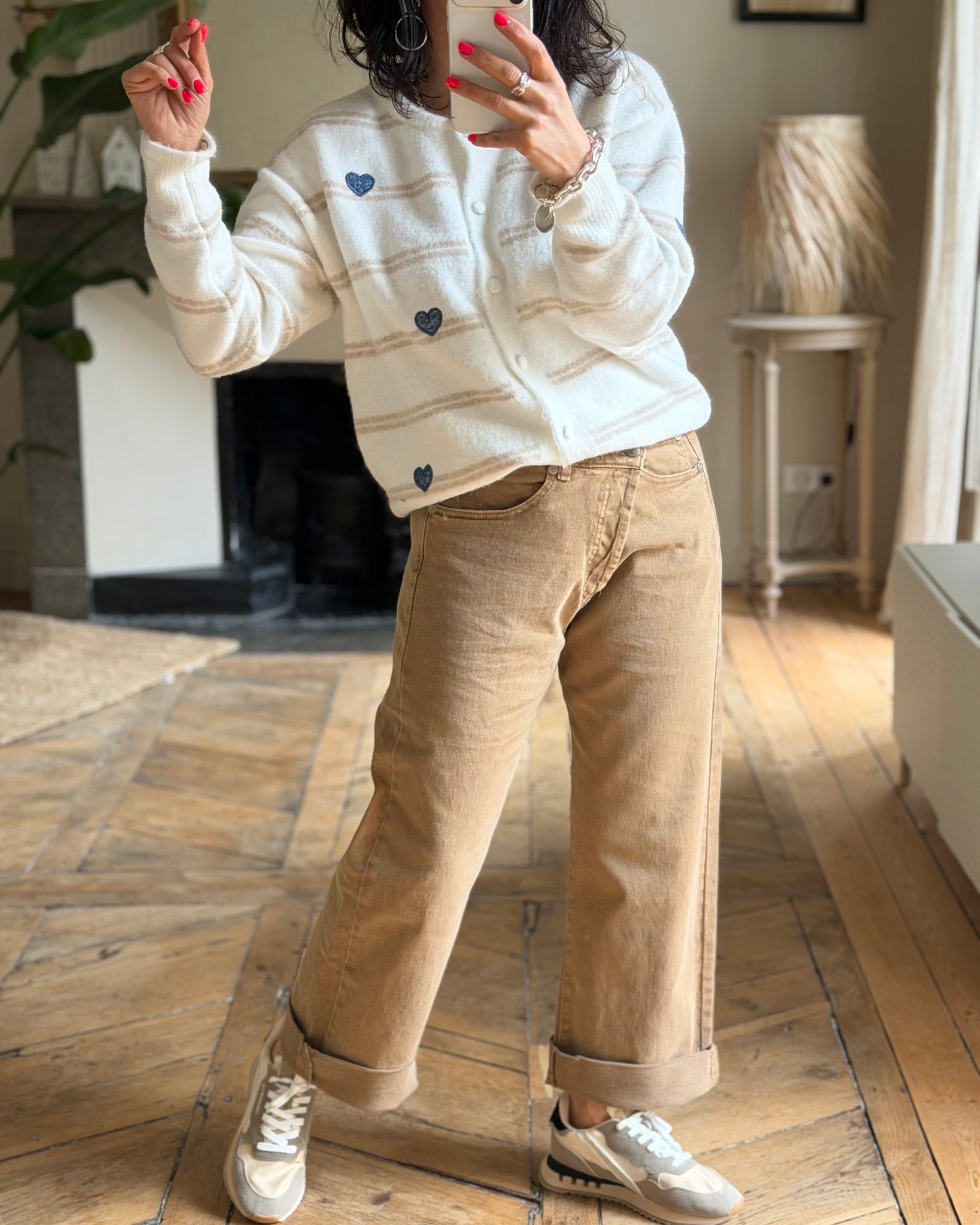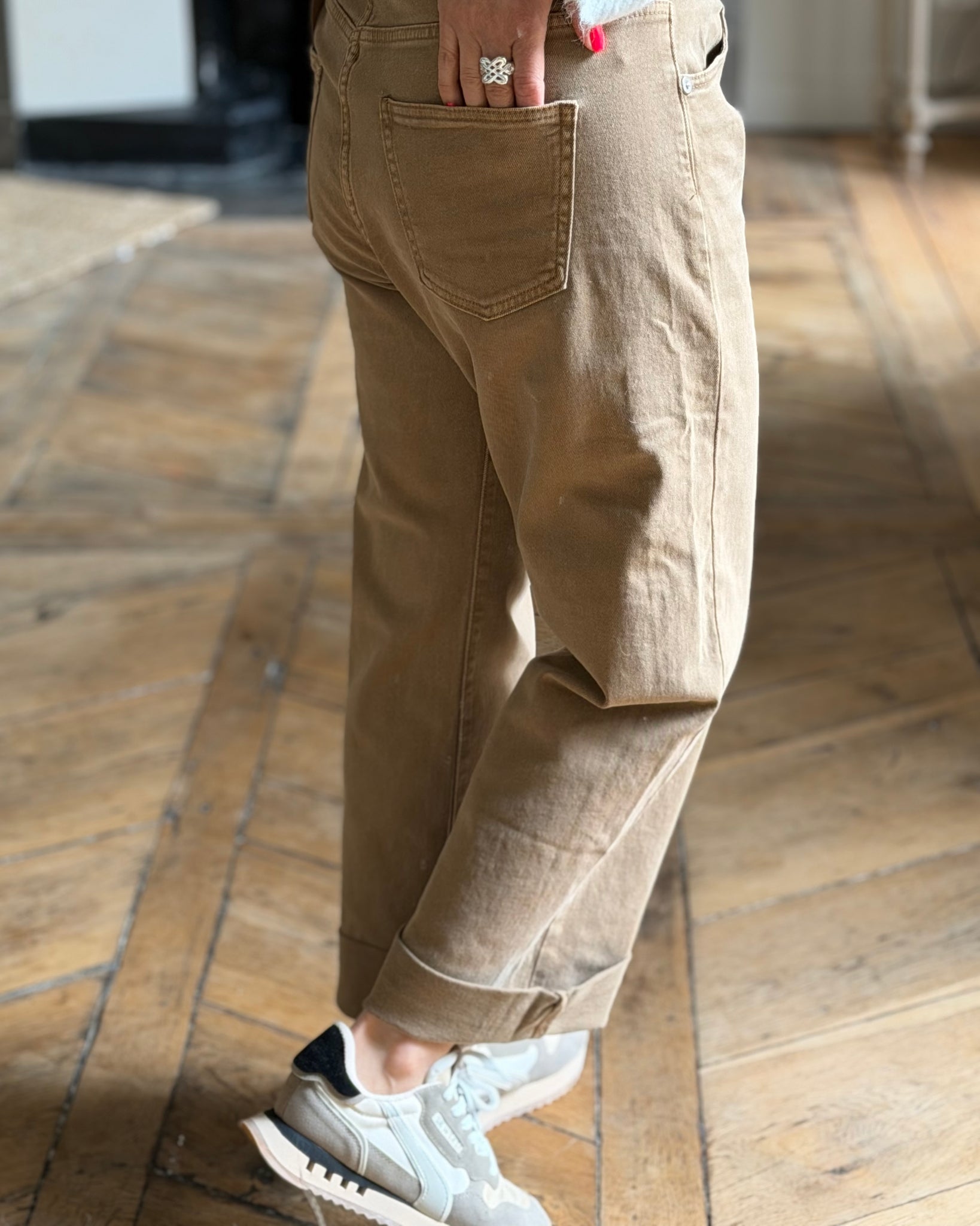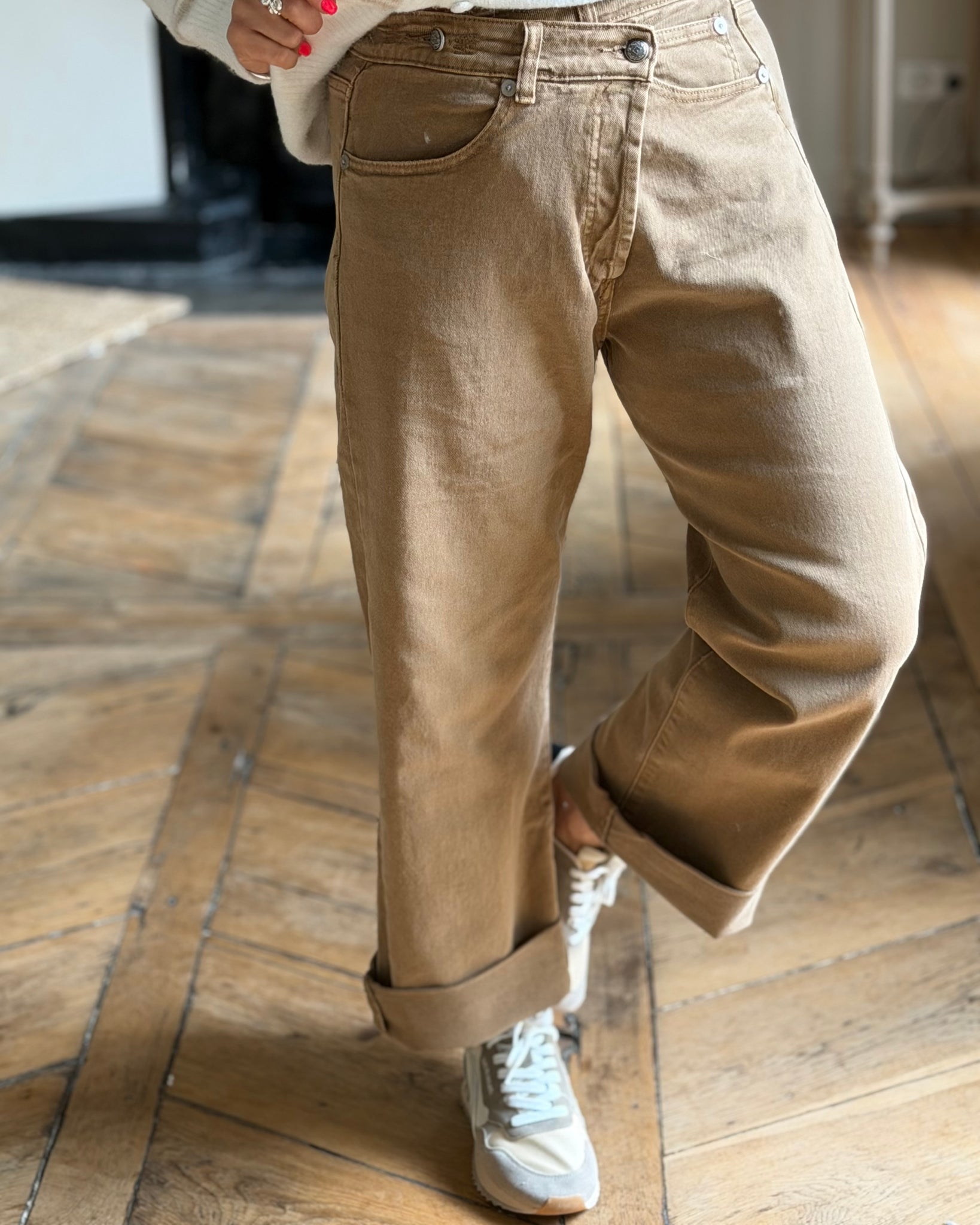 Jean camel, fermeture croisée, coupe large