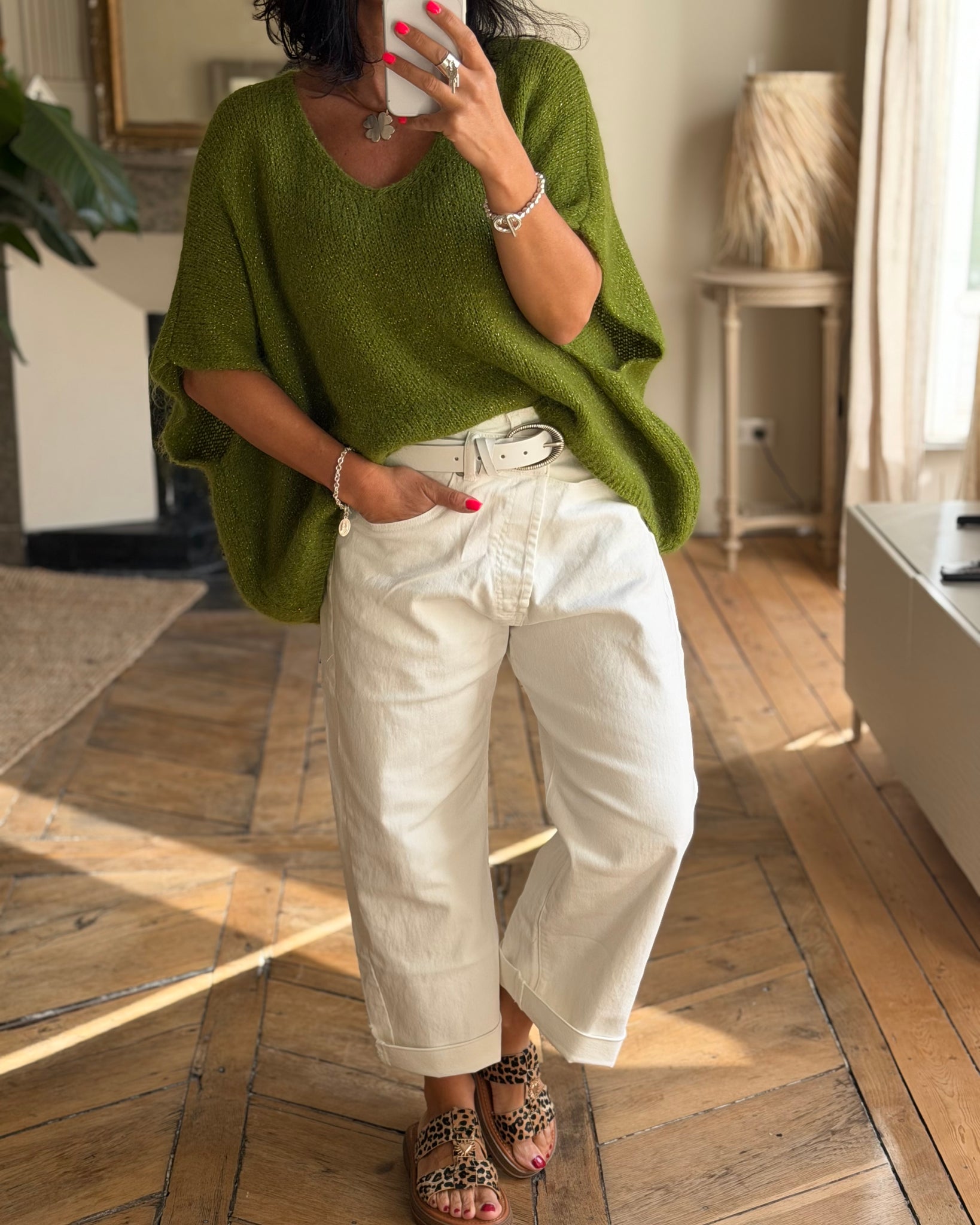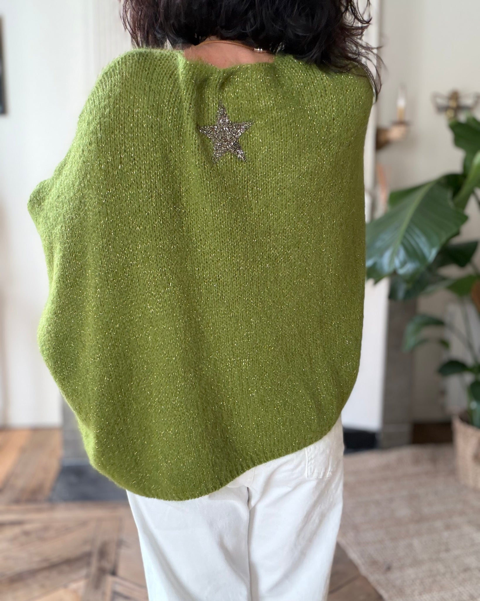Pull sans manches, coupe large, étoile pailletée au dos, fil lurex dans la maille