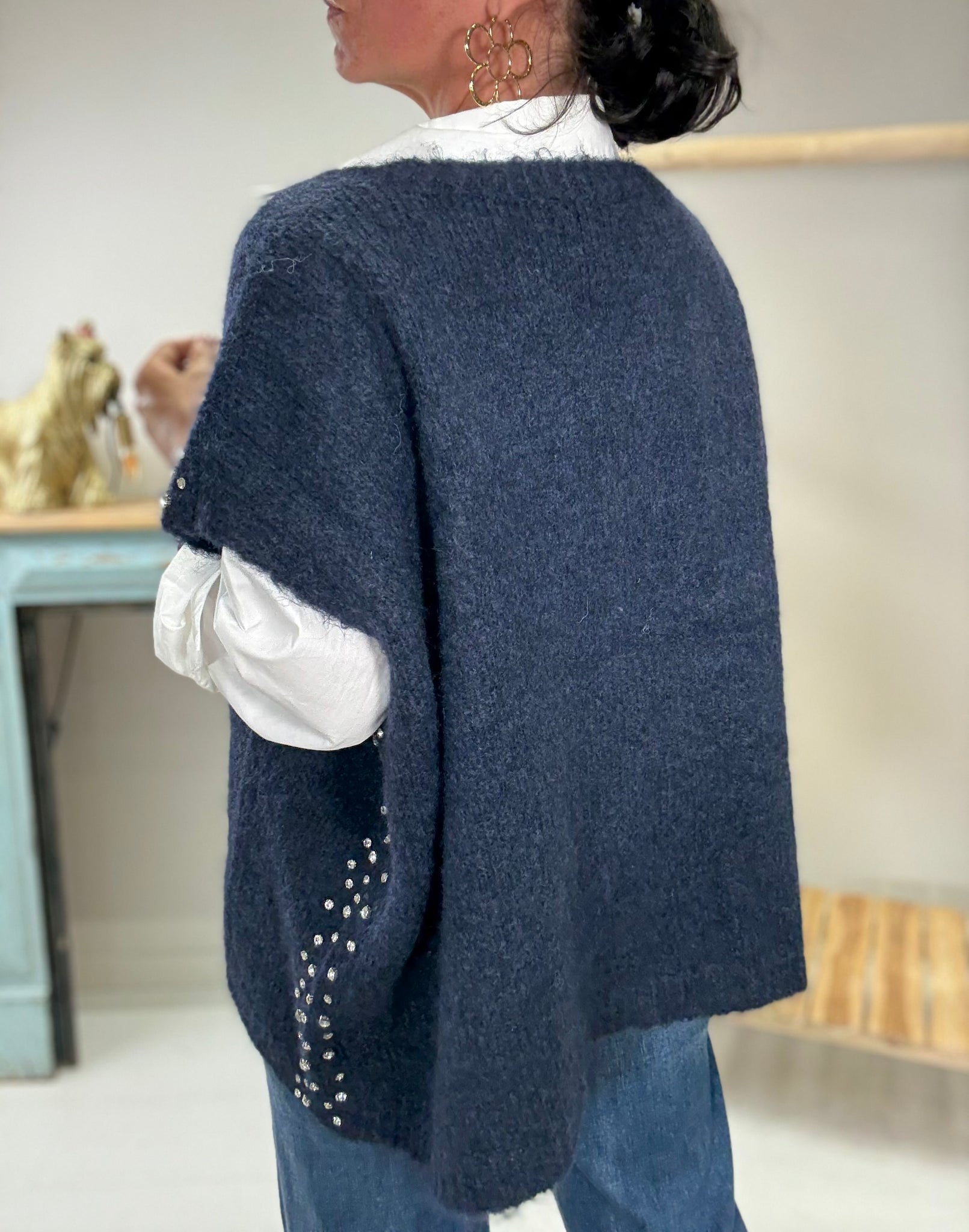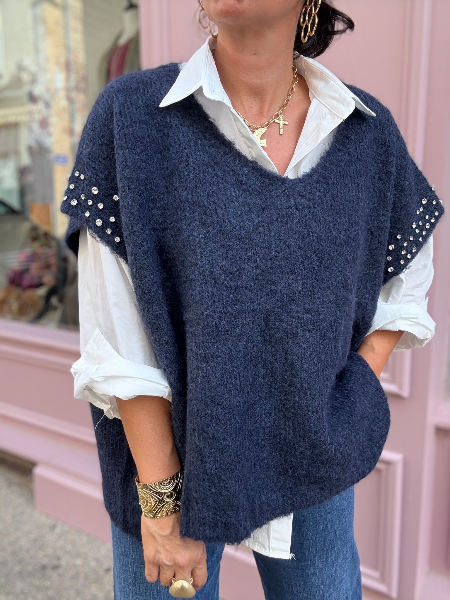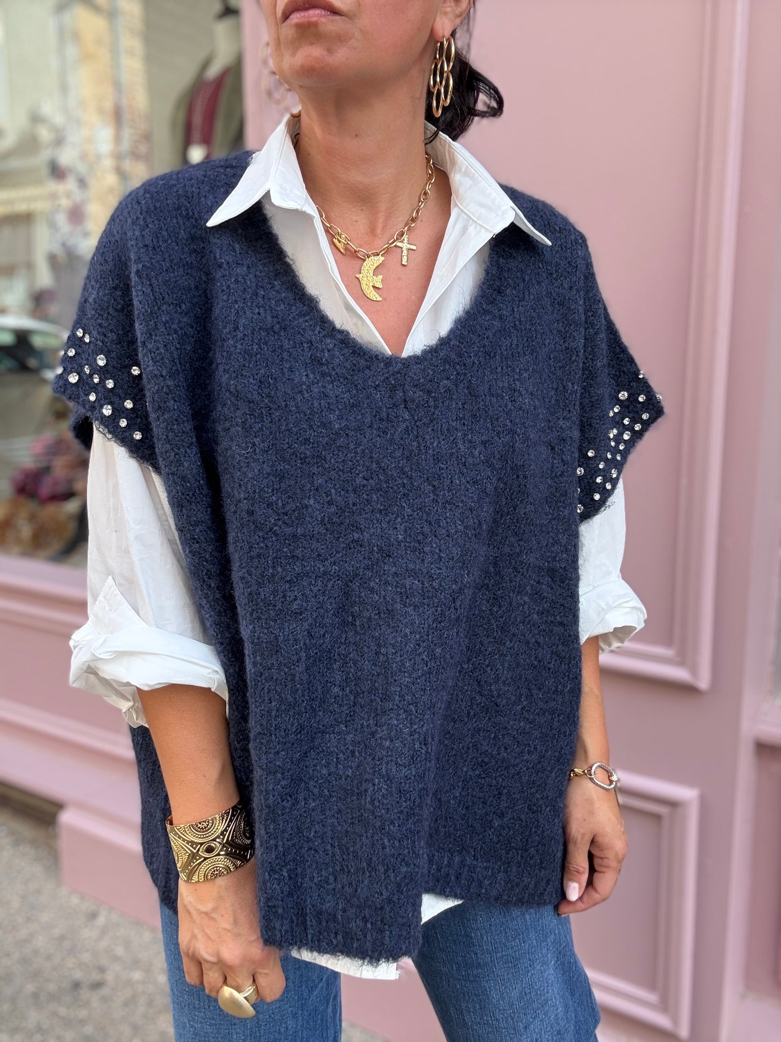 Pull large sans manches, détails strass