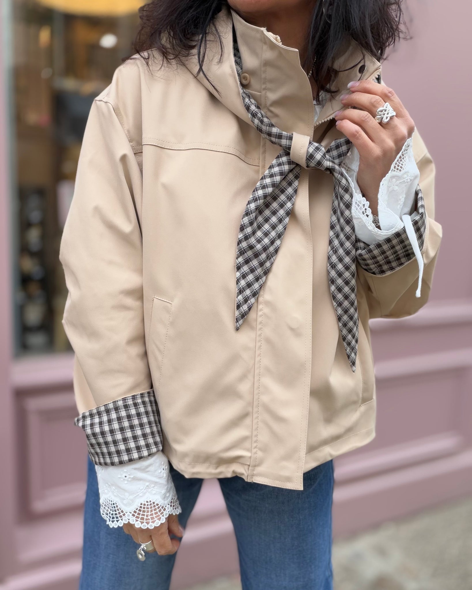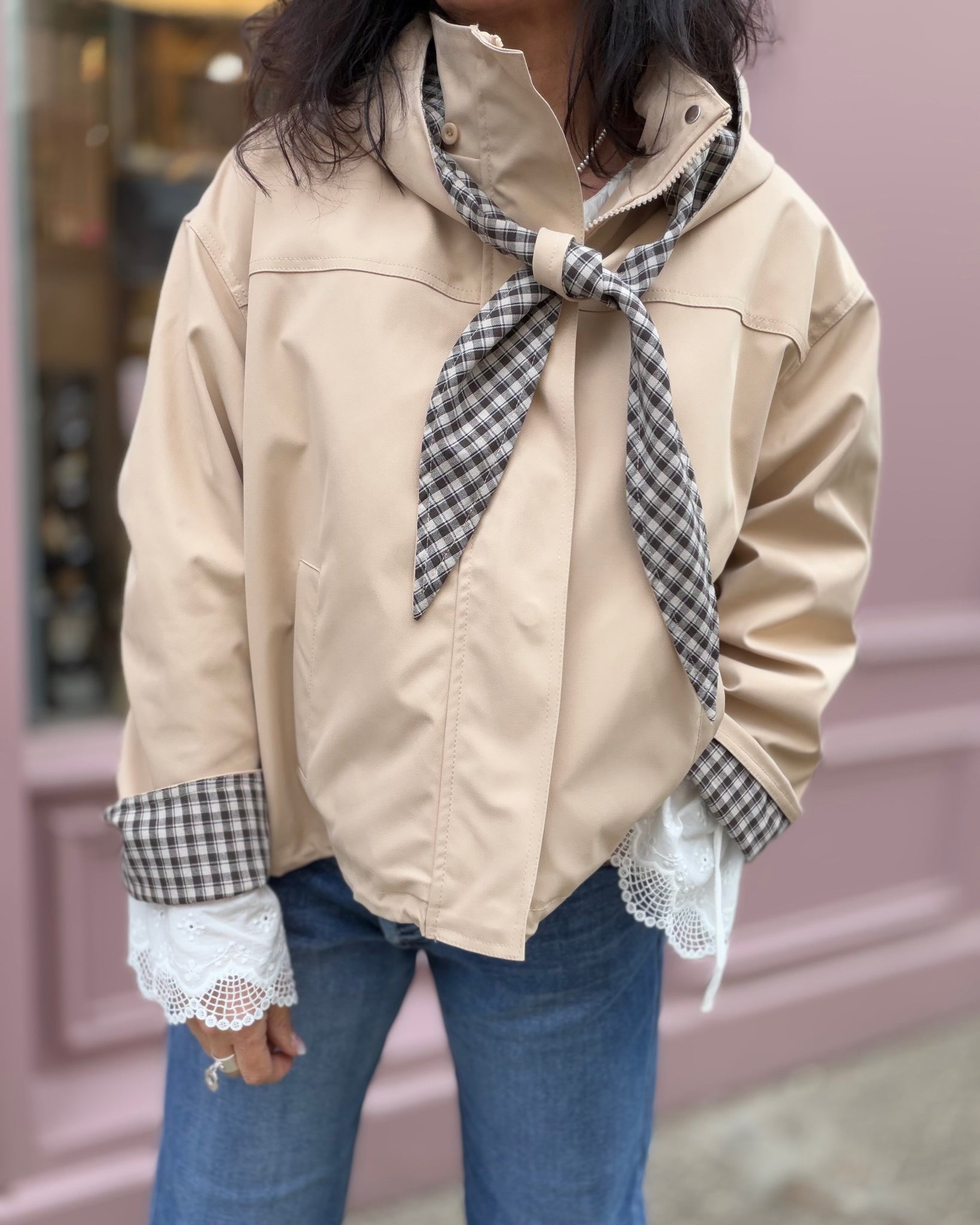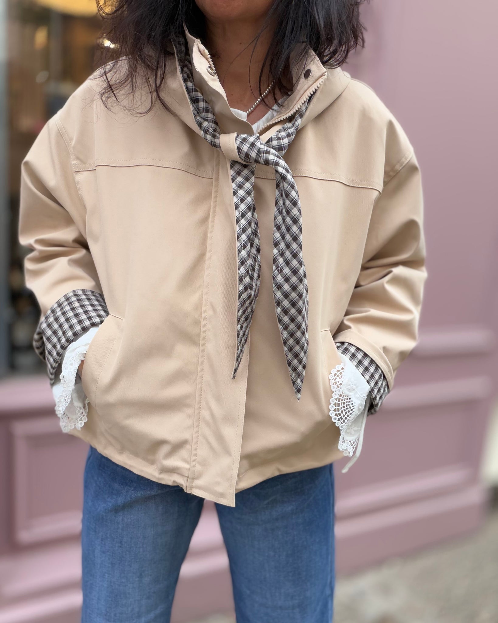 Trench court doublé, fermeture zip avec rabat, poches, capuche amovible