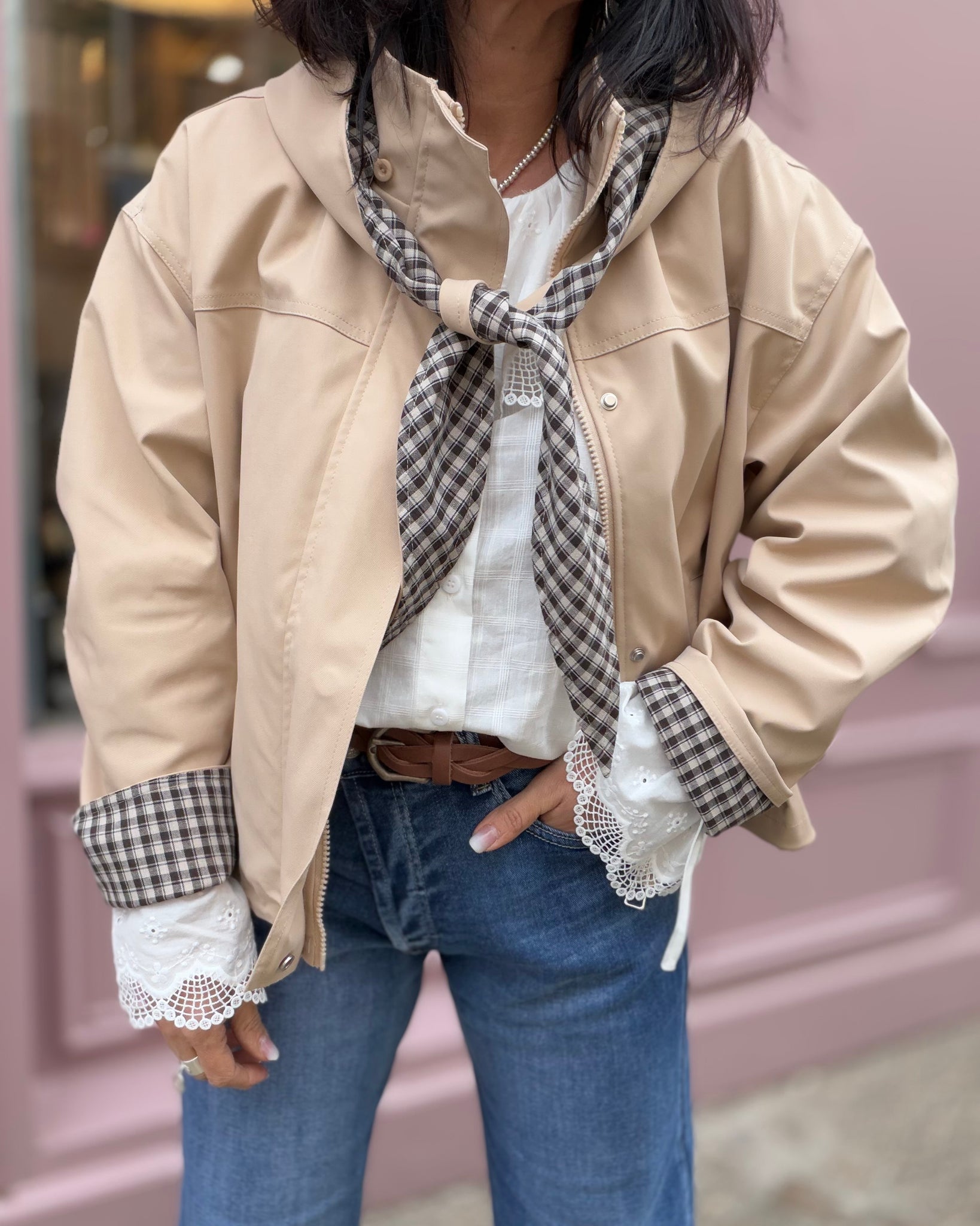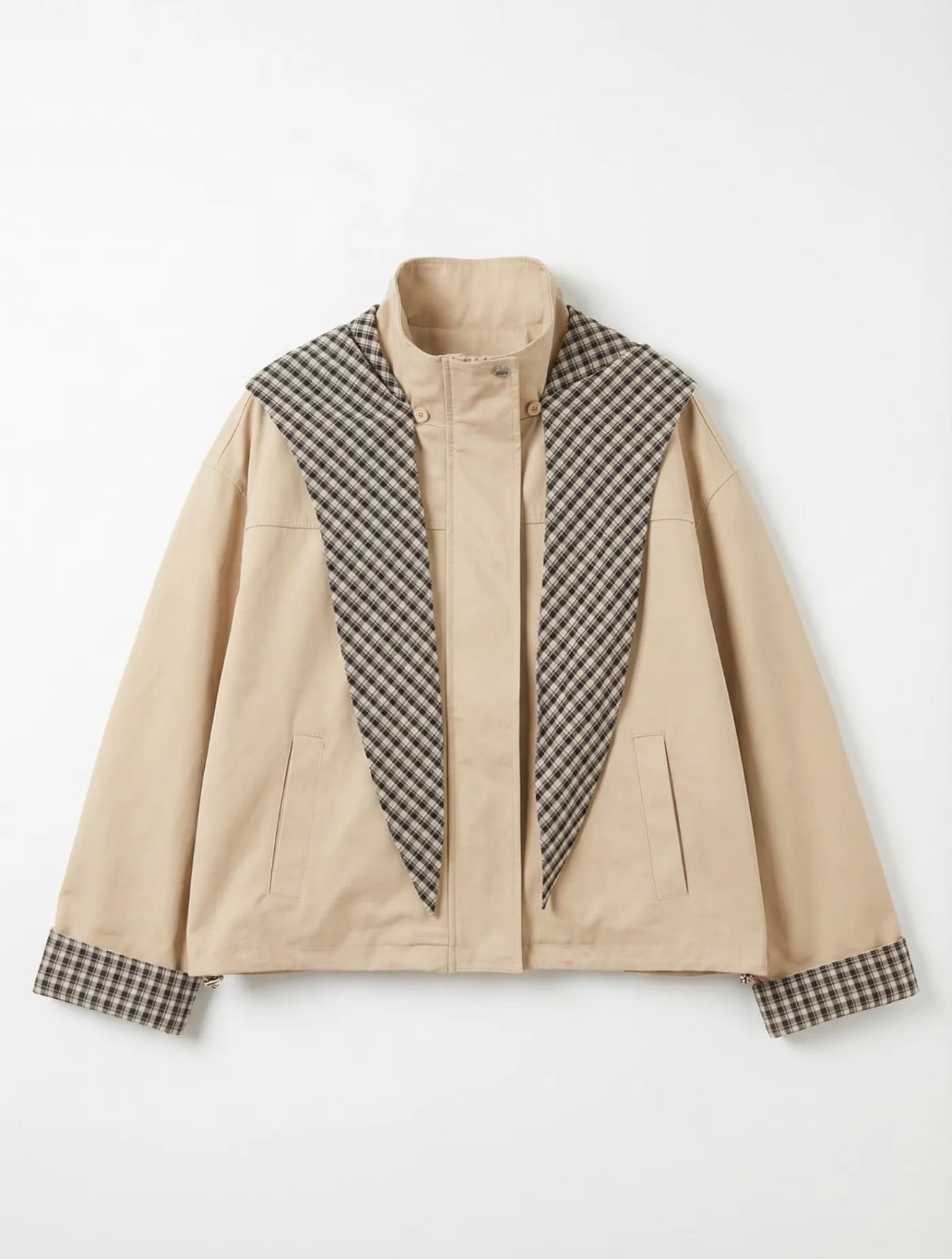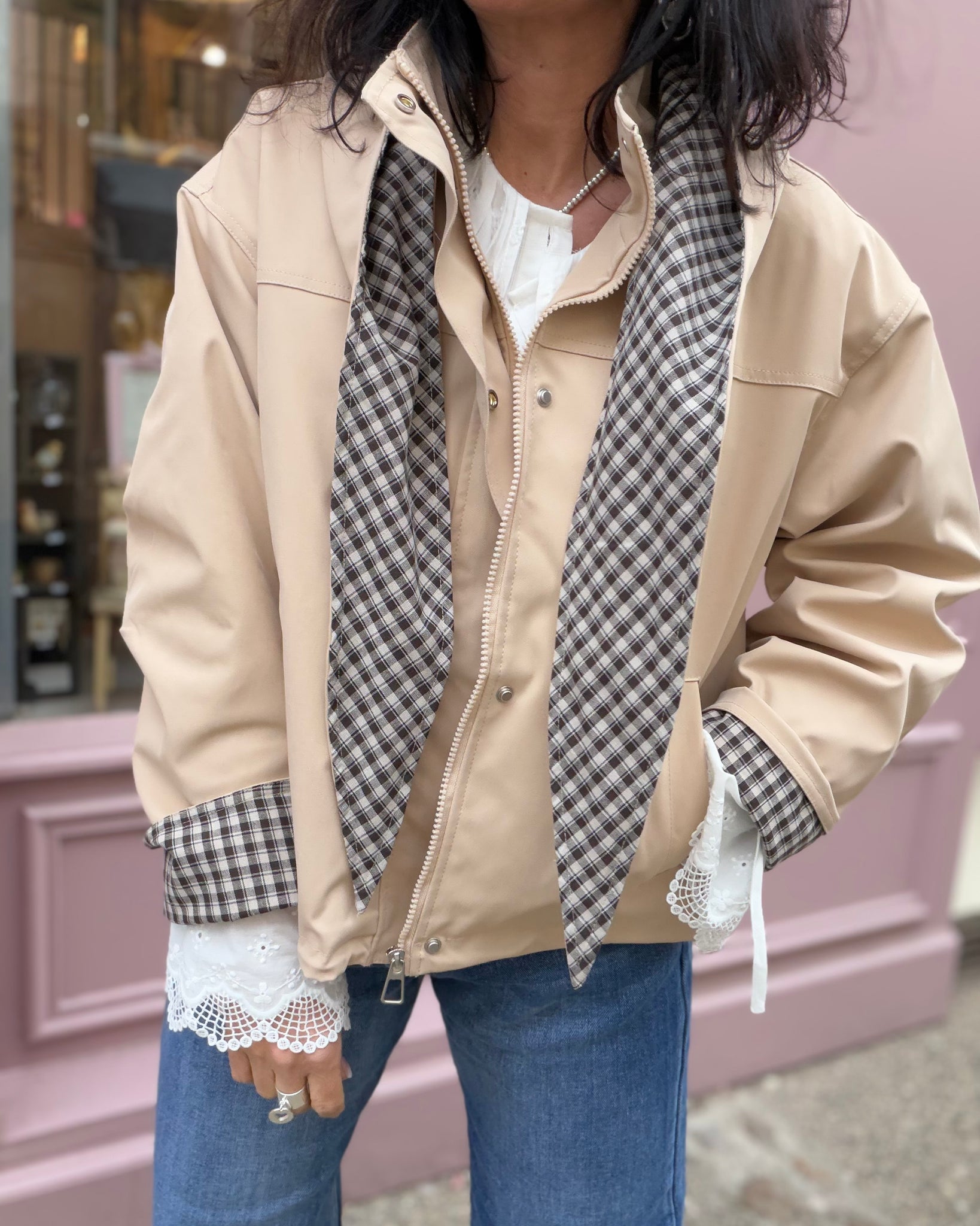 Trench court doublé, fermeture zip avec rabat, poches, capuche amovible