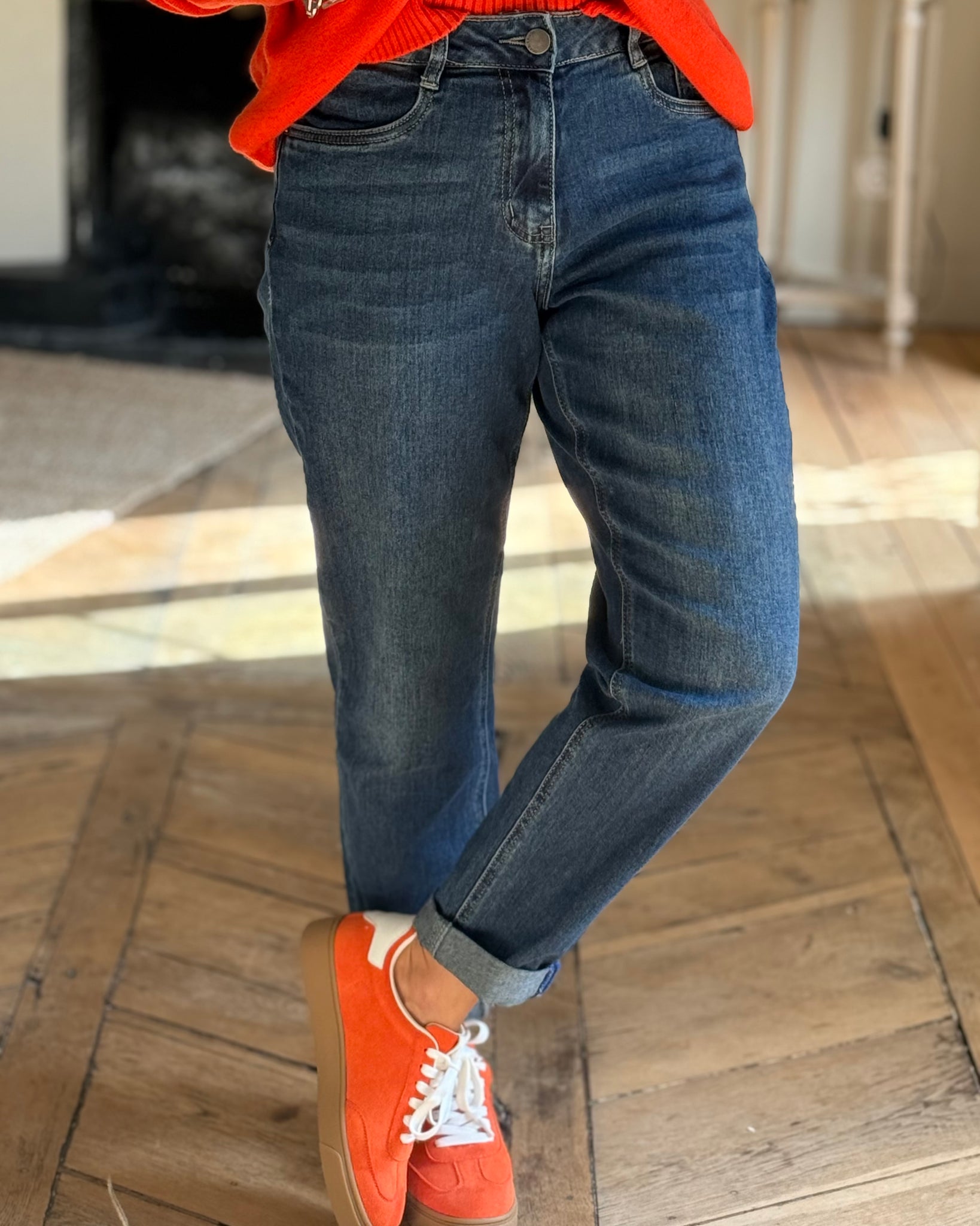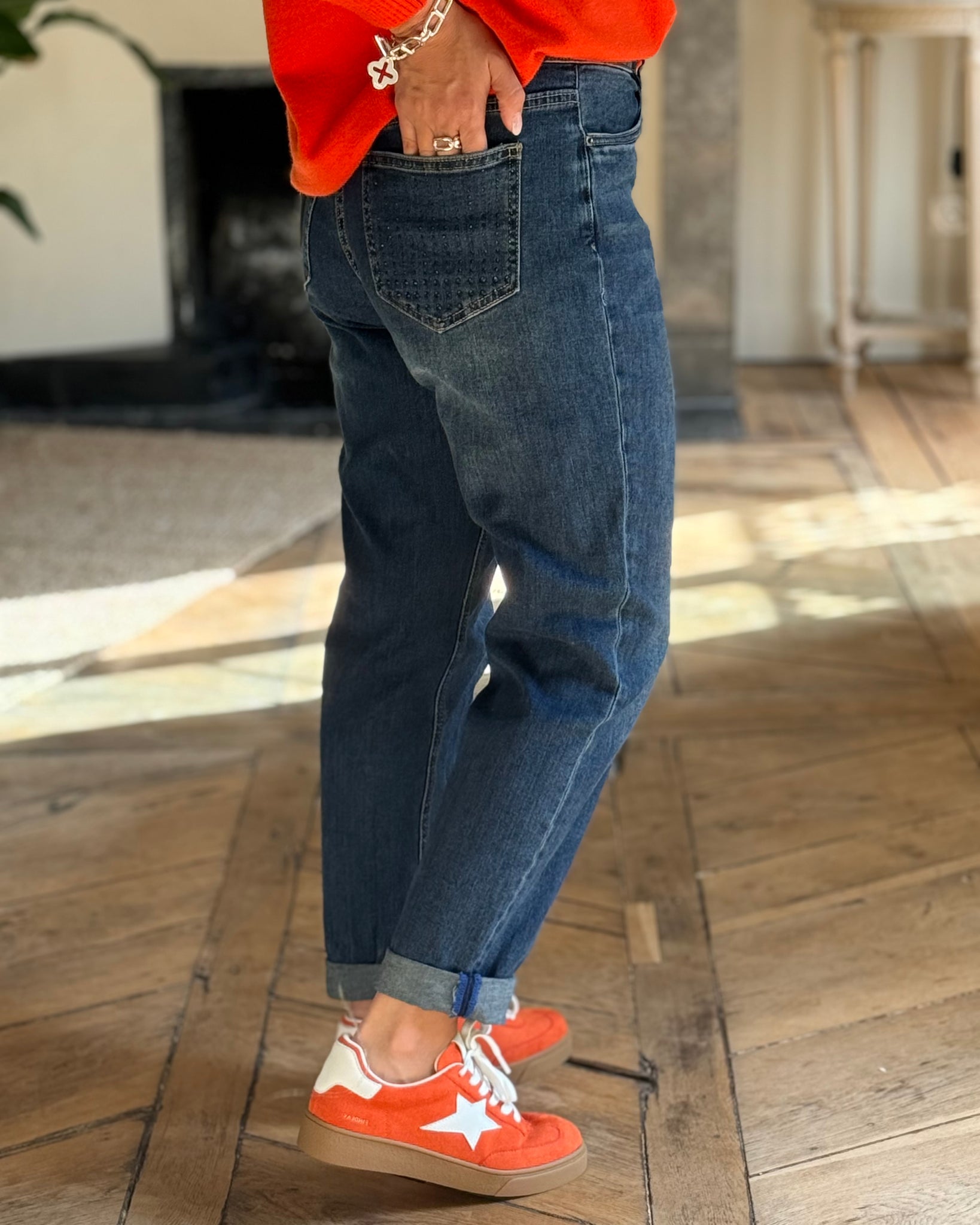 Jean bleu, coupe mom, fermeture zip et bouton, détails strass bleus sur une poche arrière
