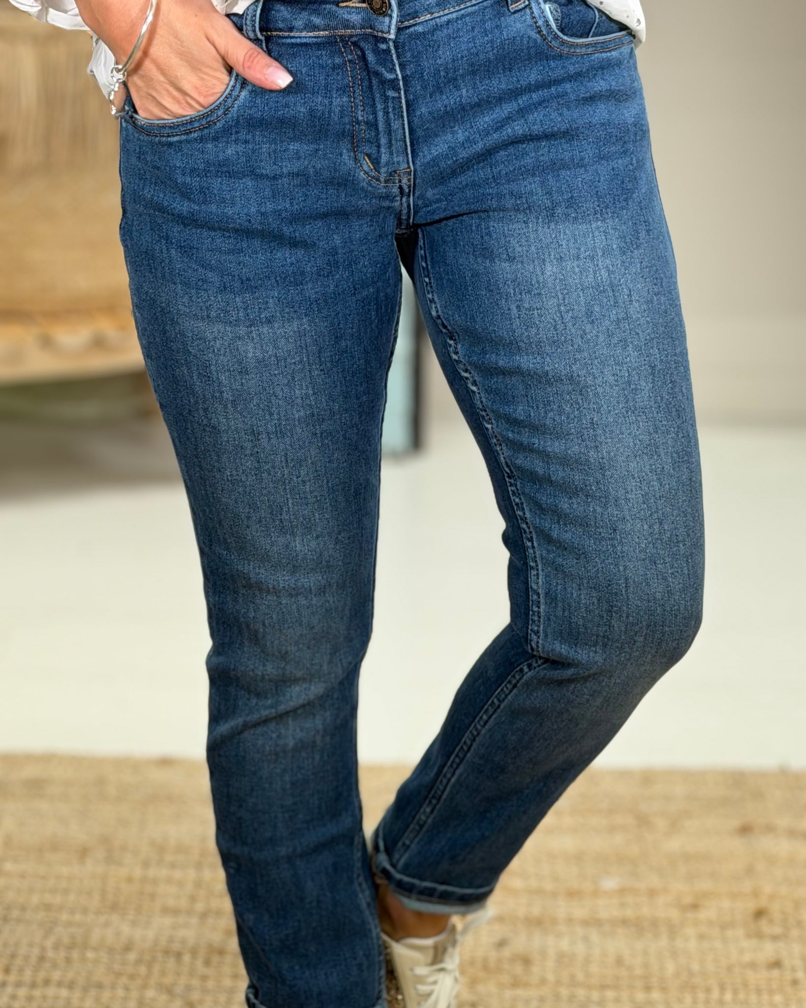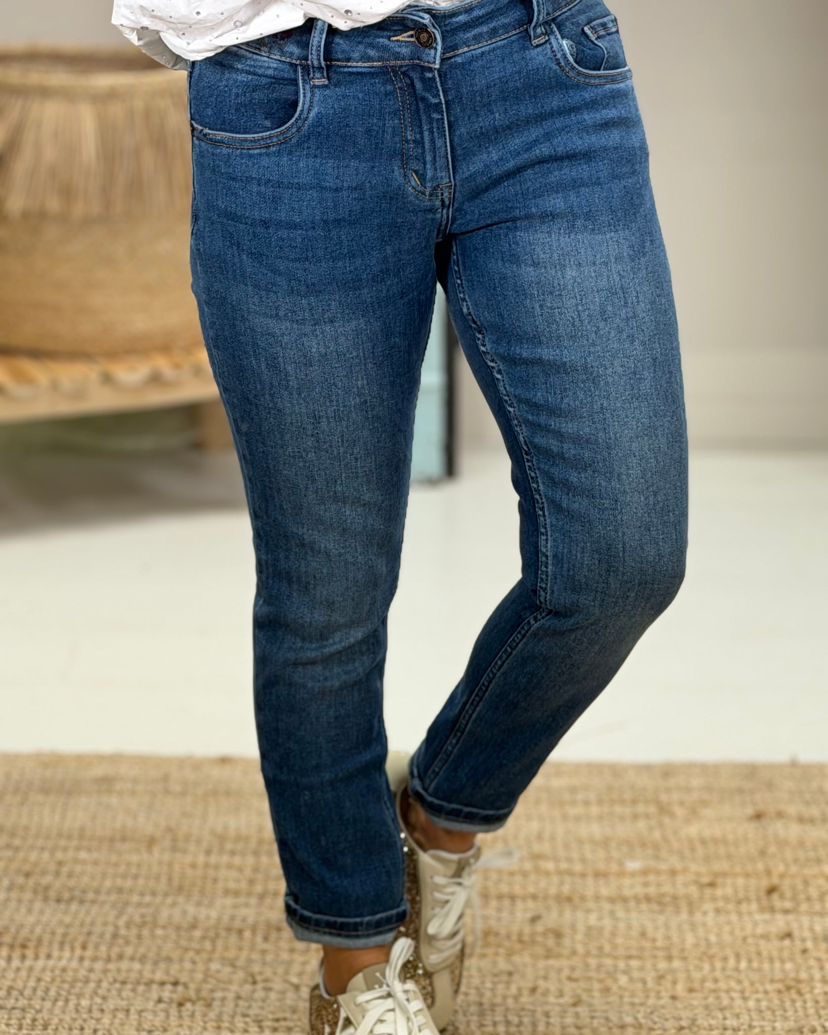 Jean slim, détails broderies a la ceinture, ultra confortable