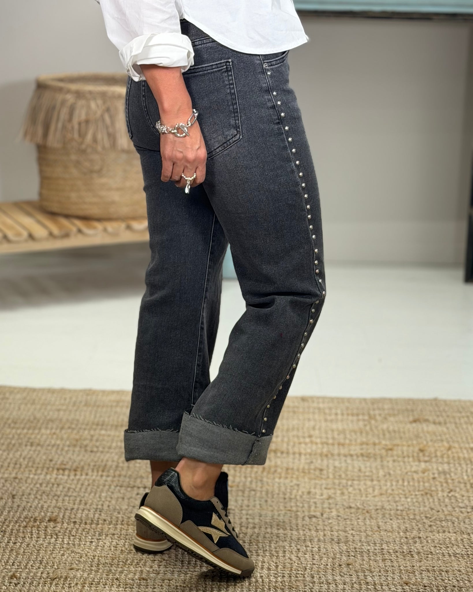 Jean gris clouté, coupe droite, fermeture zip et bouton
