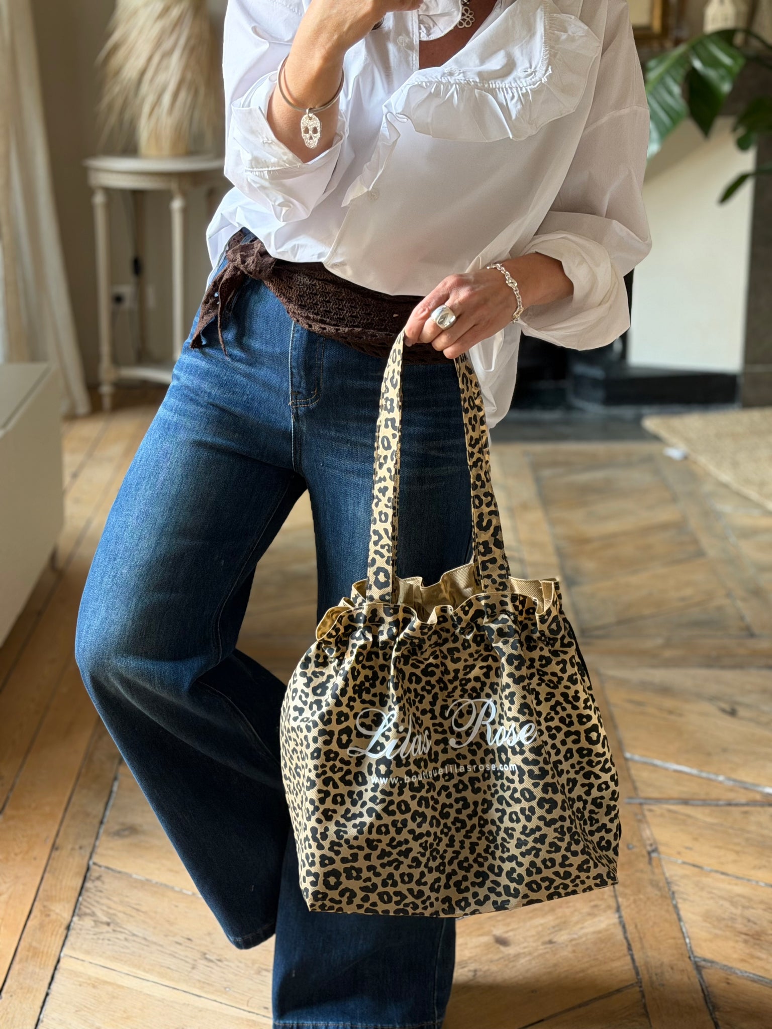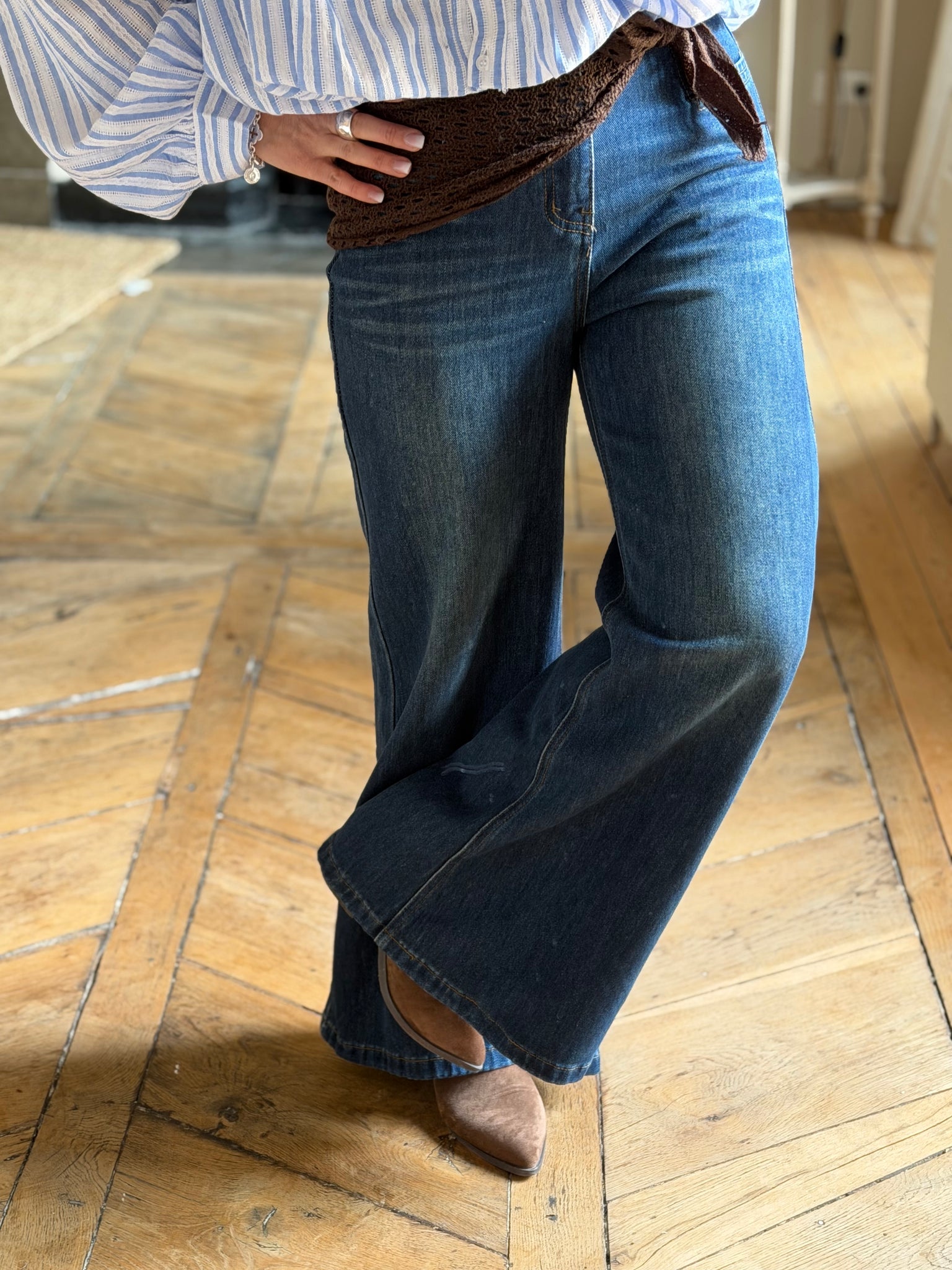 Jean bleu foncé, foulard marron crochet, fermeture zip et bouton