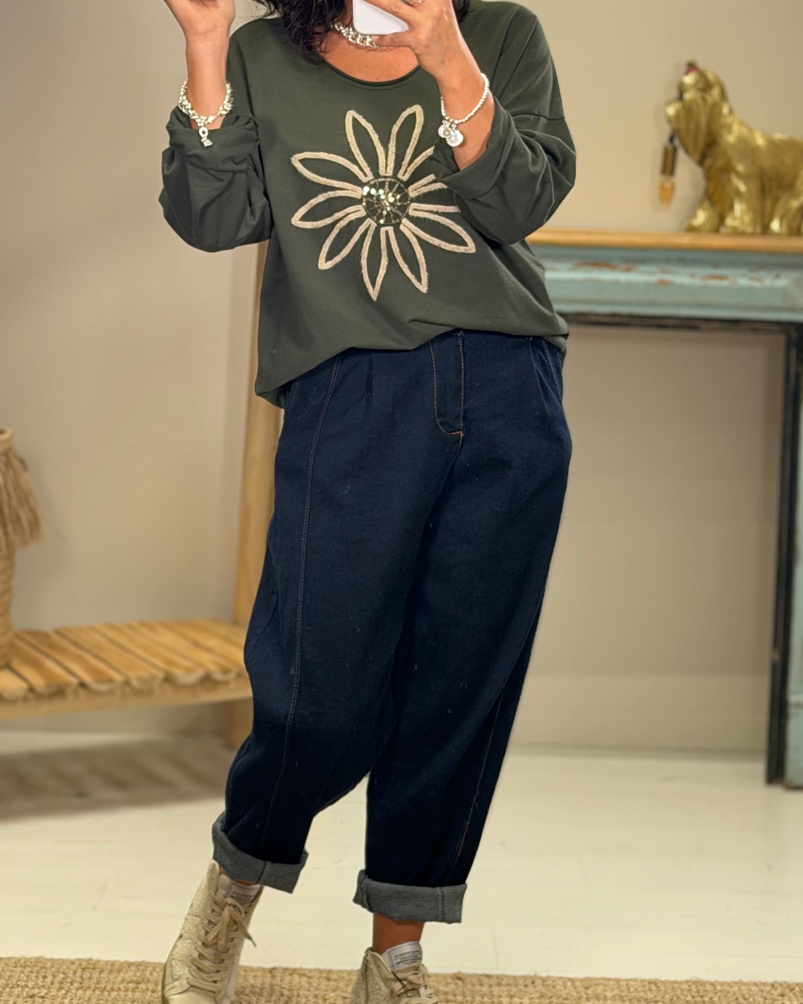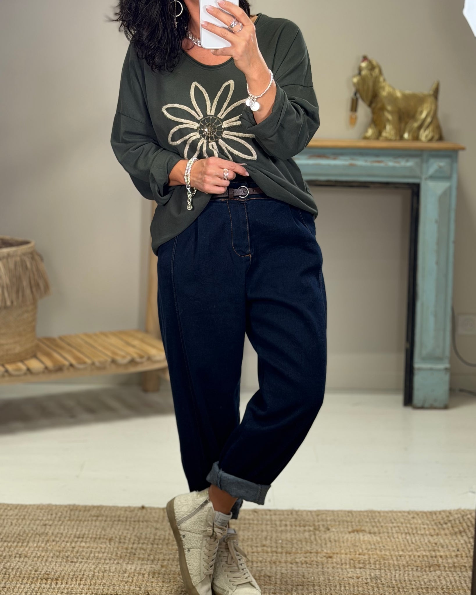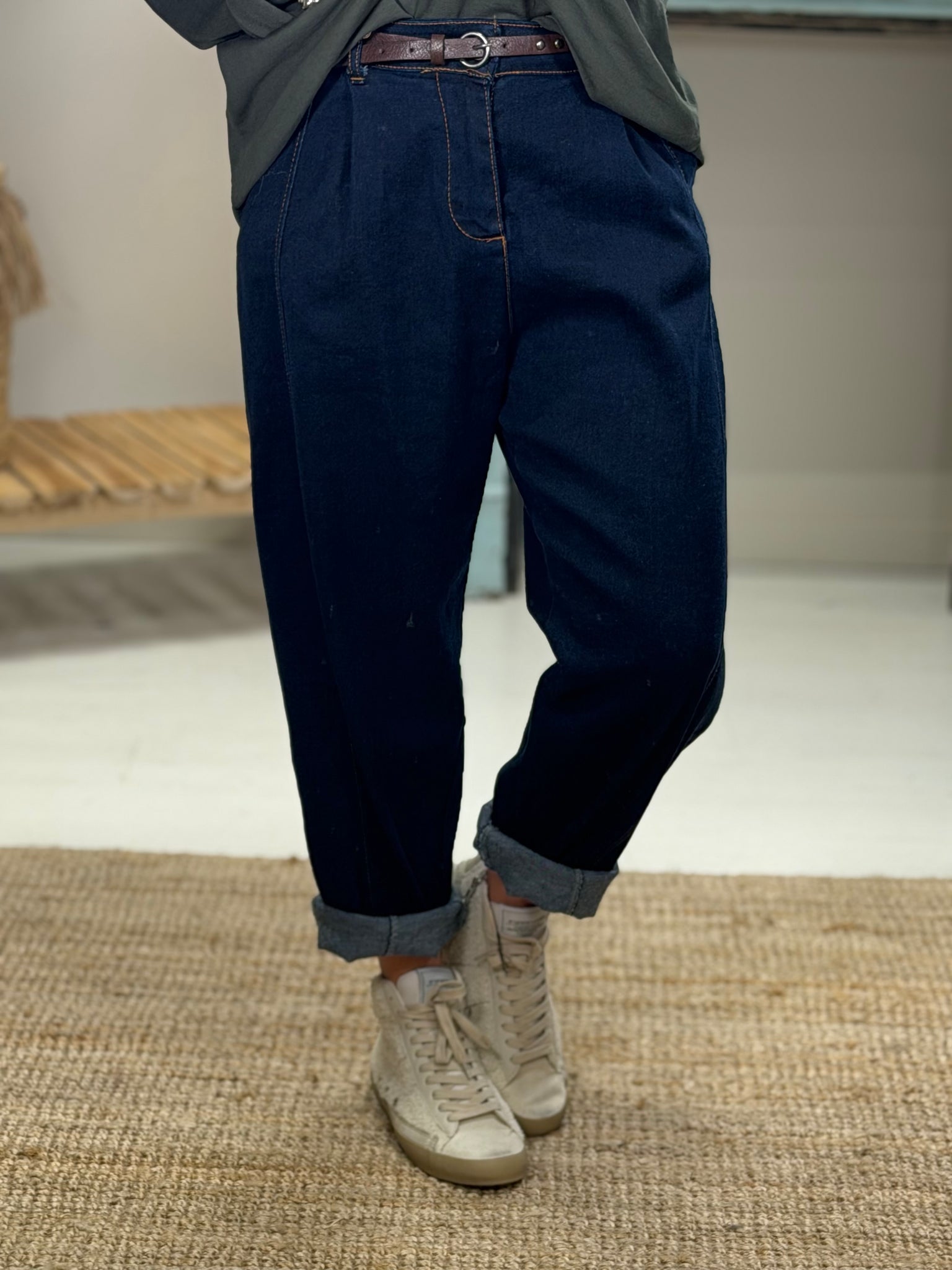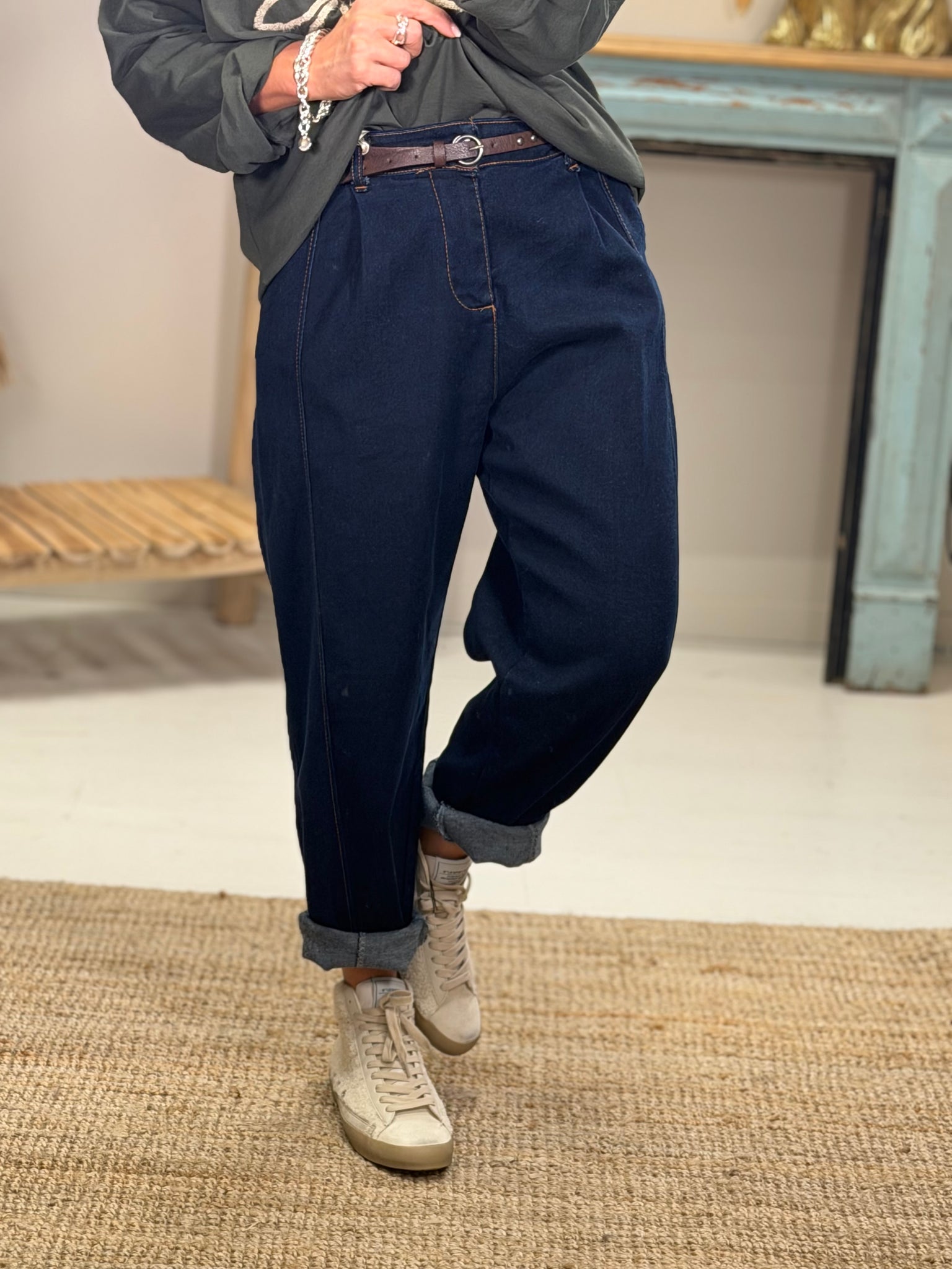 Jeu bleu foncé, coupe ballon, fermeture zip et bouton, fine ceinture synthétique