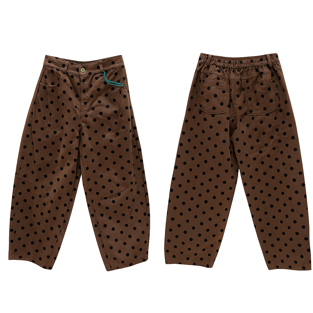 Pantalon marron à pois, coupe ballon, fermeture zip et bouton, poches