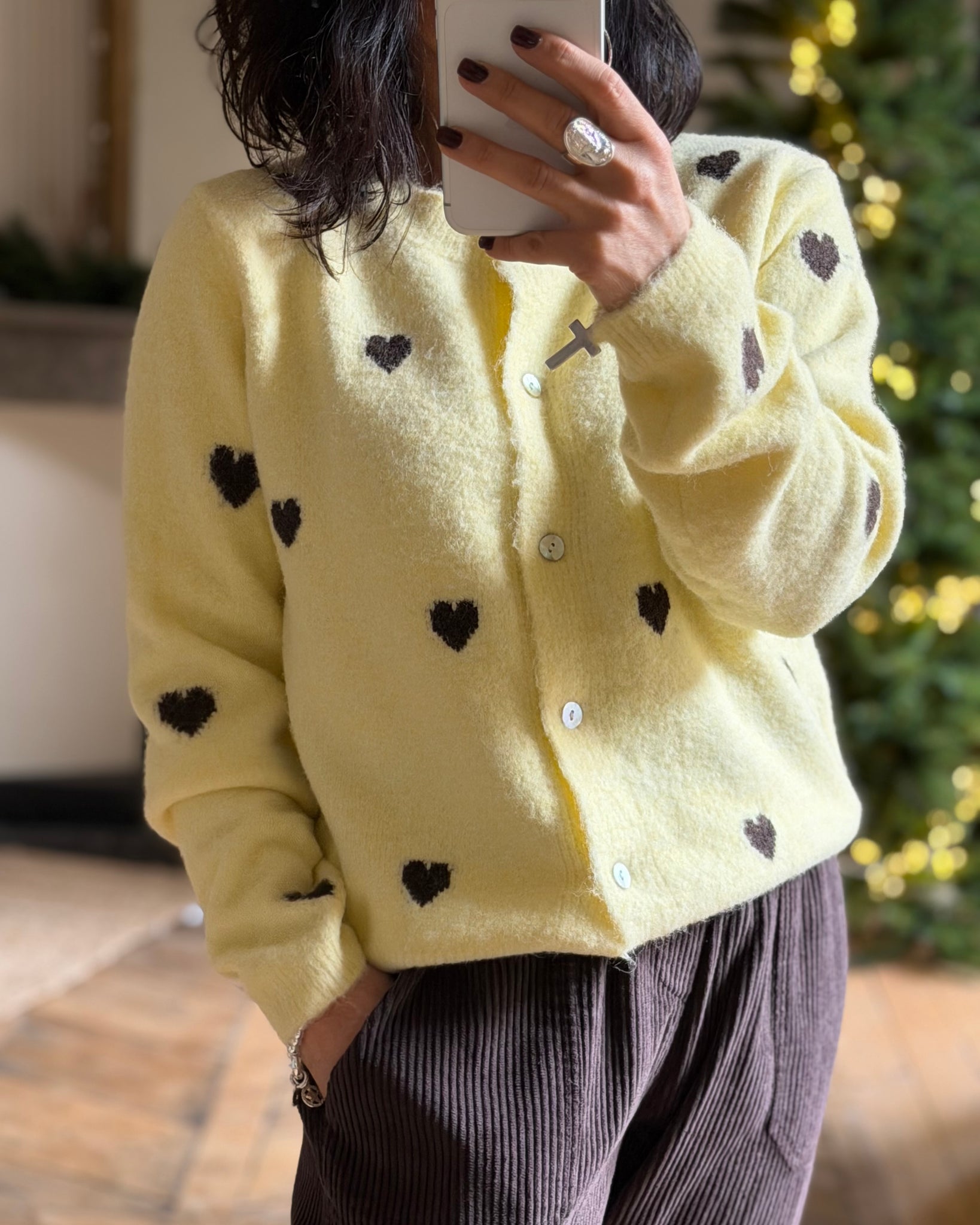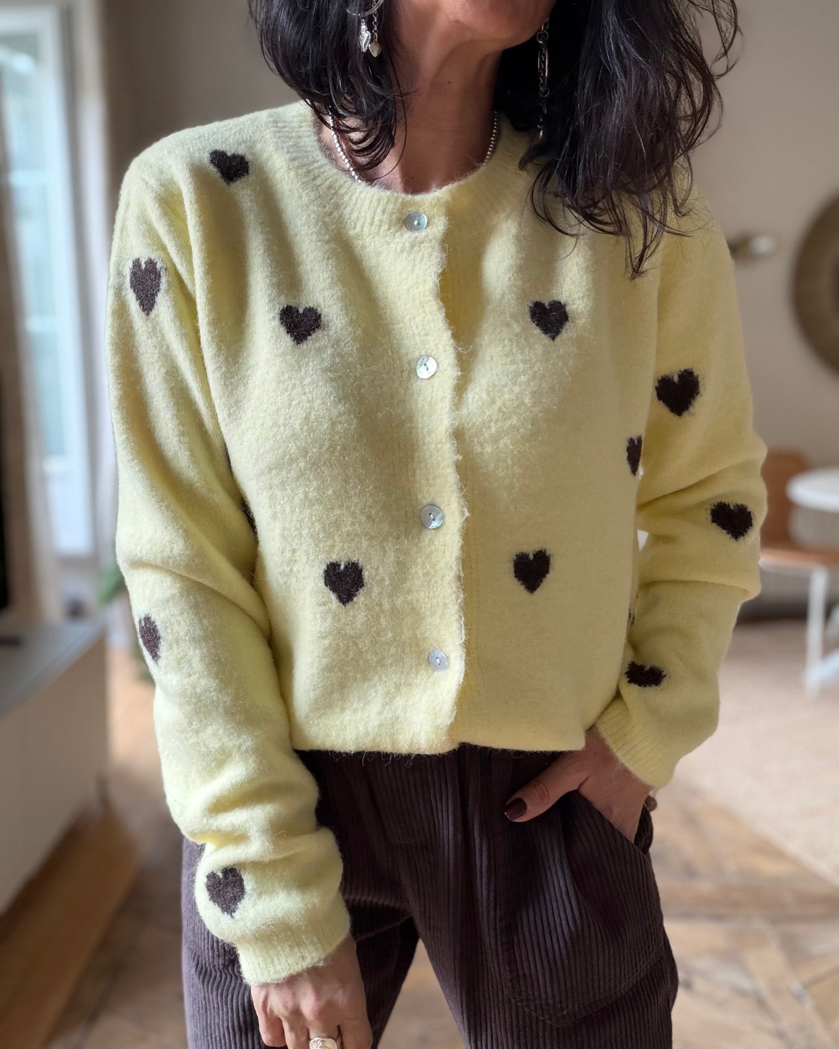 Gilet jaune à coeurs marron, tout doux 🥰