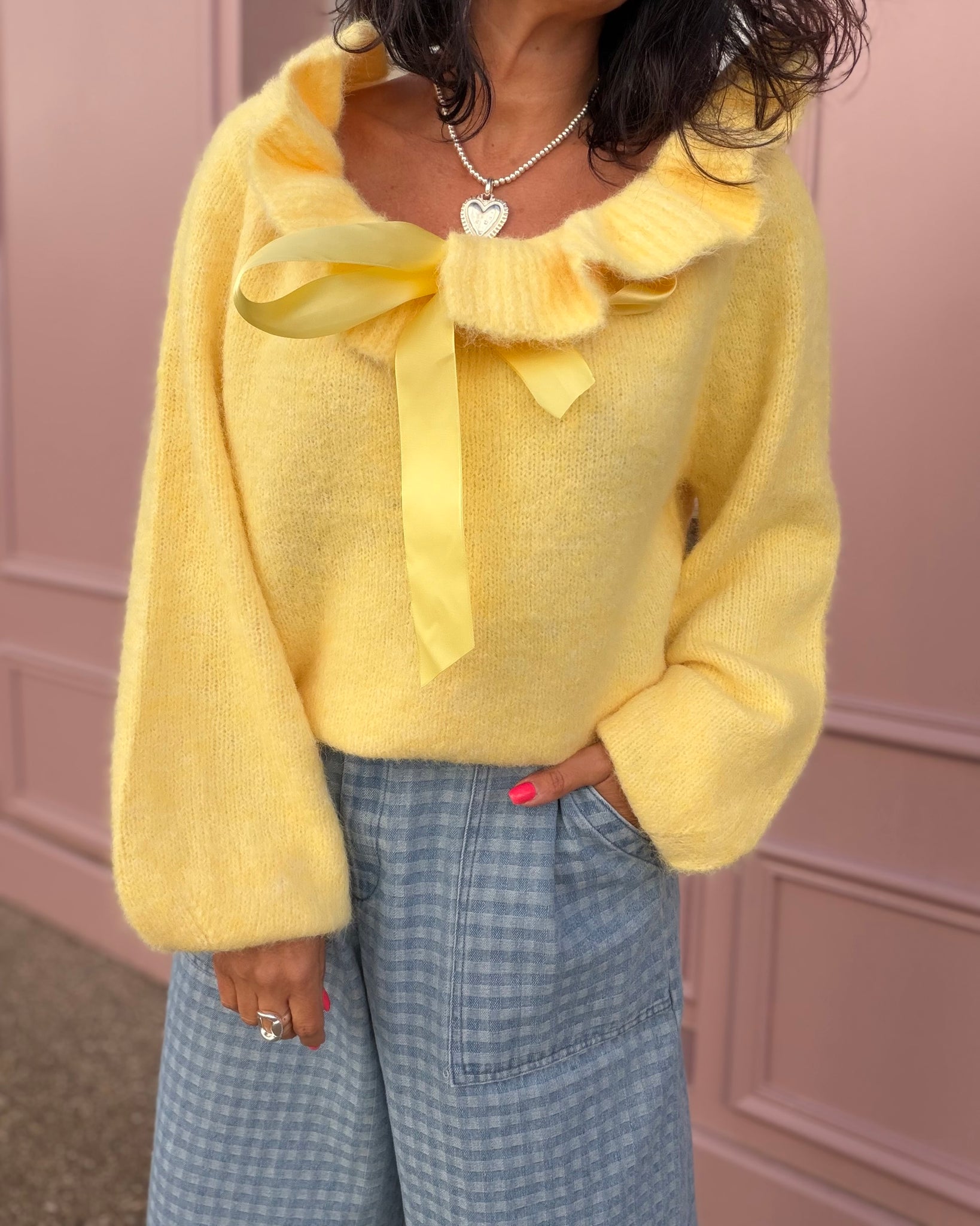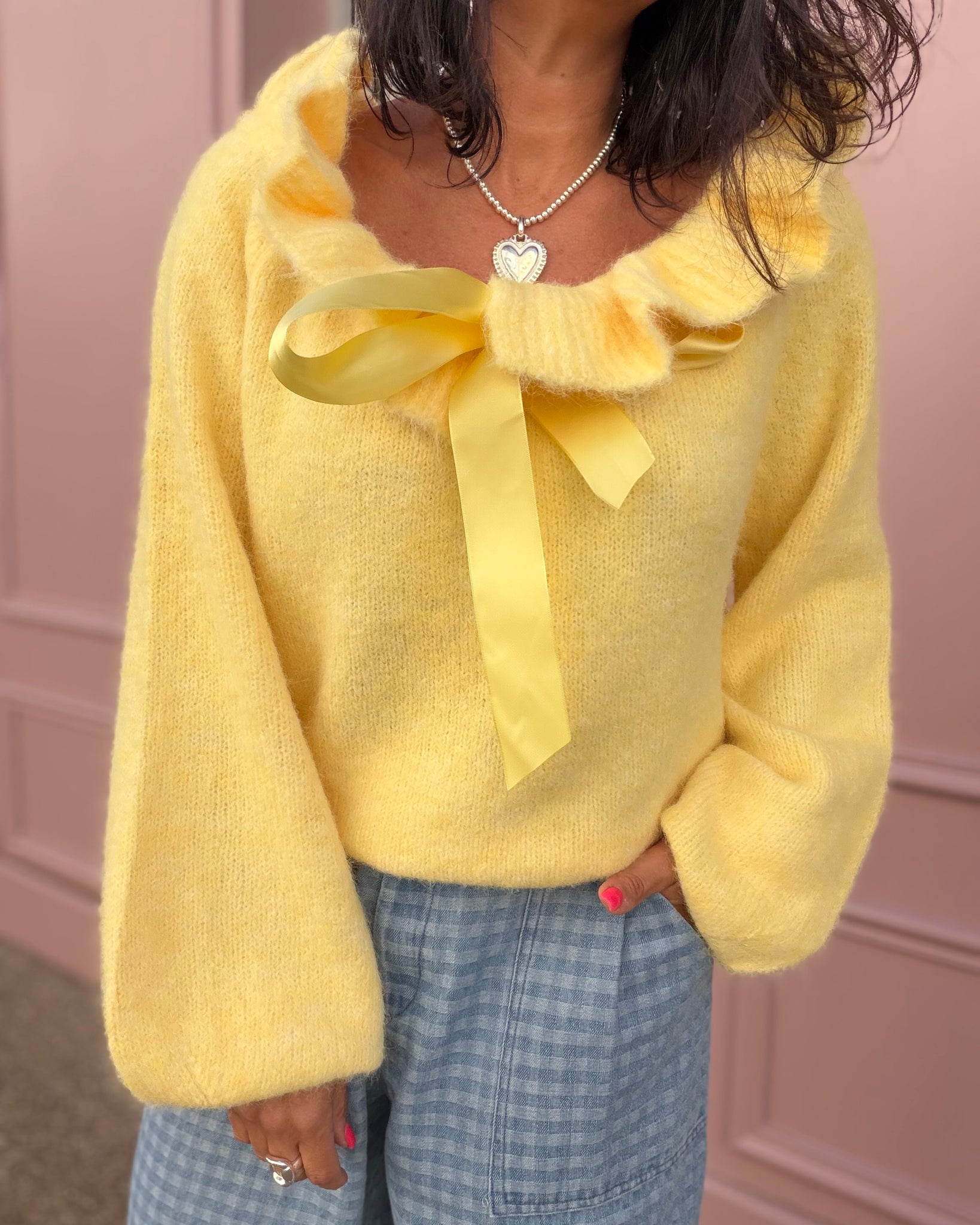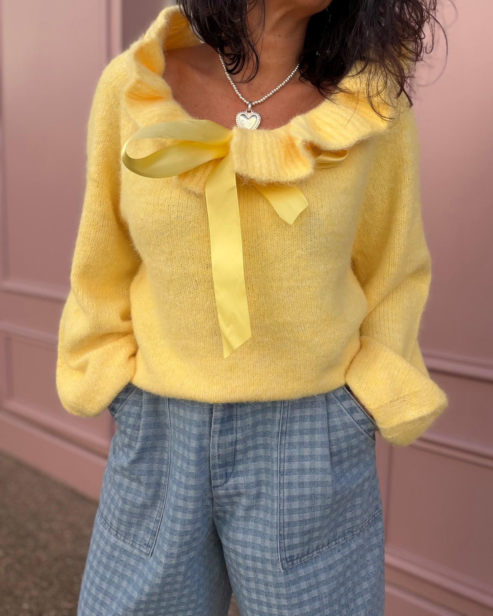 Pull jaune tout doux, lien satin à l’encolure