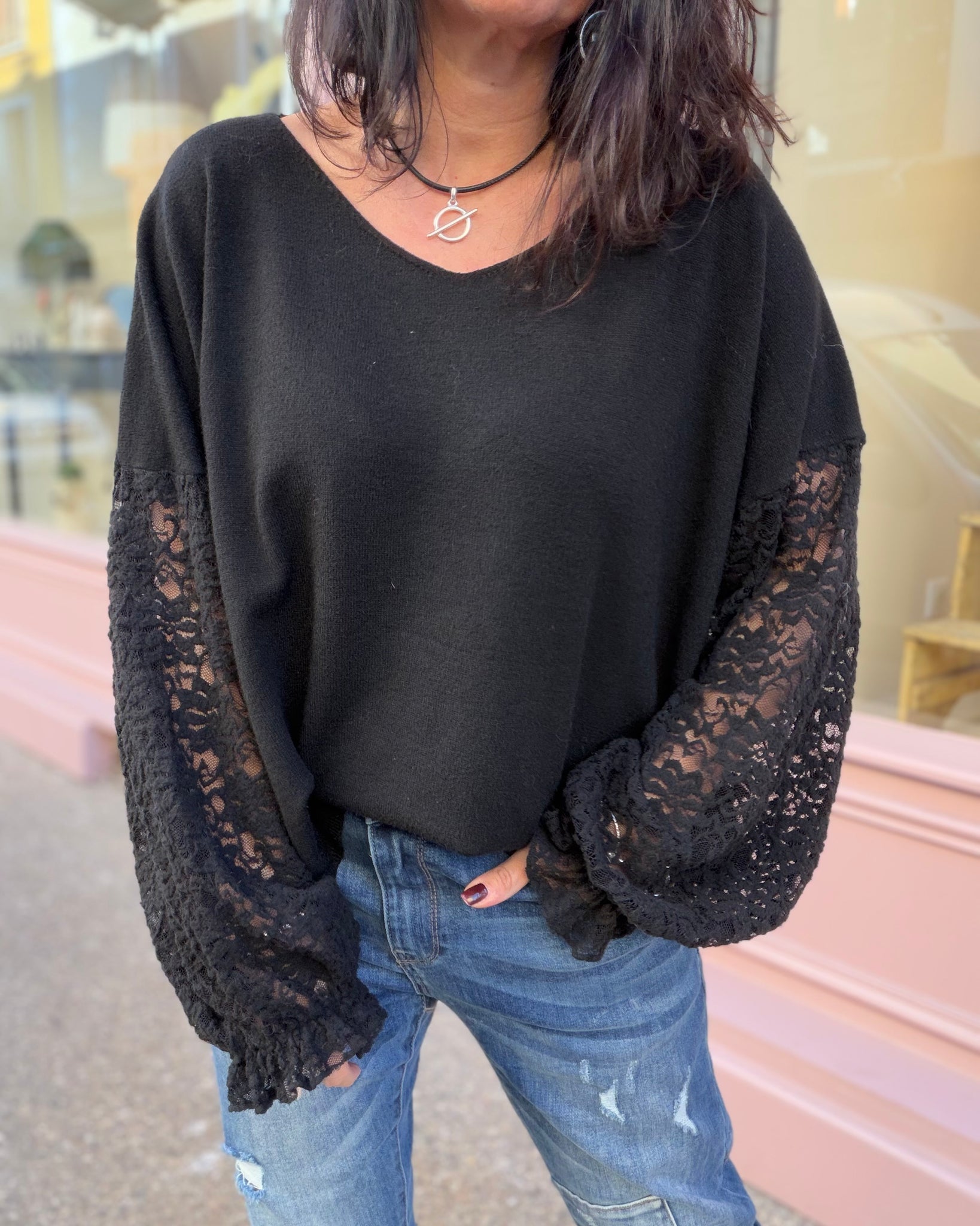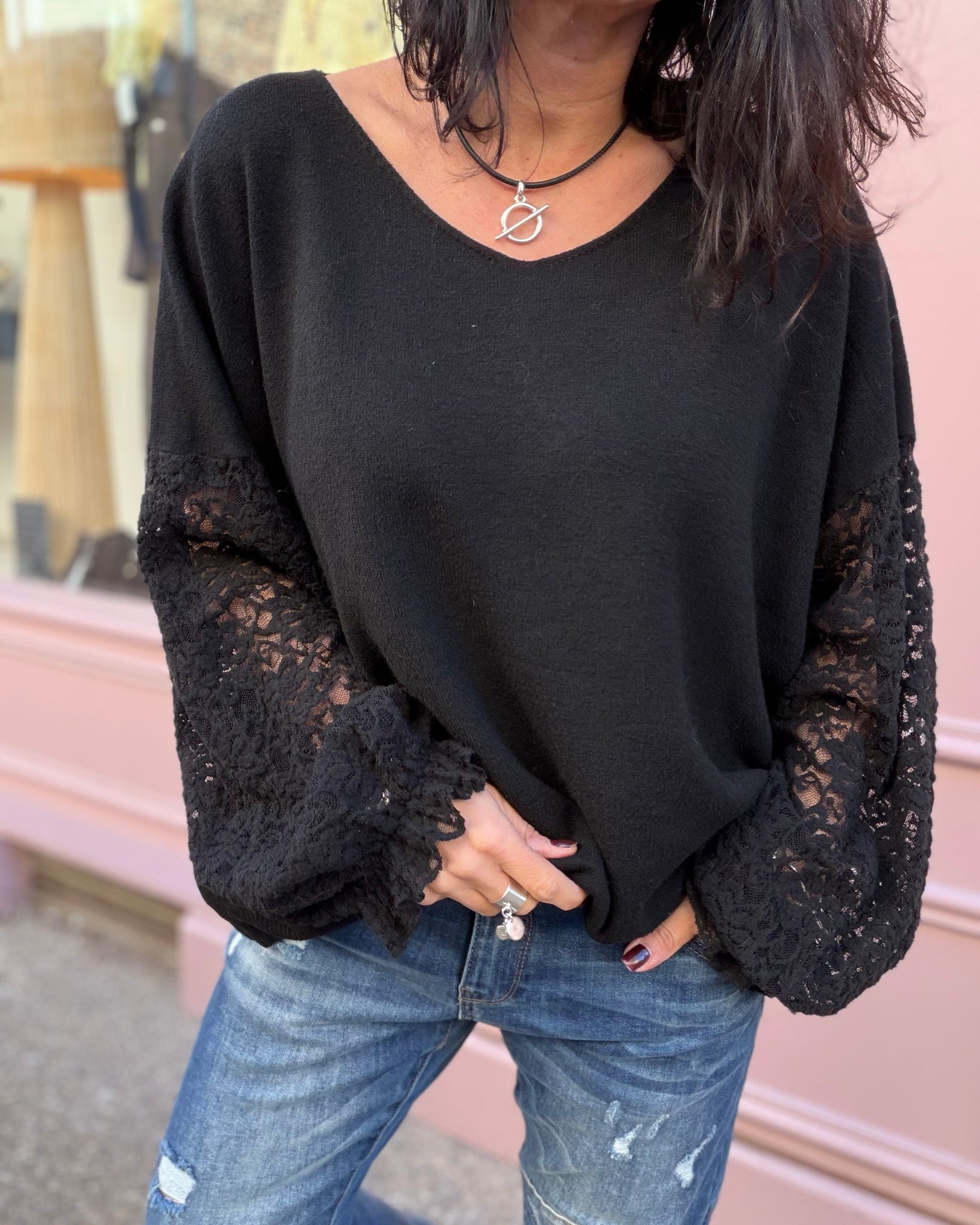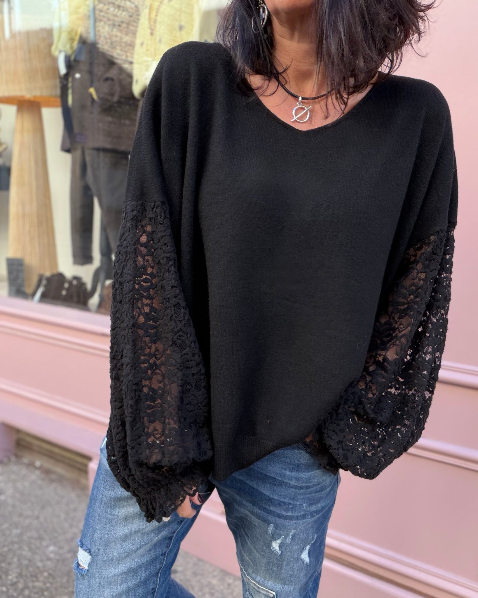 Pull fin, manches dentelle, décolleté V