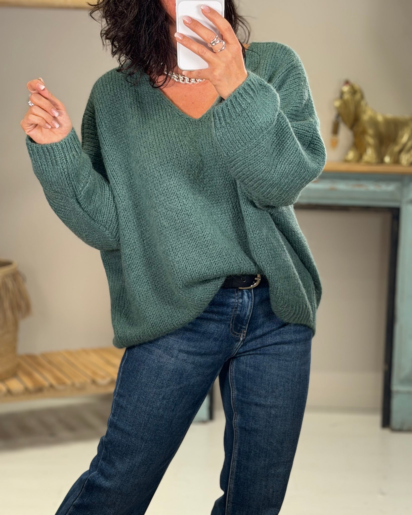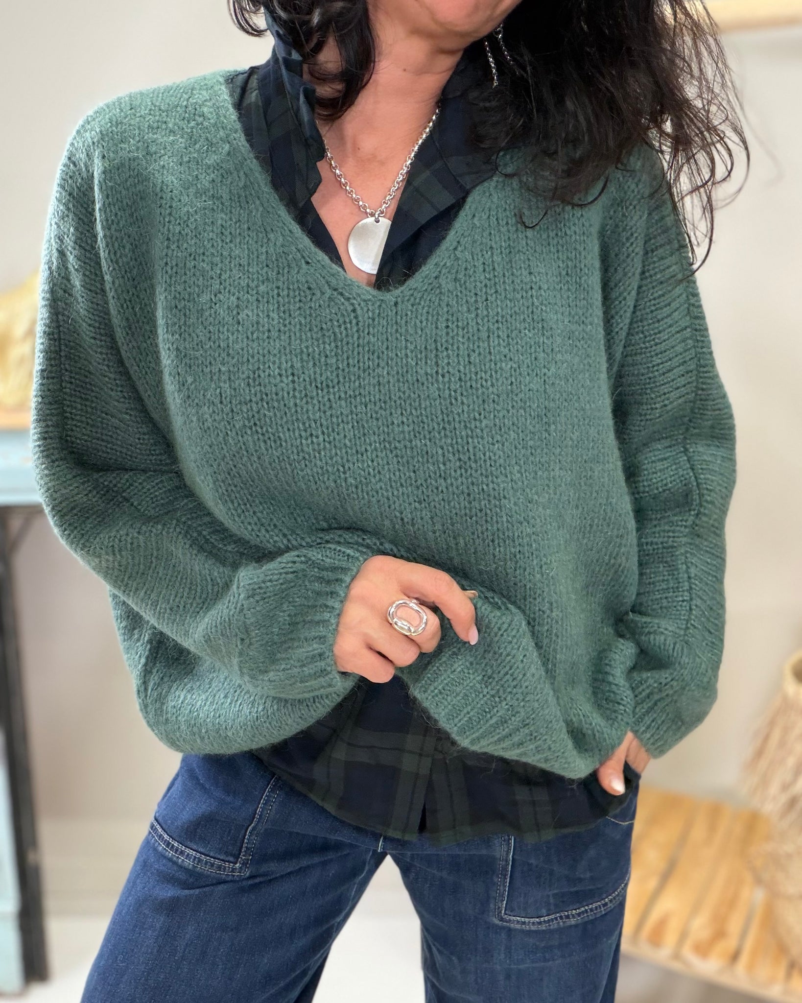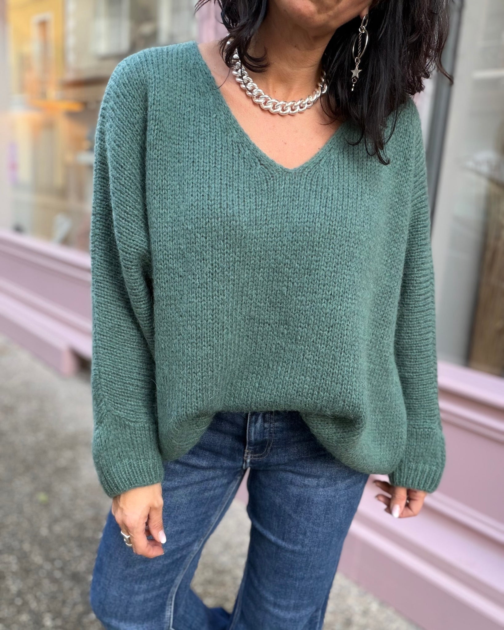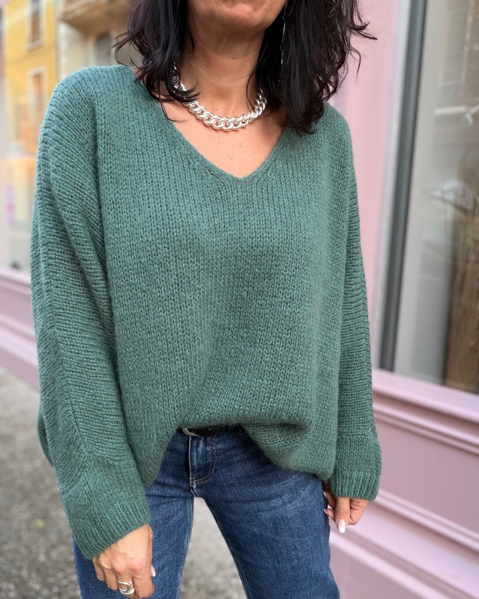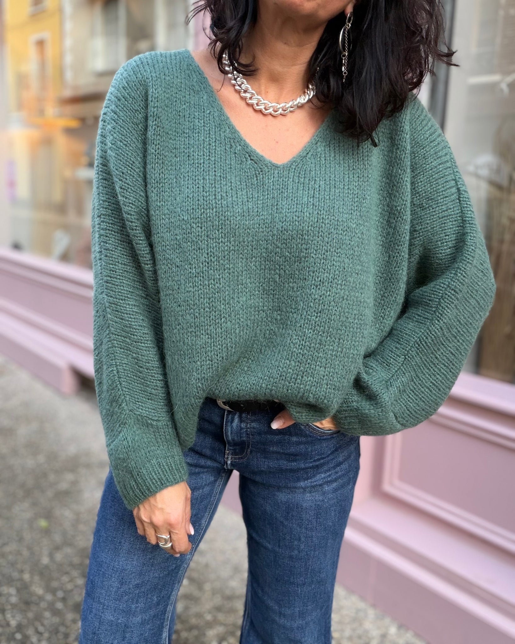 Pull coupe loose, encolure V, manches 3/4