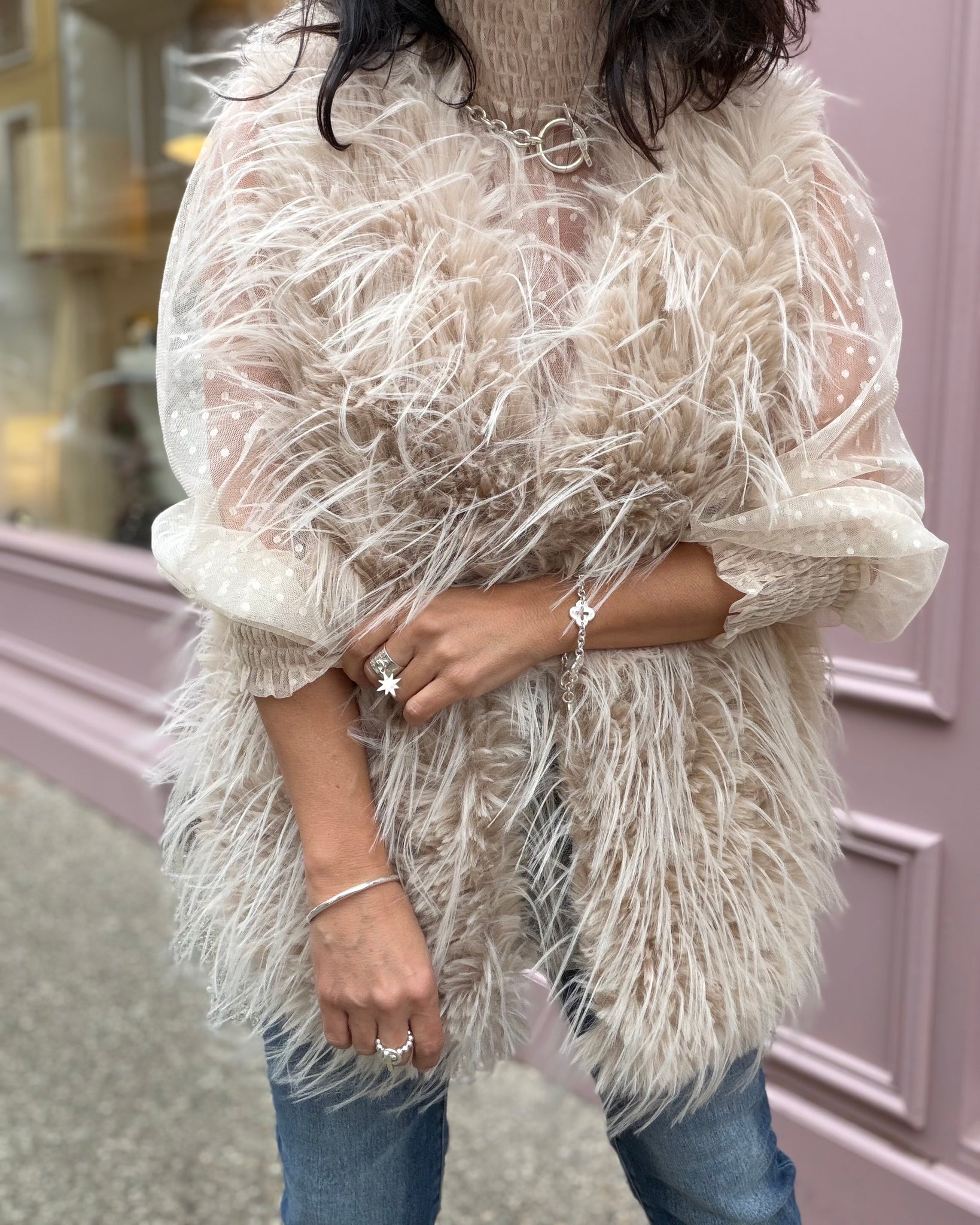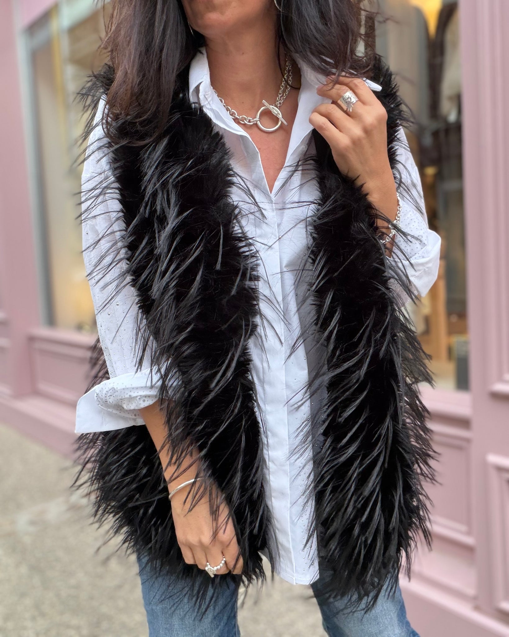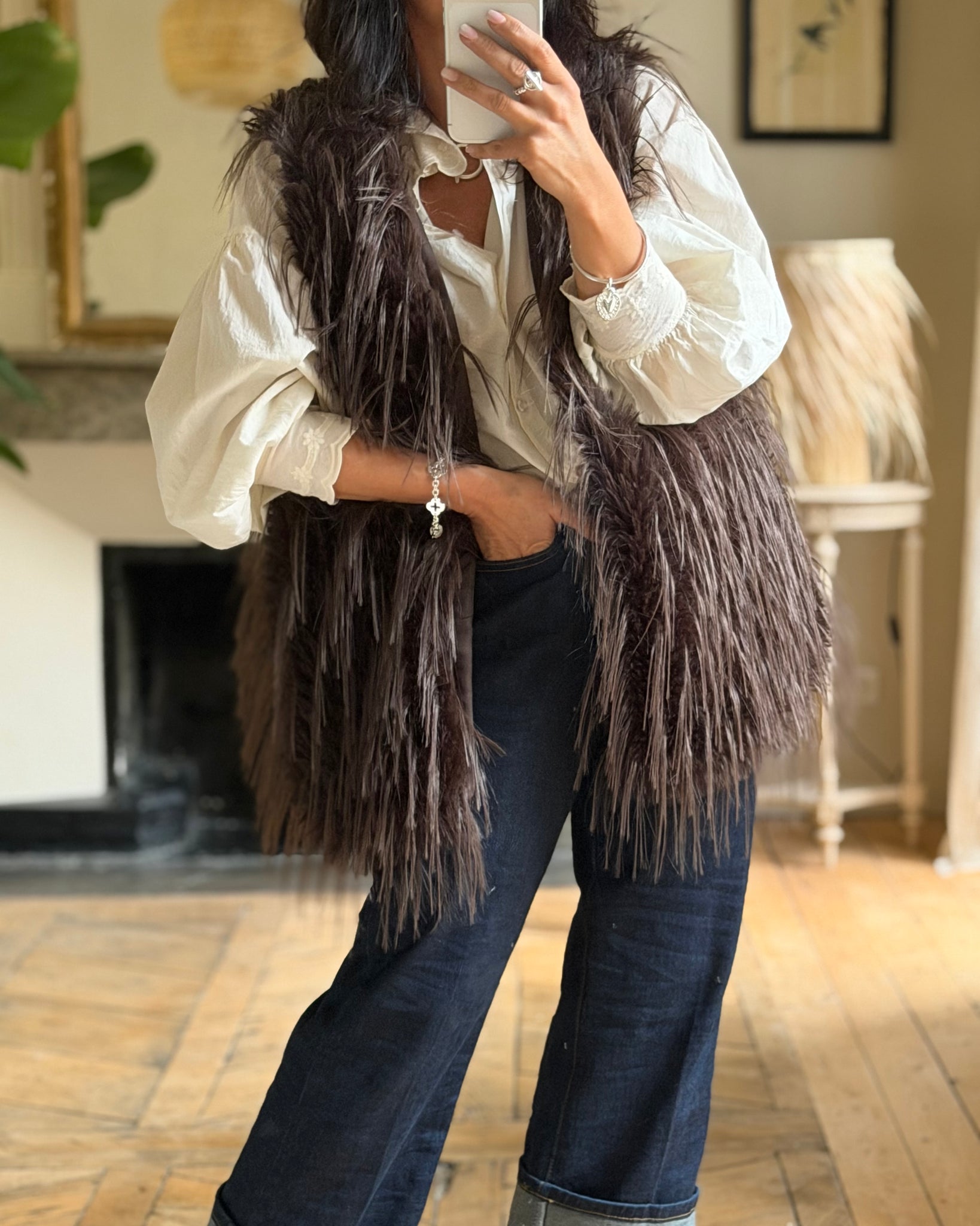 Gilet sans manches, imitation fourrure poils longs, intérieur doublé, fermeture par petit crochet,
