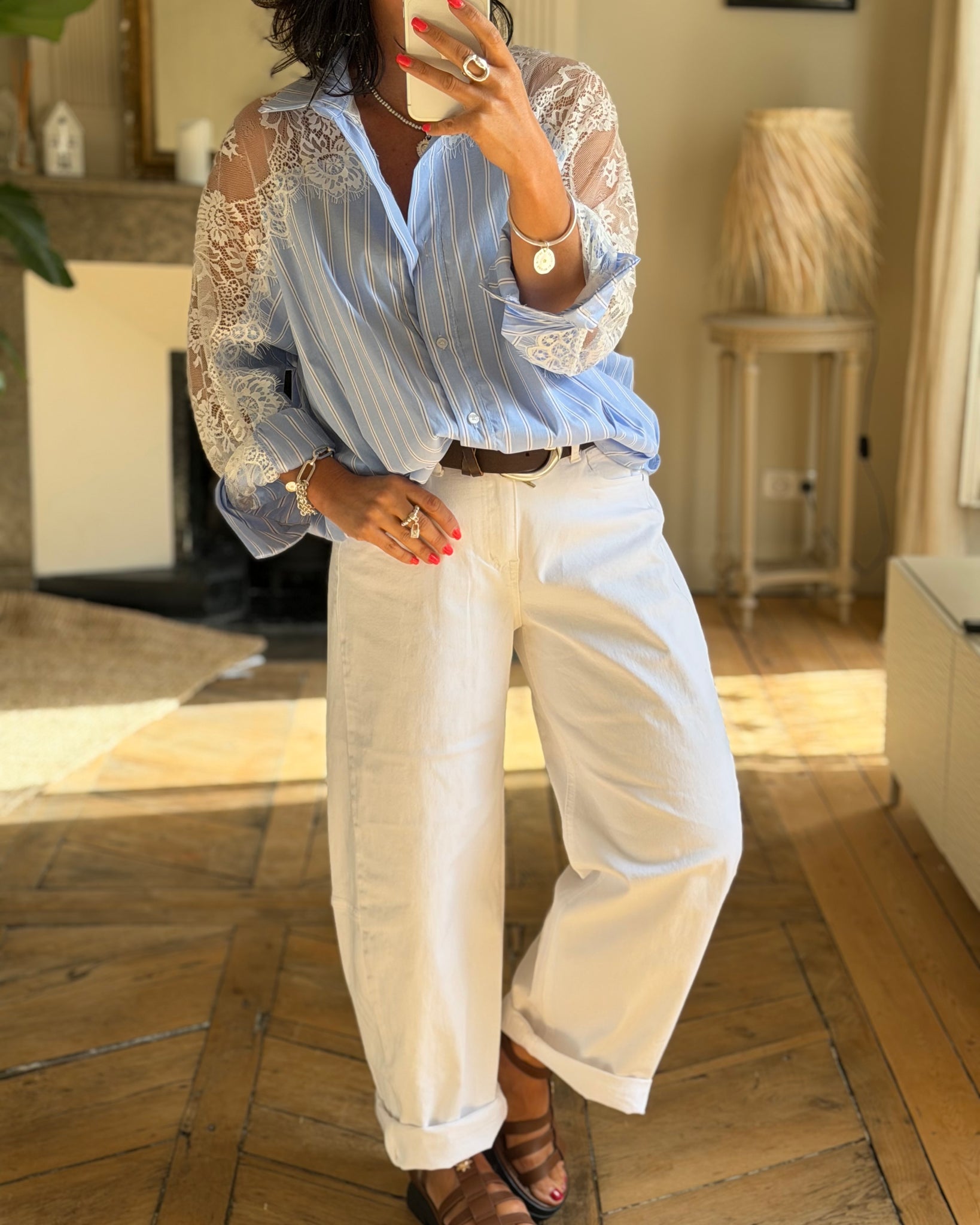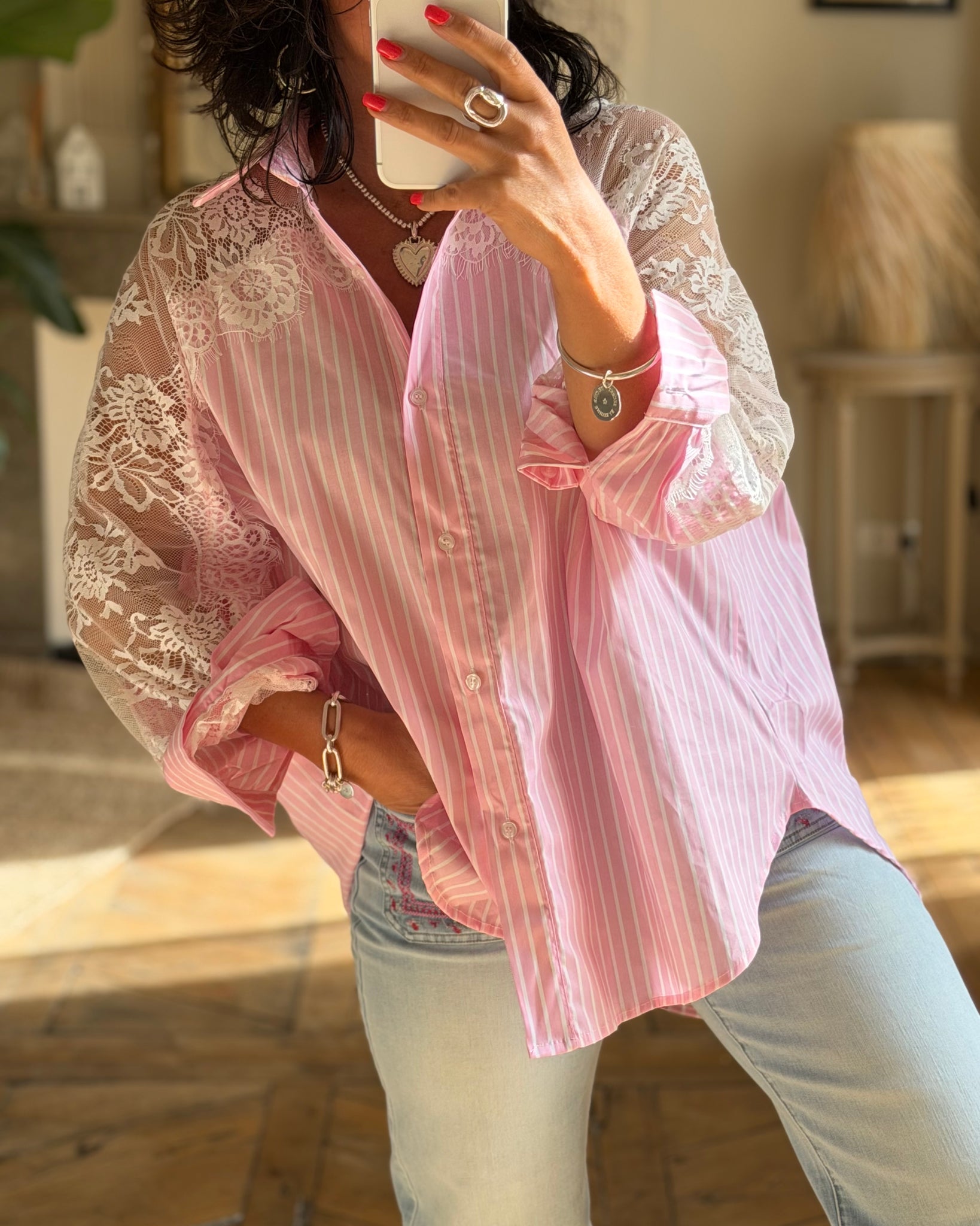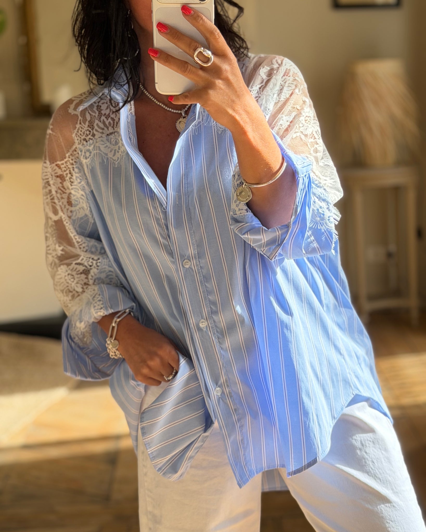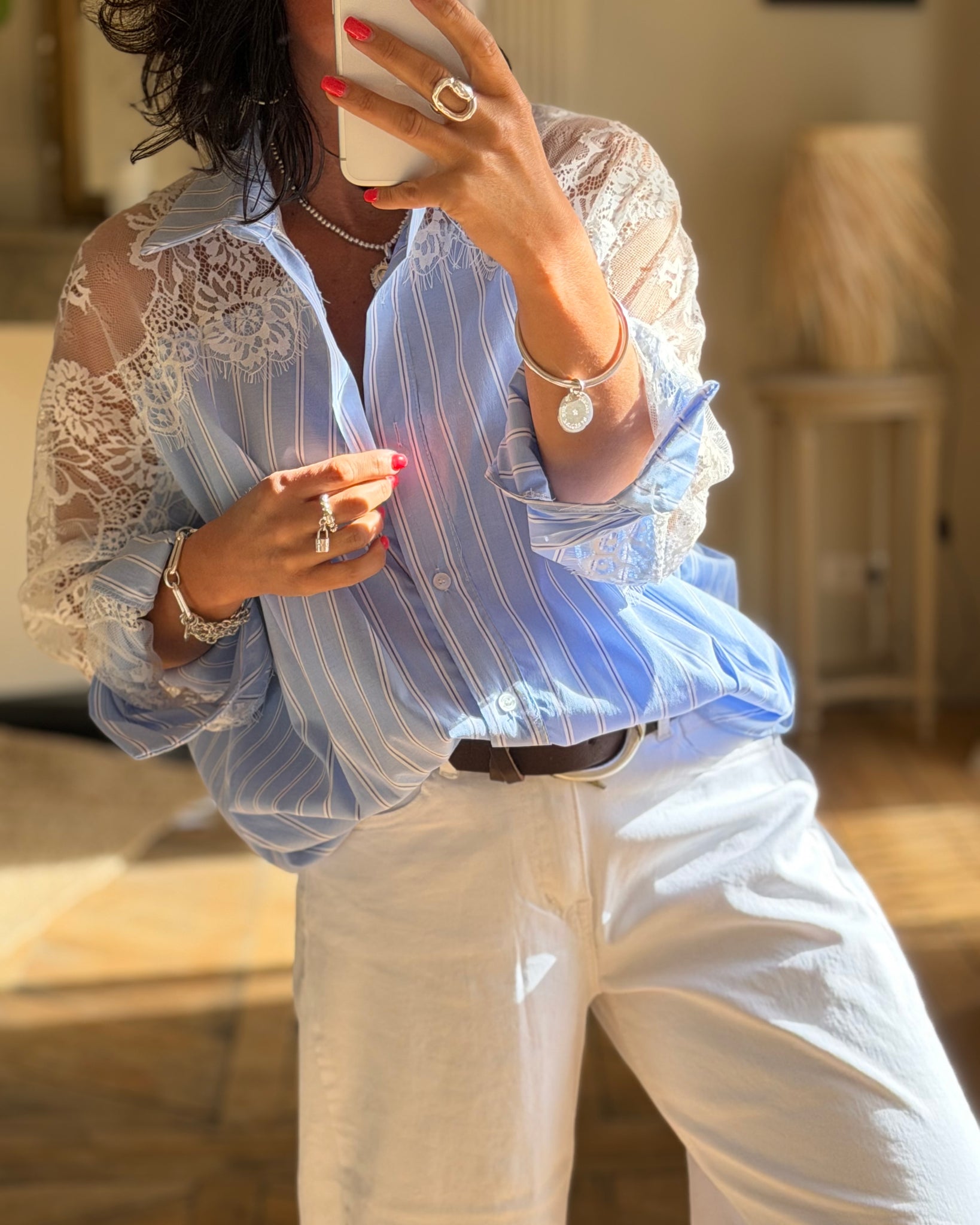 Chemise à rayures, empiècements en dentelle