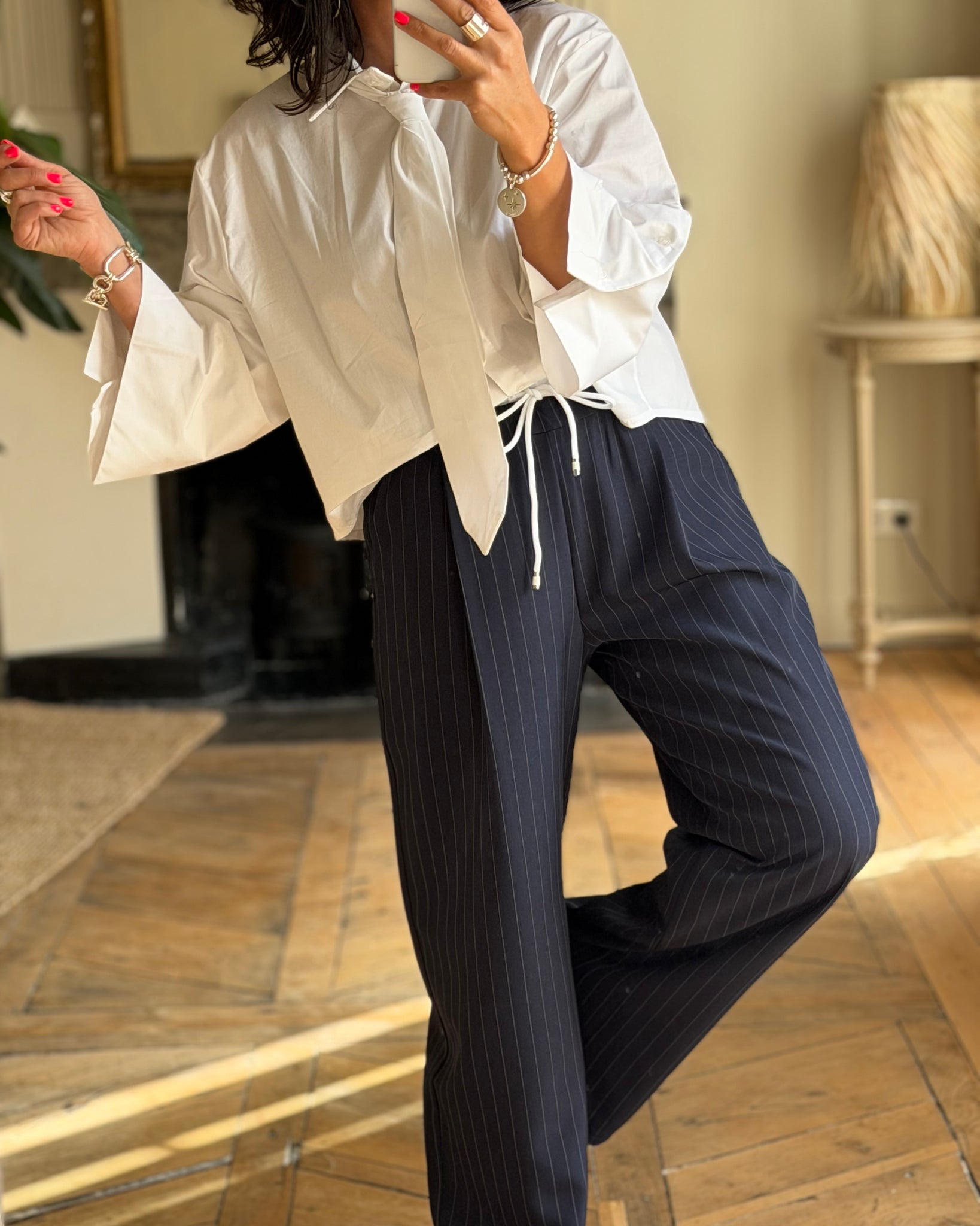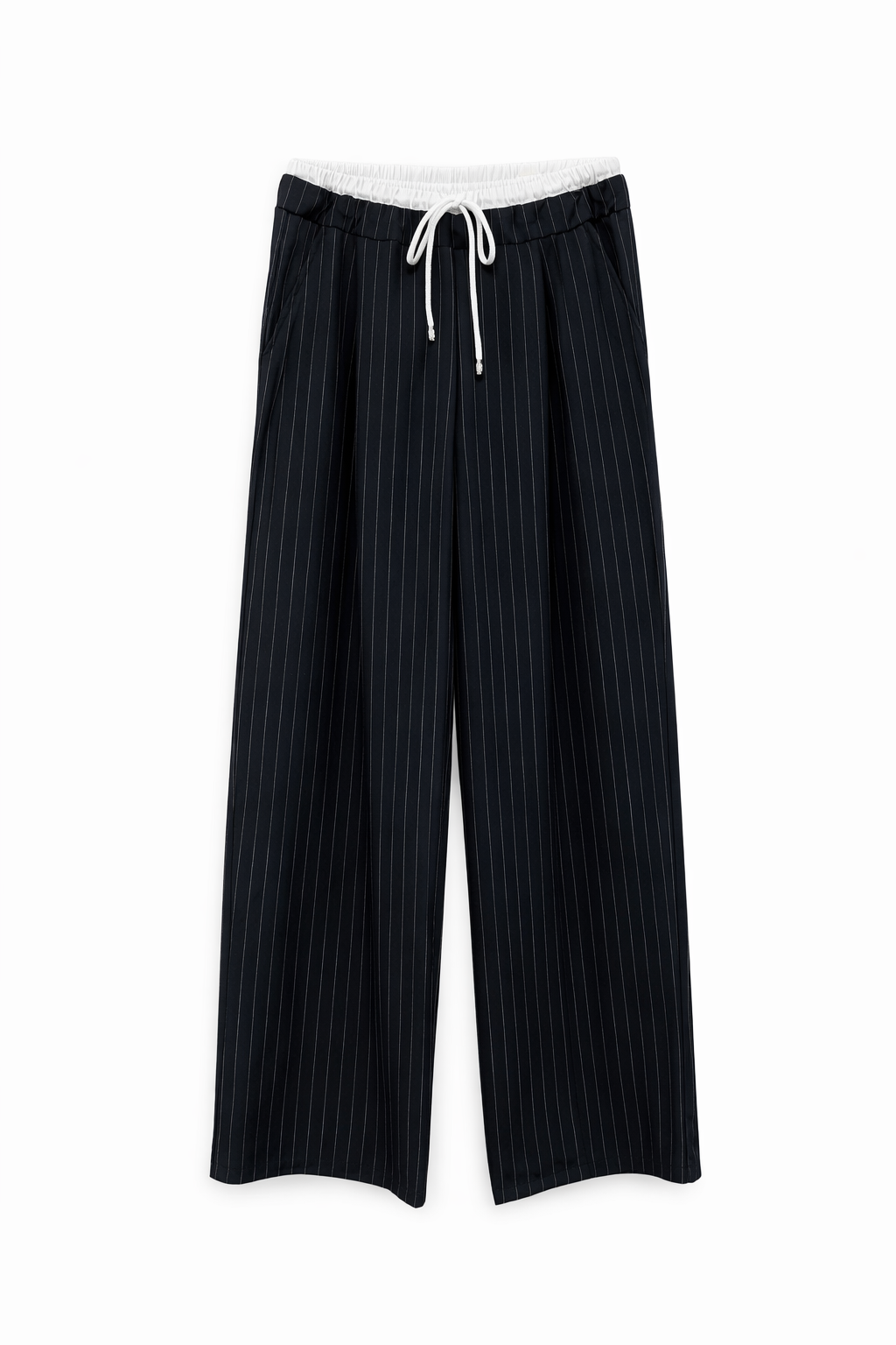 Pantalon large à fines rayures, taille élastique avec cordon