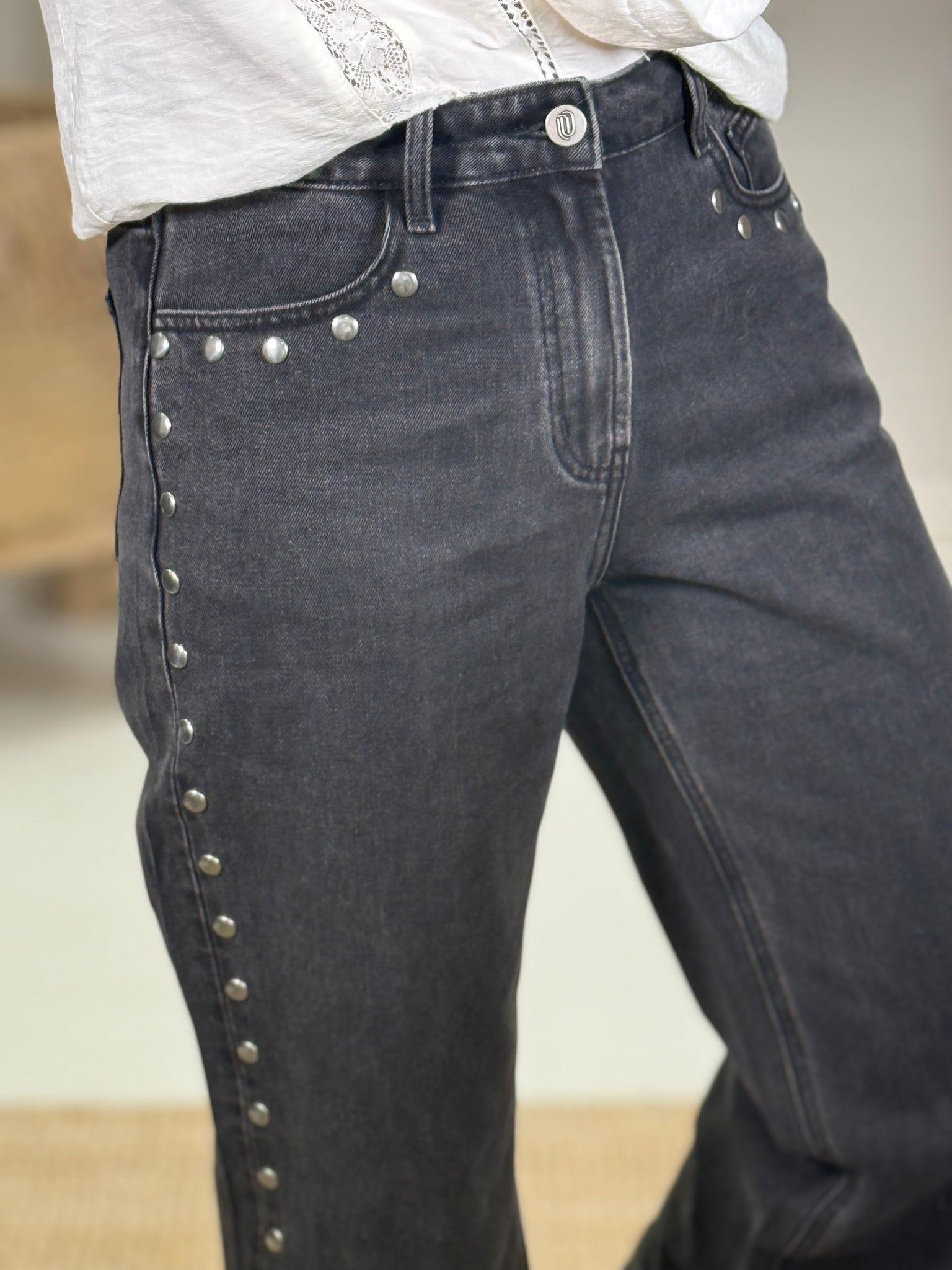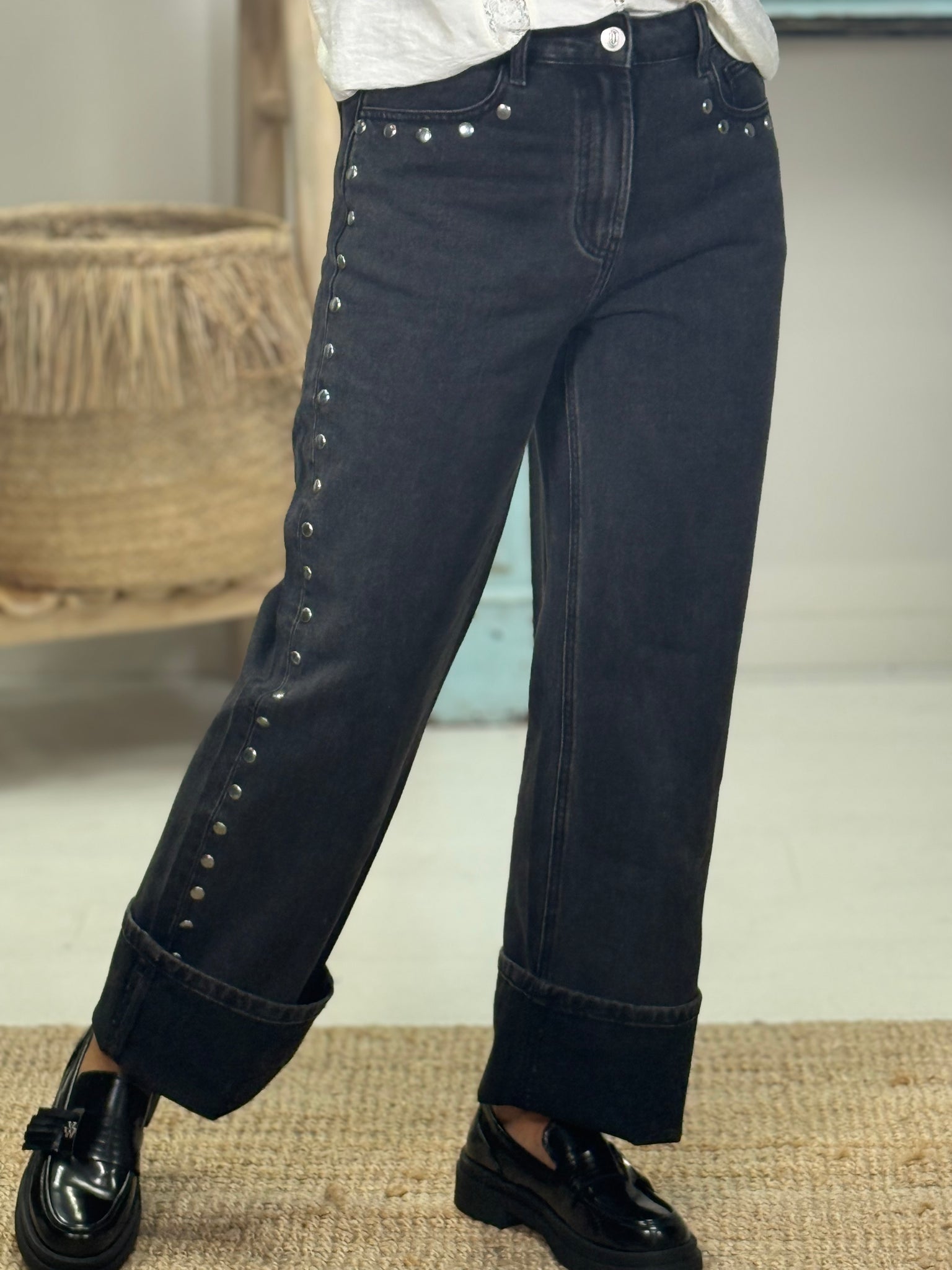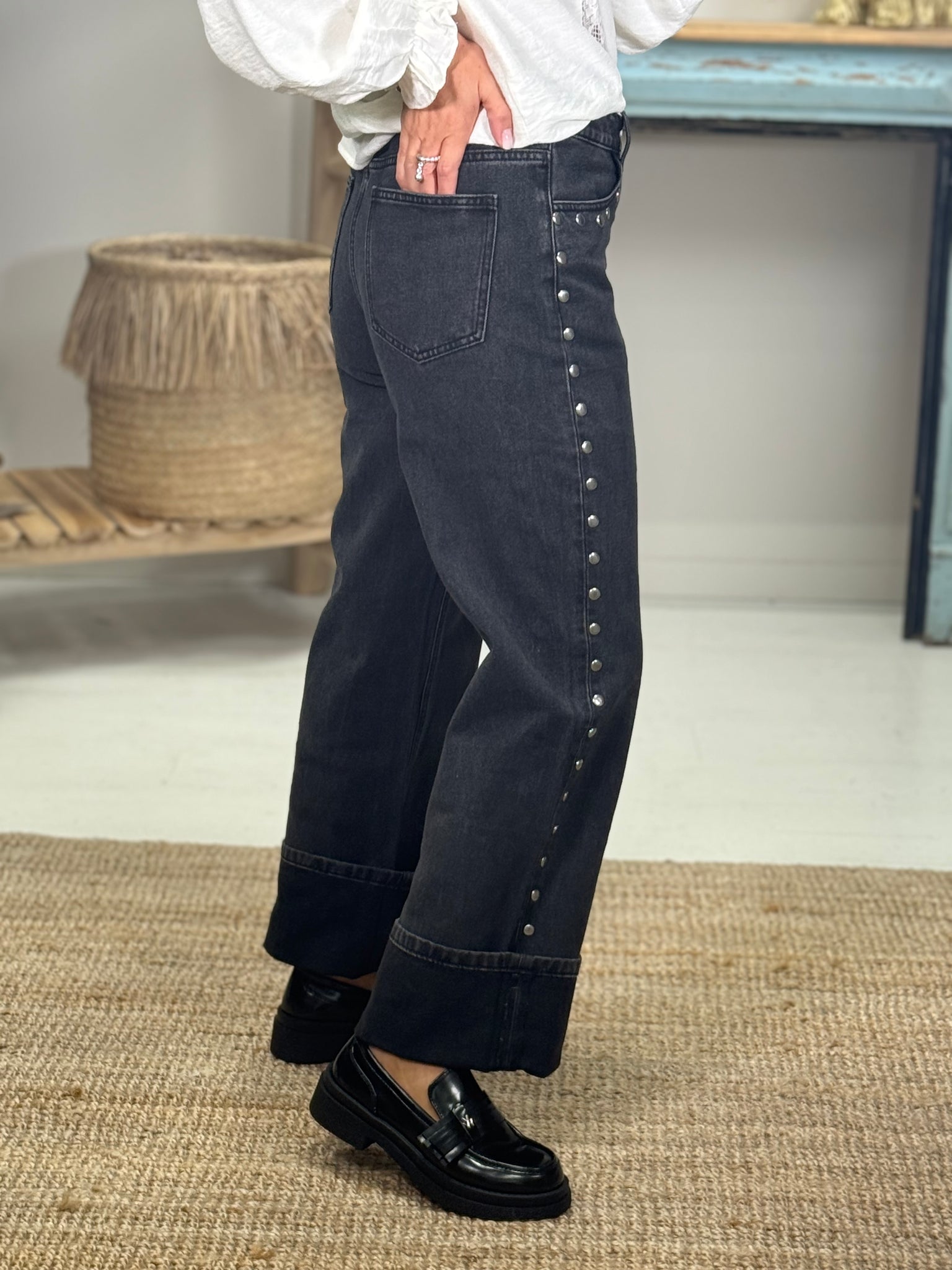 Jean noir délavé, coupe  wide leg, détails cloutés